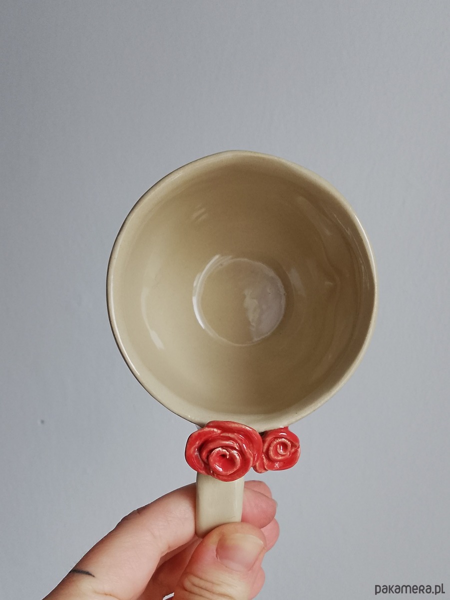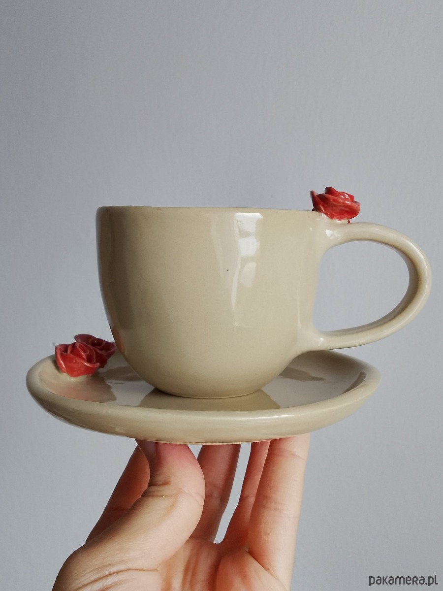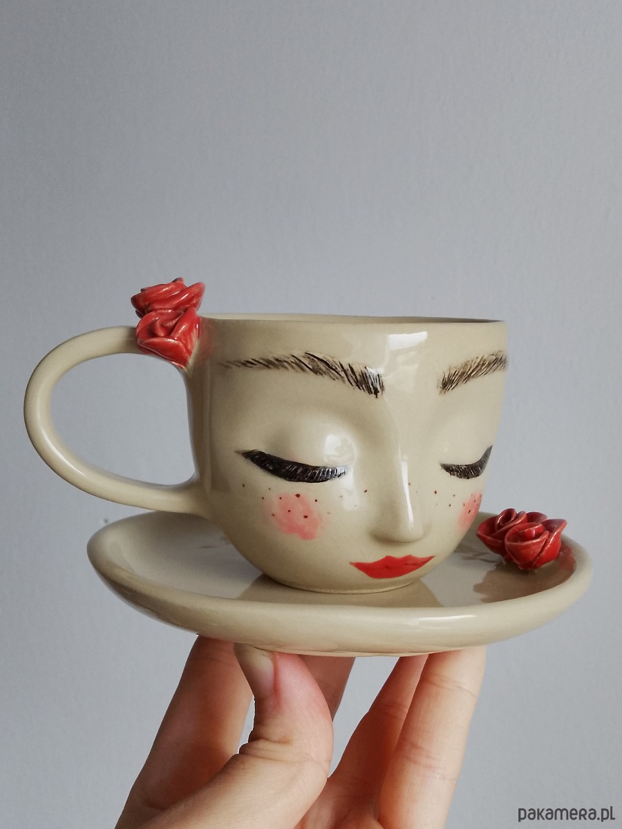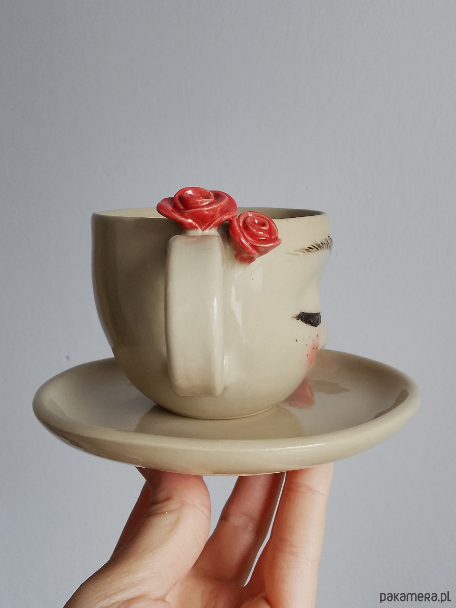 Filiżanka ceramiczna z twarzą o pojemności 200 ml plus spodek z czerwonymi różami.