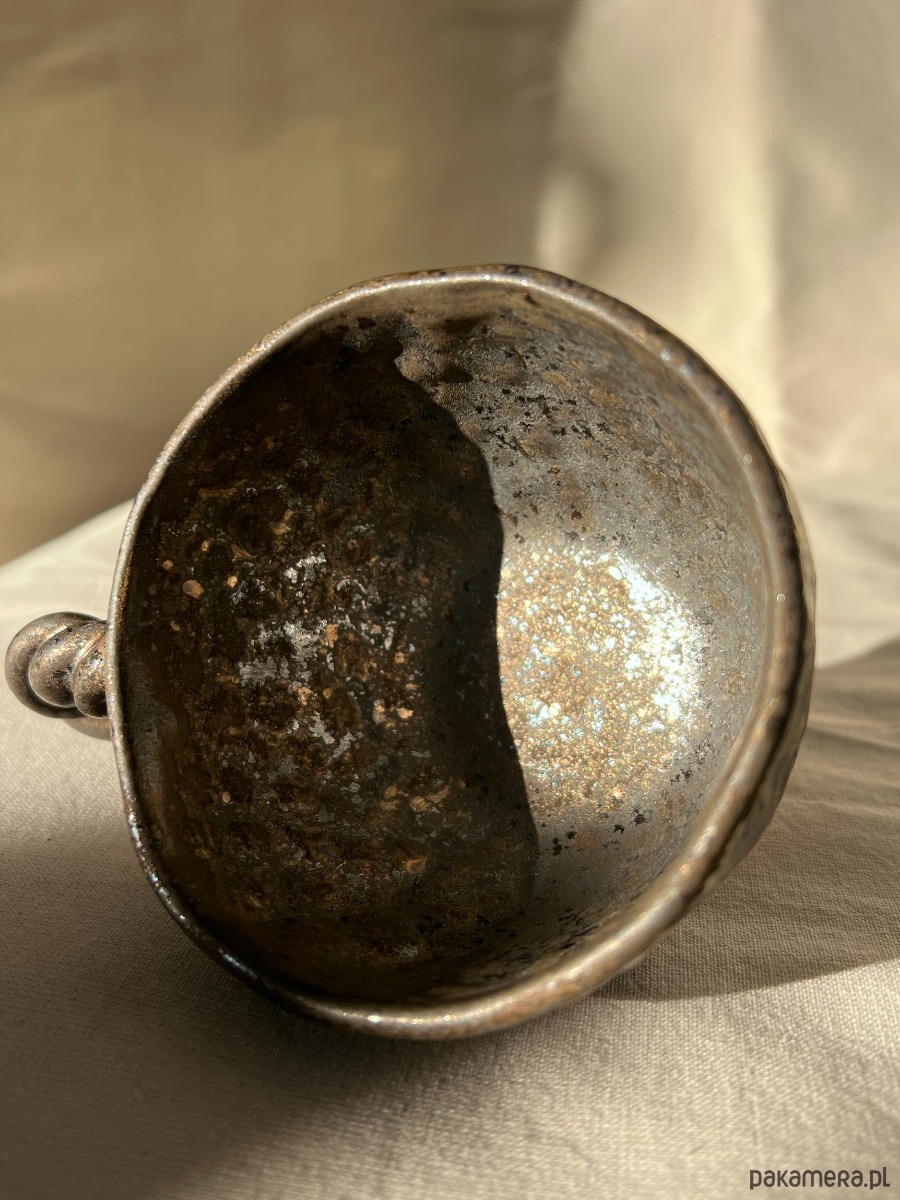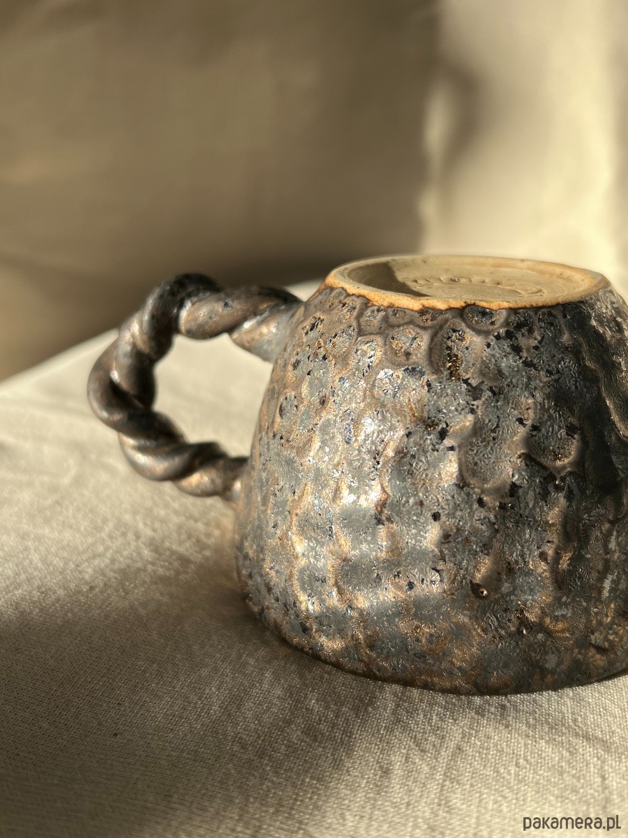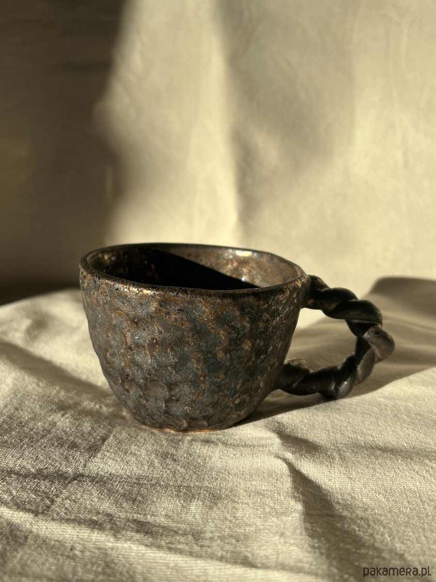Ręcznie wykonana filiżanka z gliny, toczona na kole garncarskim. Pokryta szkliwem w kolorze złotym, pokryta delikatną fakturą. Uszko zakręcone, które ułatwia trzymanie