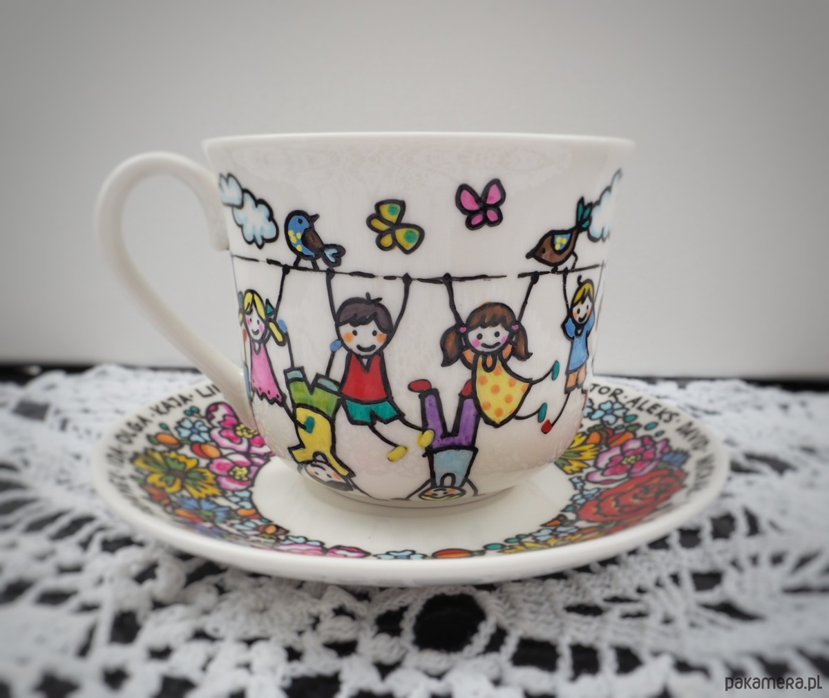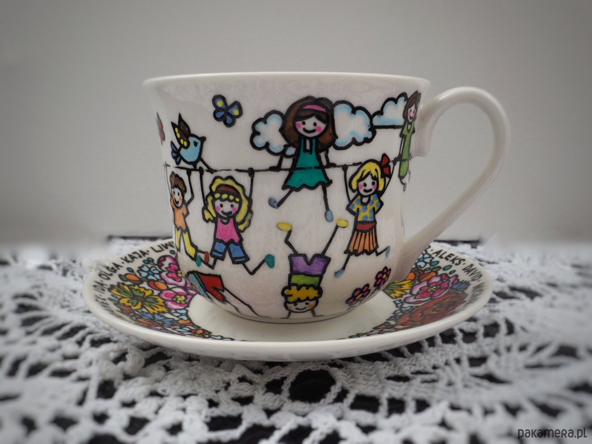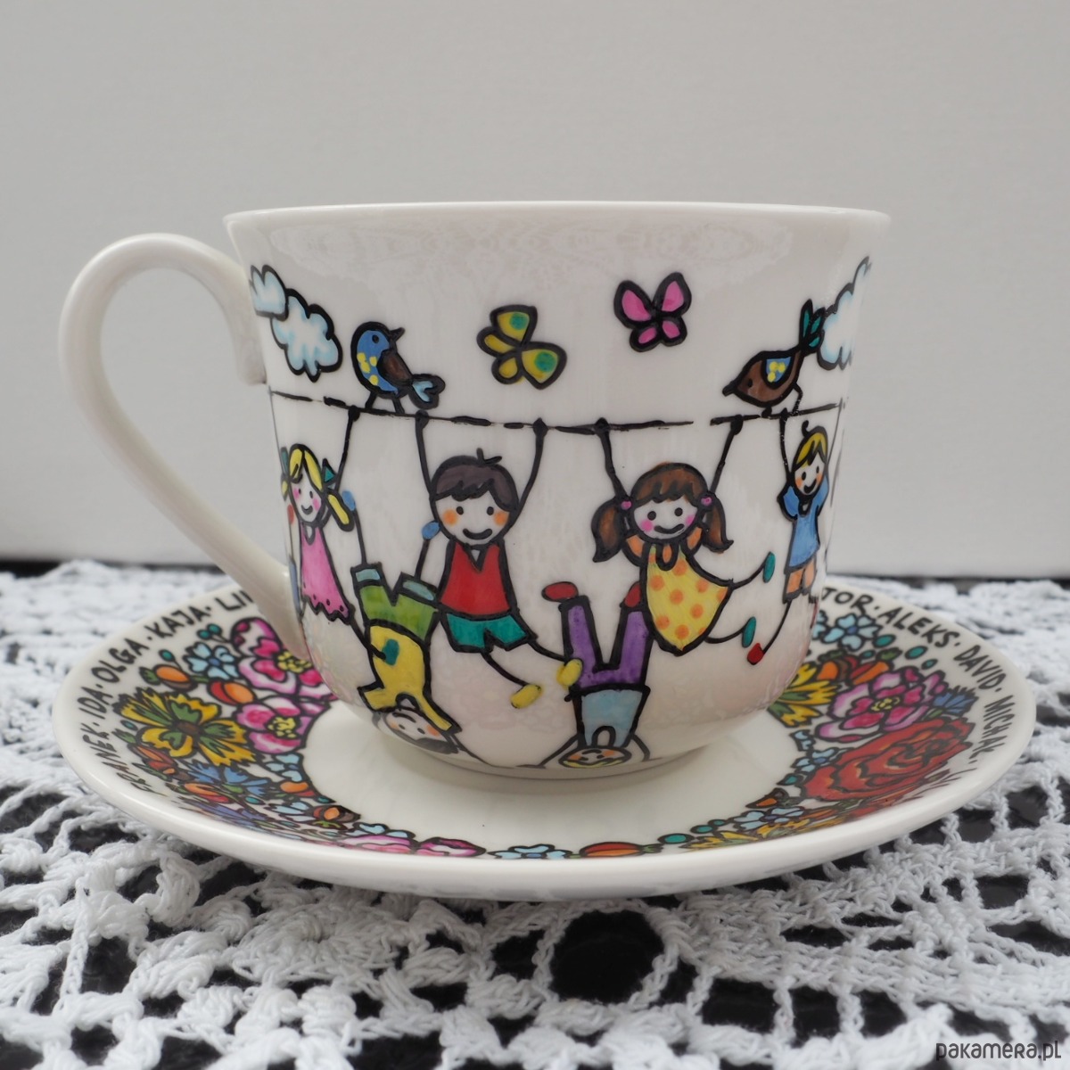 Ręcznie malowana porcelanowa duża filiżanka ze spodkiem. Wyjątkowy upominek od uczniów - osobisty, wykonany ręcznie, dopasowany do gustu.