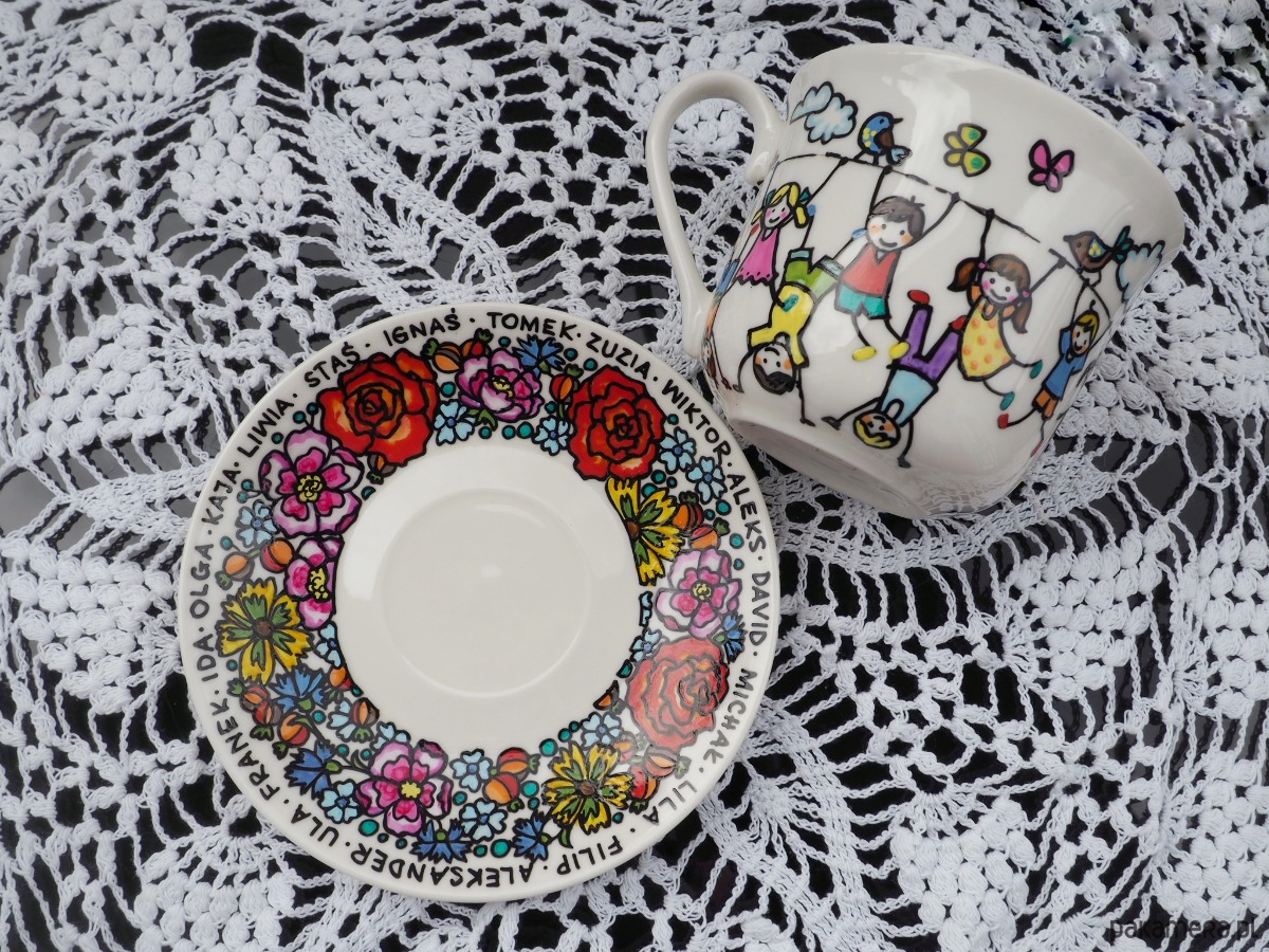 Proponowany wzór to bawiące się dzieci na filiżance oraz kwiaty i imiona dzieci na spodeczku. Przy odpowiednio wczesnym zamówieniu możliwe jest indywidualne ustalenie wzoru / napisu na zestawie.