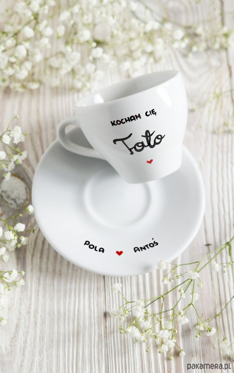 Filiżanka “Kocham Cię tato” z imieniem dziecka na spodeczku – bo dobrze mieć wszystkie swoje dzieci pod ręką.