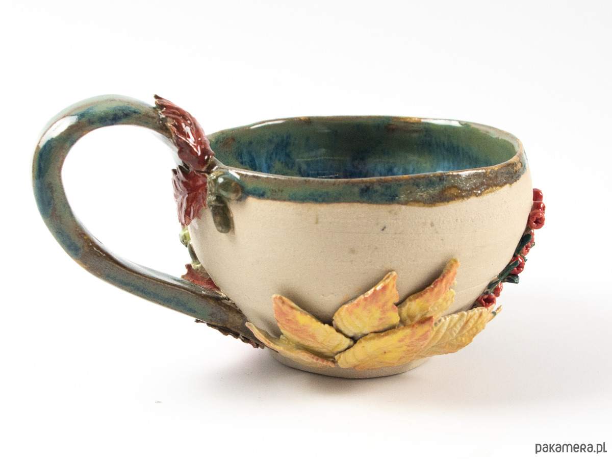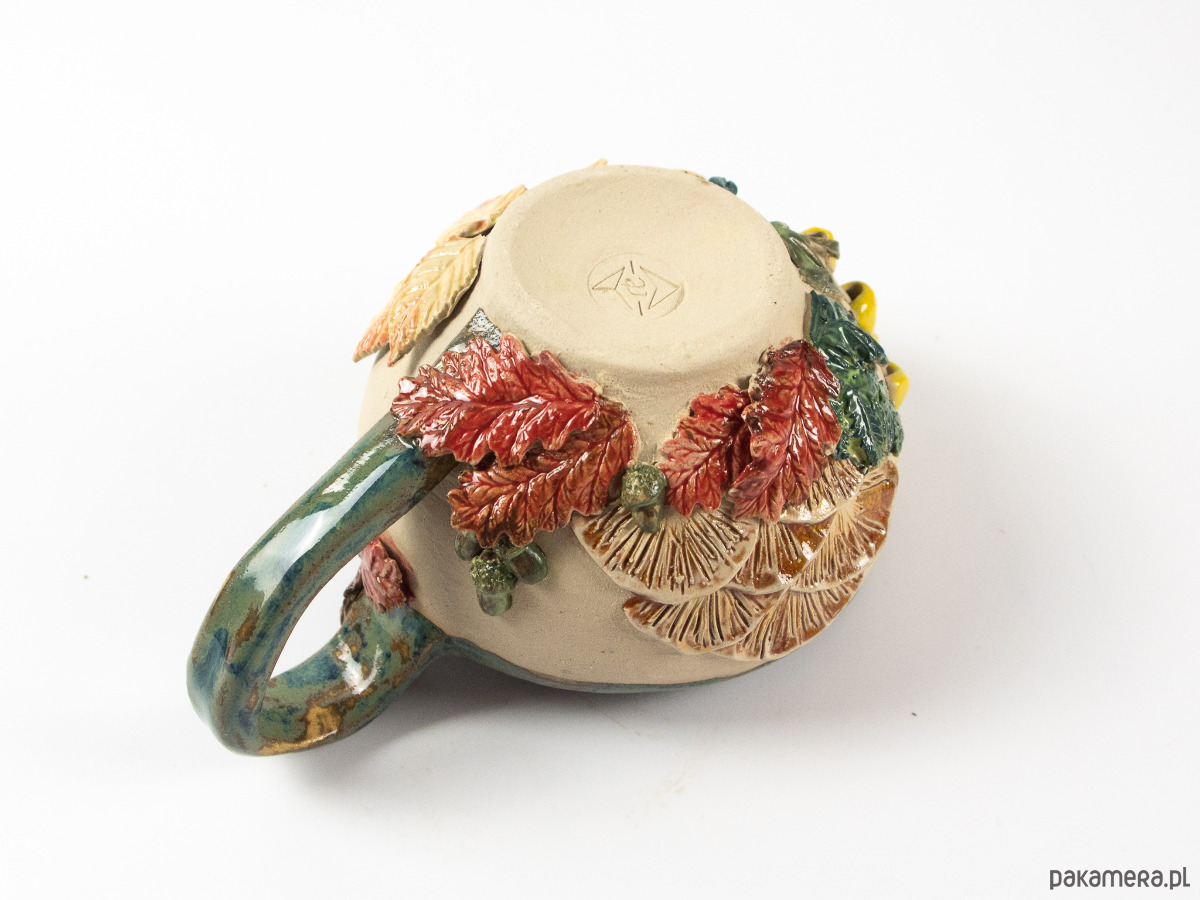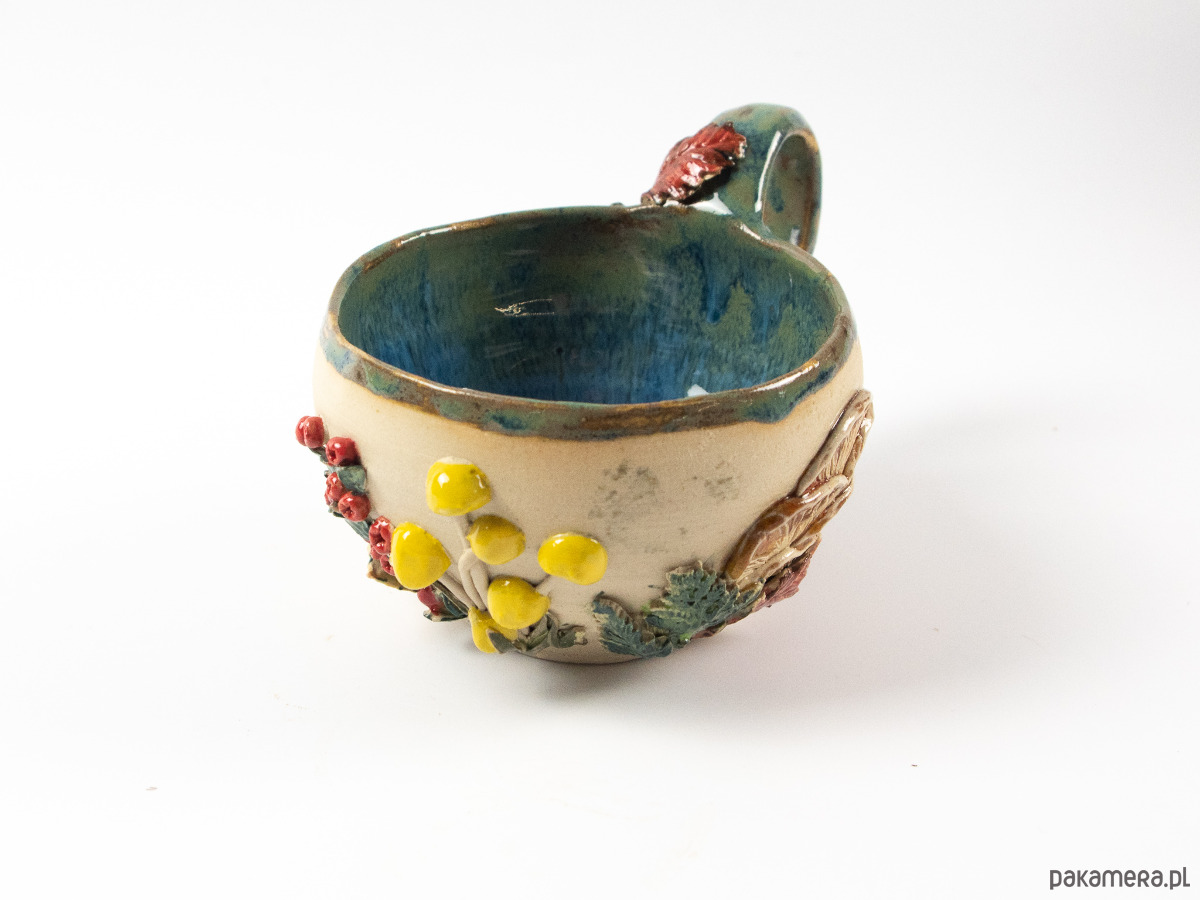 Ręcznie wykonana filiżanka zdobiona motywami jesiennego lasu - kolorowymi liśćmi, grzybami i żołędziami. Wnętrze szkliwione na niebiesko-zielony kolor, z zewnątrz surowa glina będąca tłem dla dekoracji.