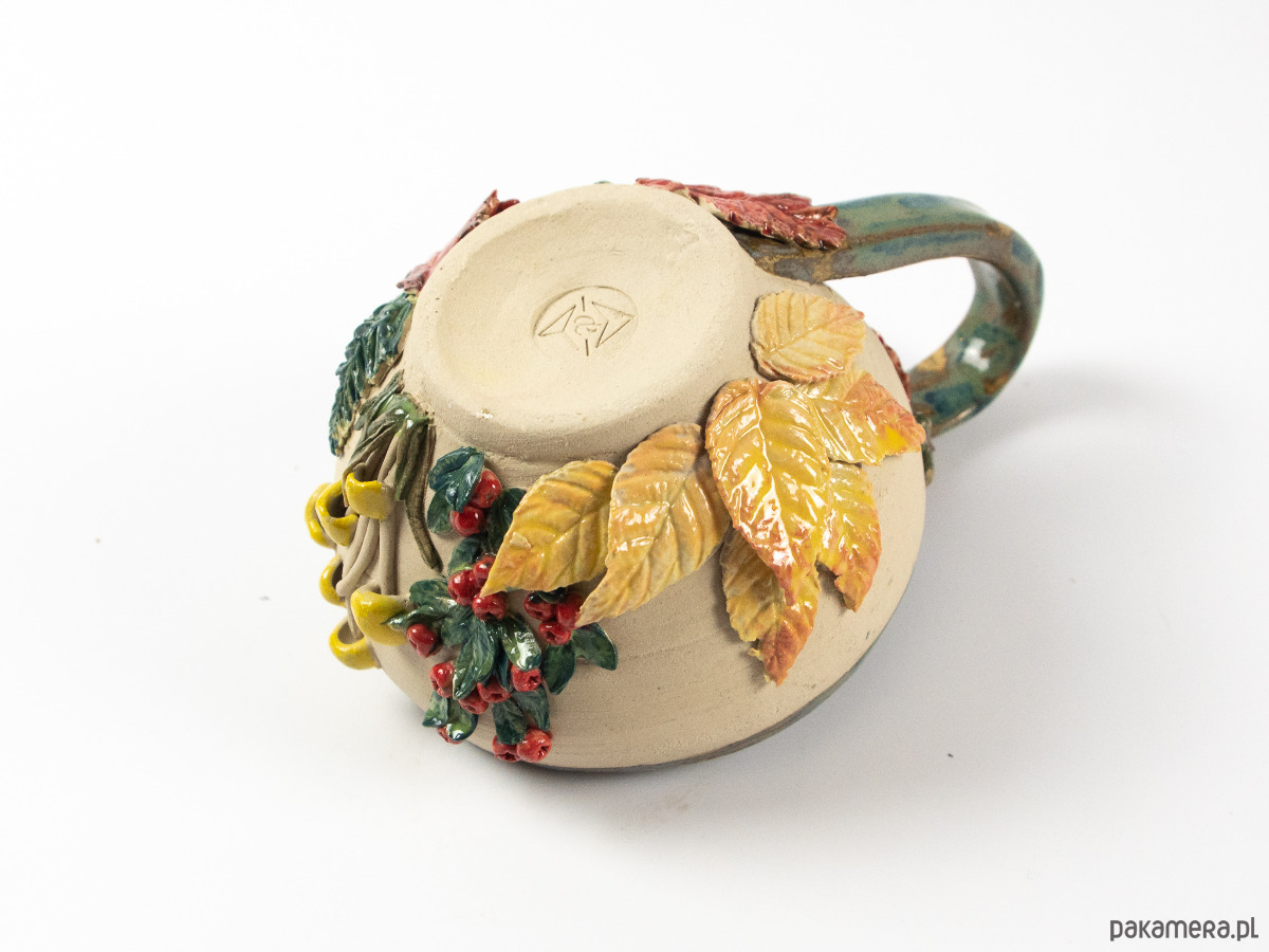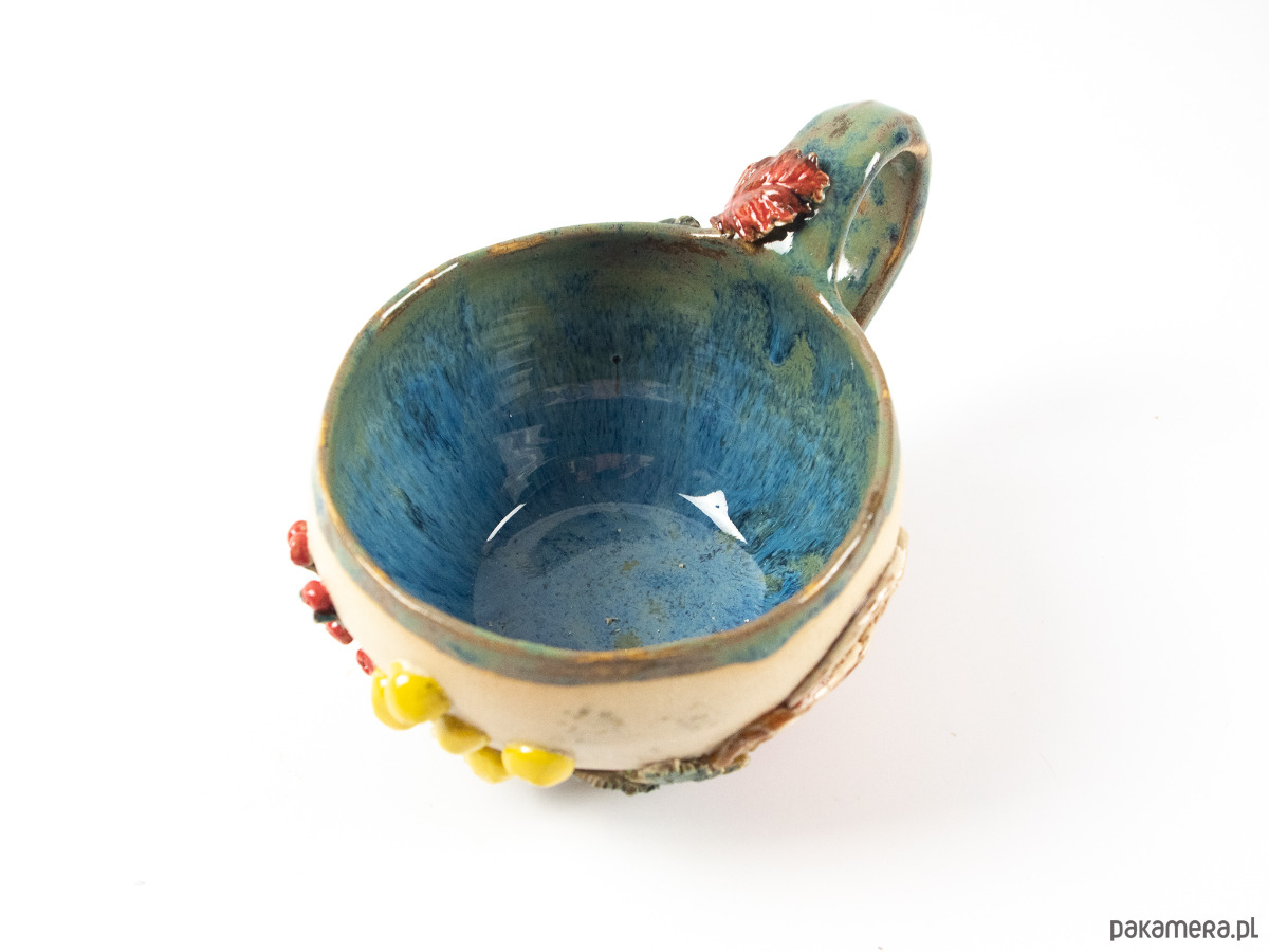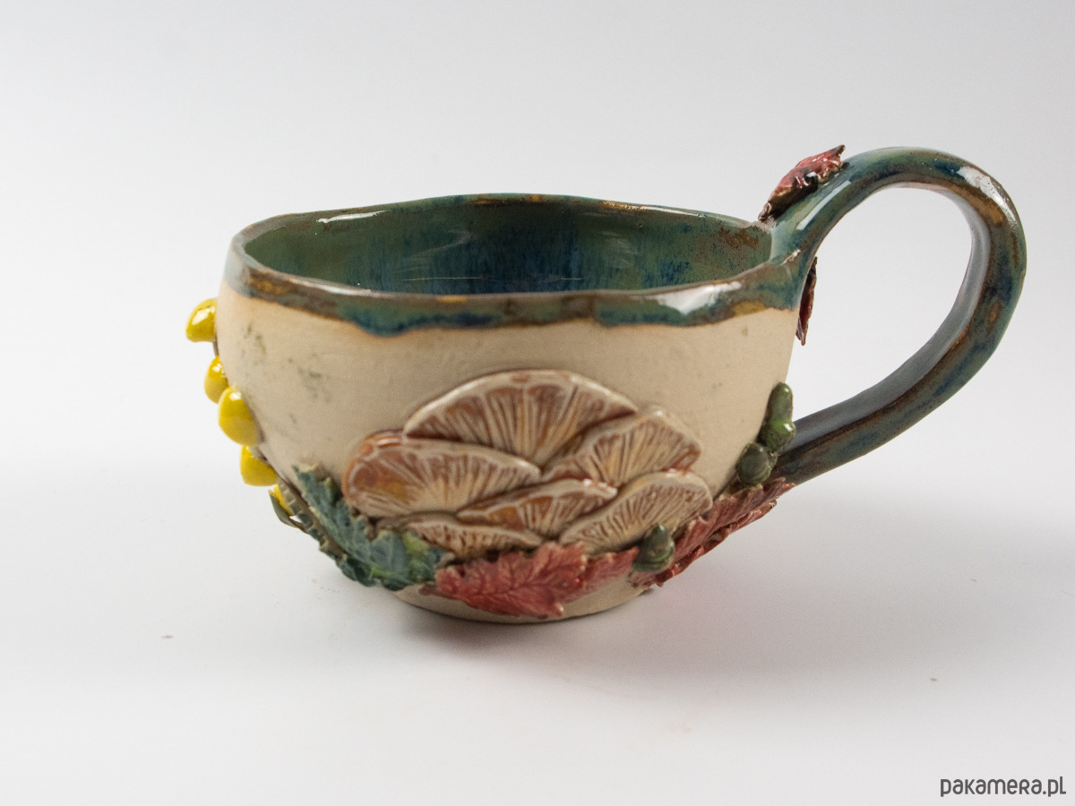Ręcznie wykonana filiżanka zdobiona motywami jesiennego lasu - kolorowymi liśćmi, grzybami i żołędziami. Wnętrze szkliwione na niebiesko-zielony kolor, z zewnątrz surowa glina będąca tłem dla dekoracji.