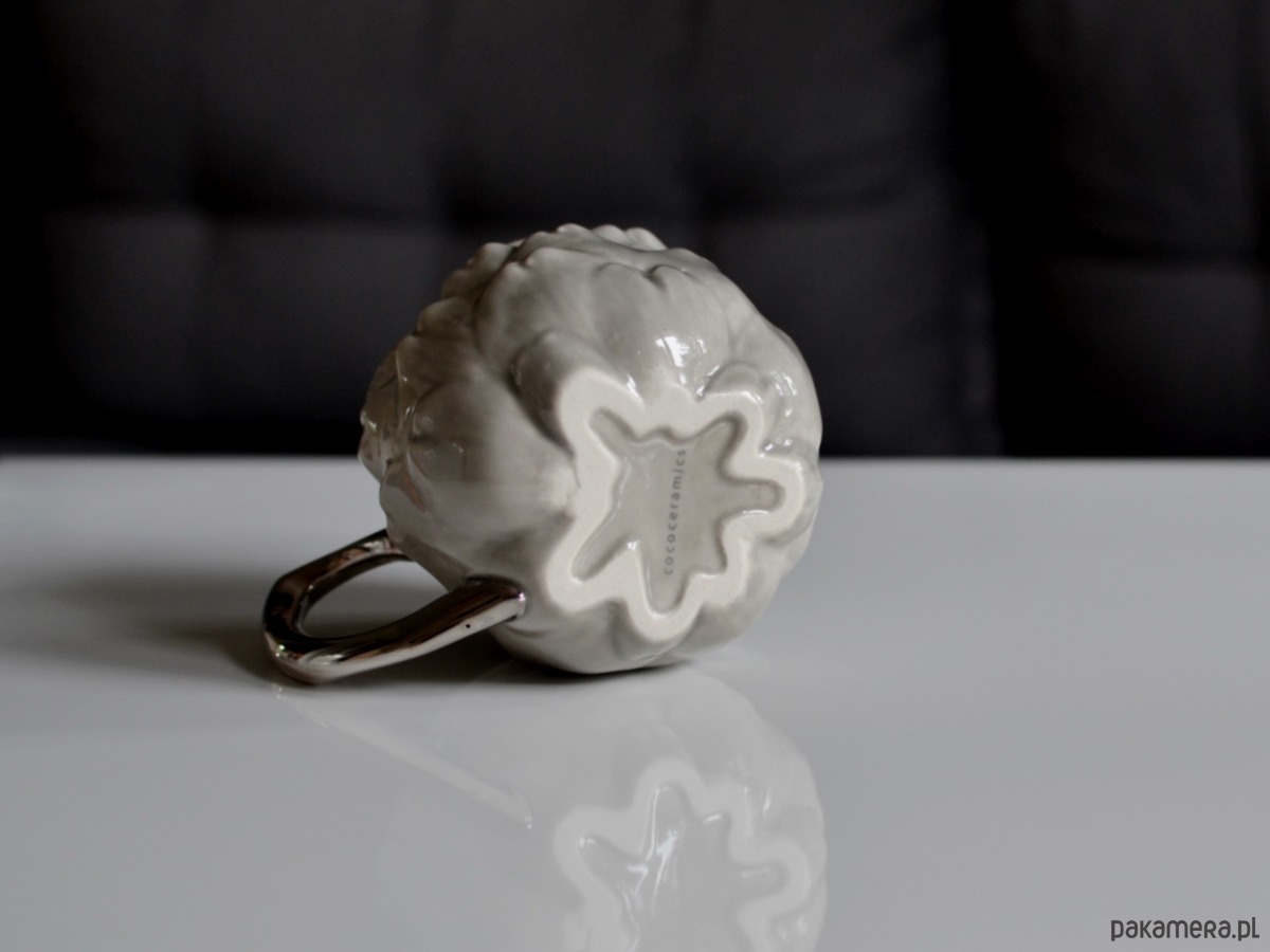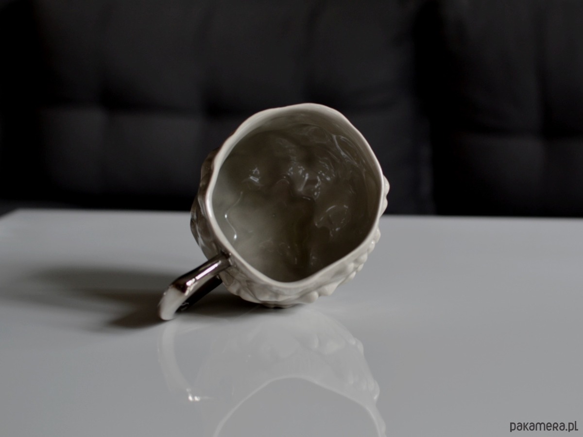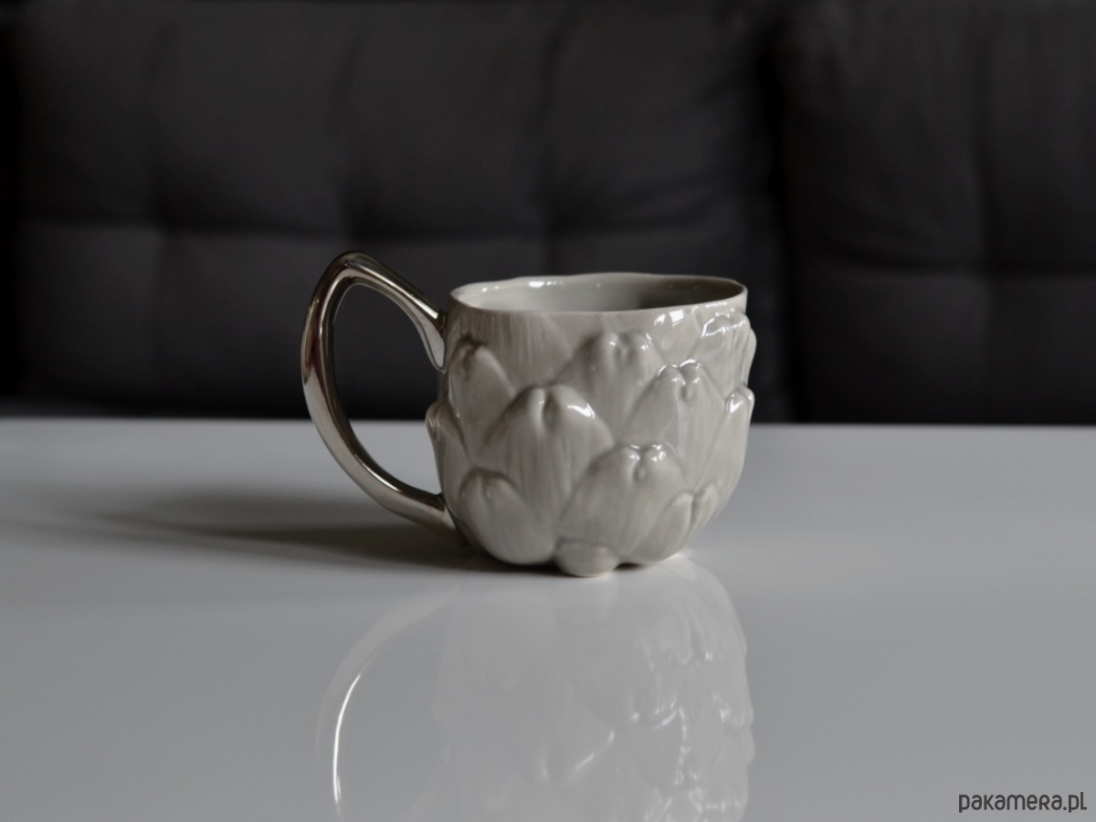 Autorska filiżanka wykonana z masy porcelitowej, pokryta szkliwem „gołębim”. Jest to szarość złamana zielenią i kobaltem. Uszko filiżanki pokryte jest platyną.