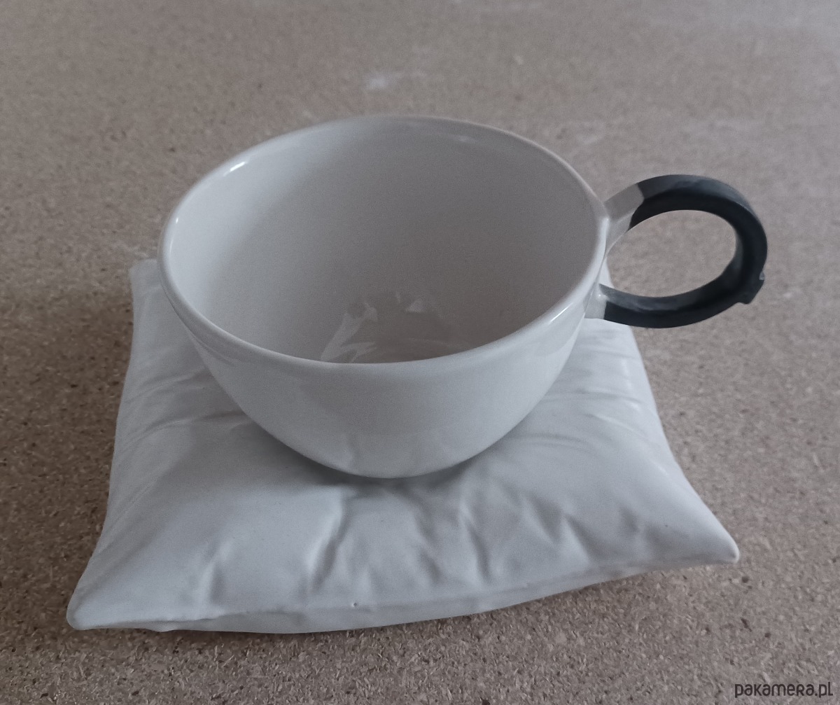 Filiżanka na podstawce w formie poduszki. Wykonana ręcznie z masy porcelitowej. Szkliwo białe matowe, wnętrze filiżanki białe błyszczące. Wypalona w temperaturze 1250 C. Nadaje się do mycia w zmywarkach. Produkty wykonywane ręcznie, mogą nieznacznie różnić się między sobą.