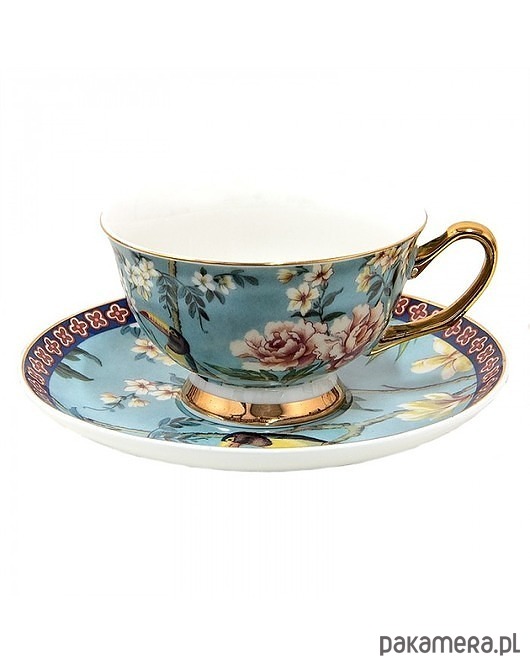Komplet dwóch porcelanowych filiżanek ze spodkami. Bardzo eleganckie. Motyw kwiatów i ptaków. Ozdobione złotym dekorem. Szkliwione.