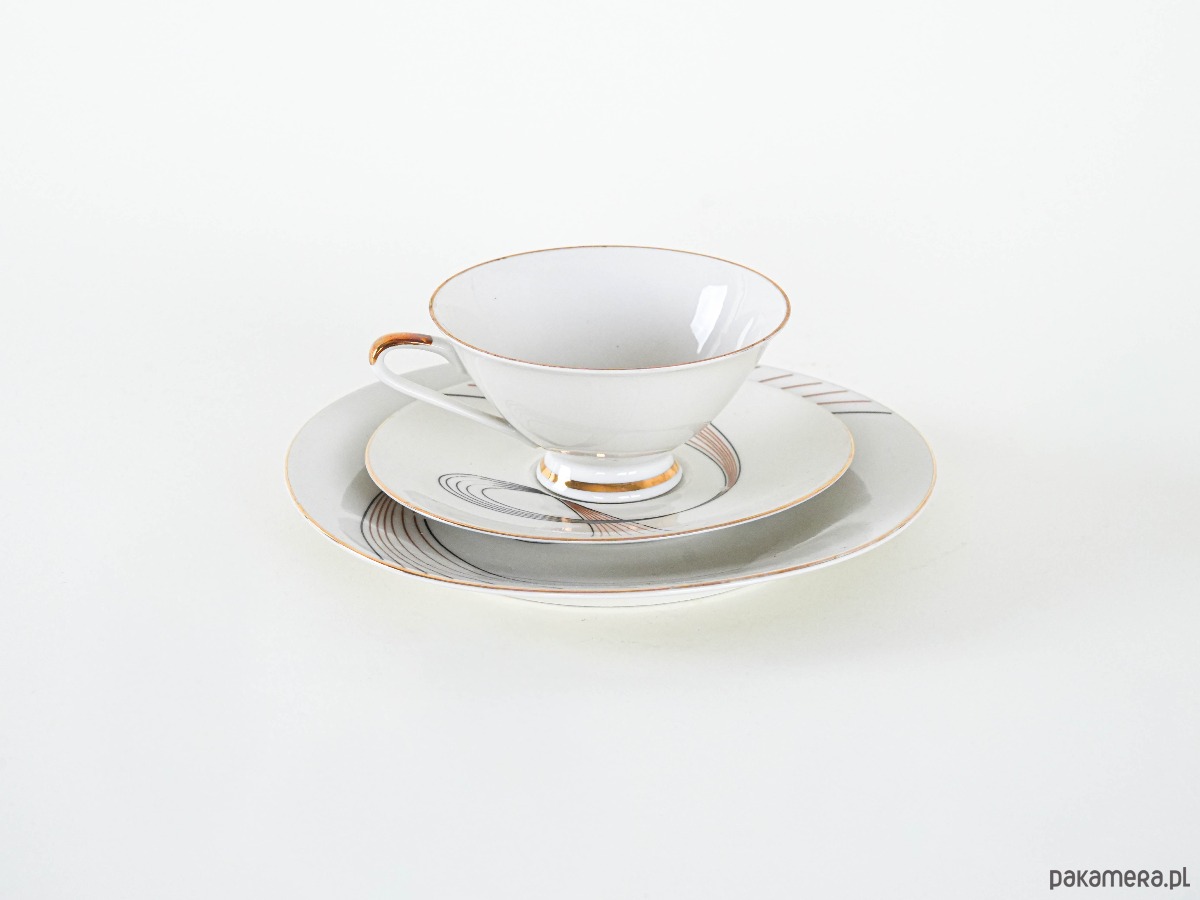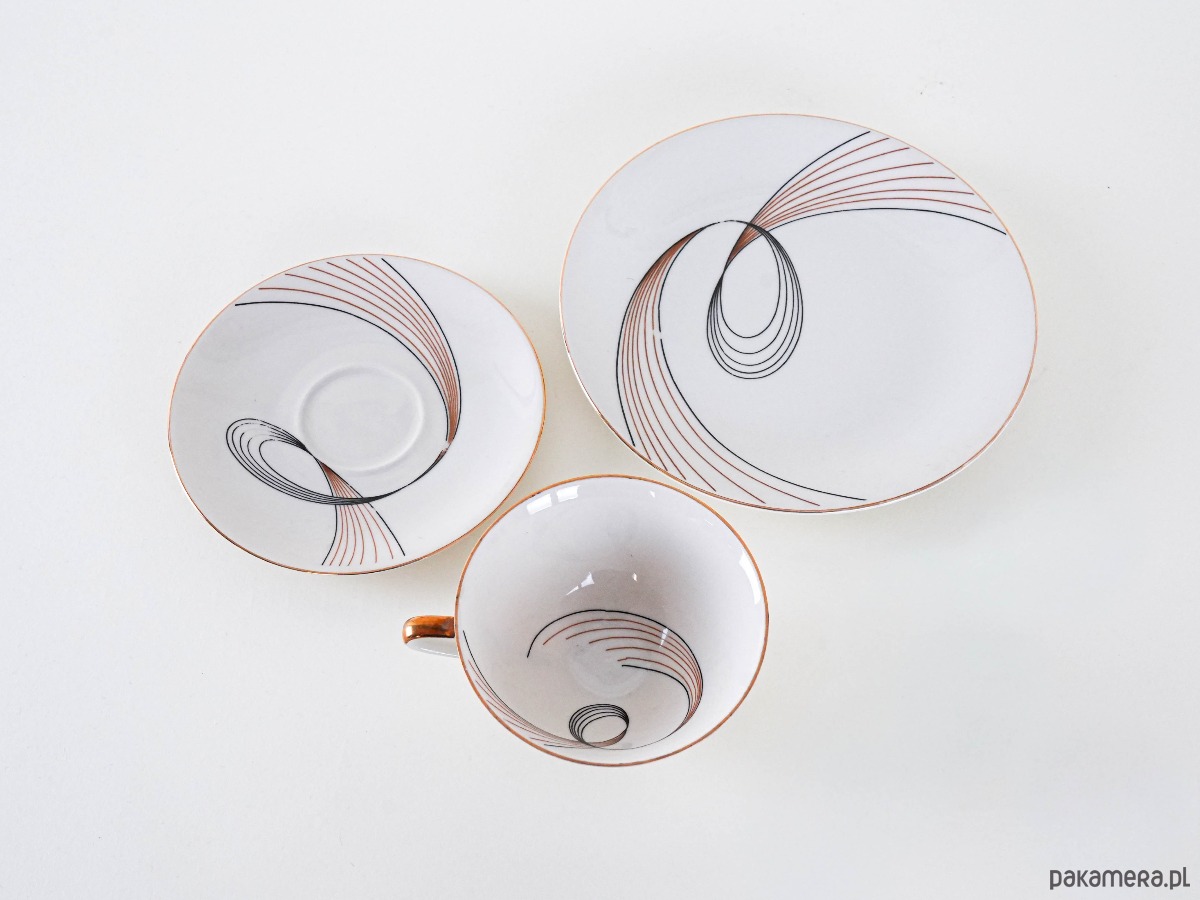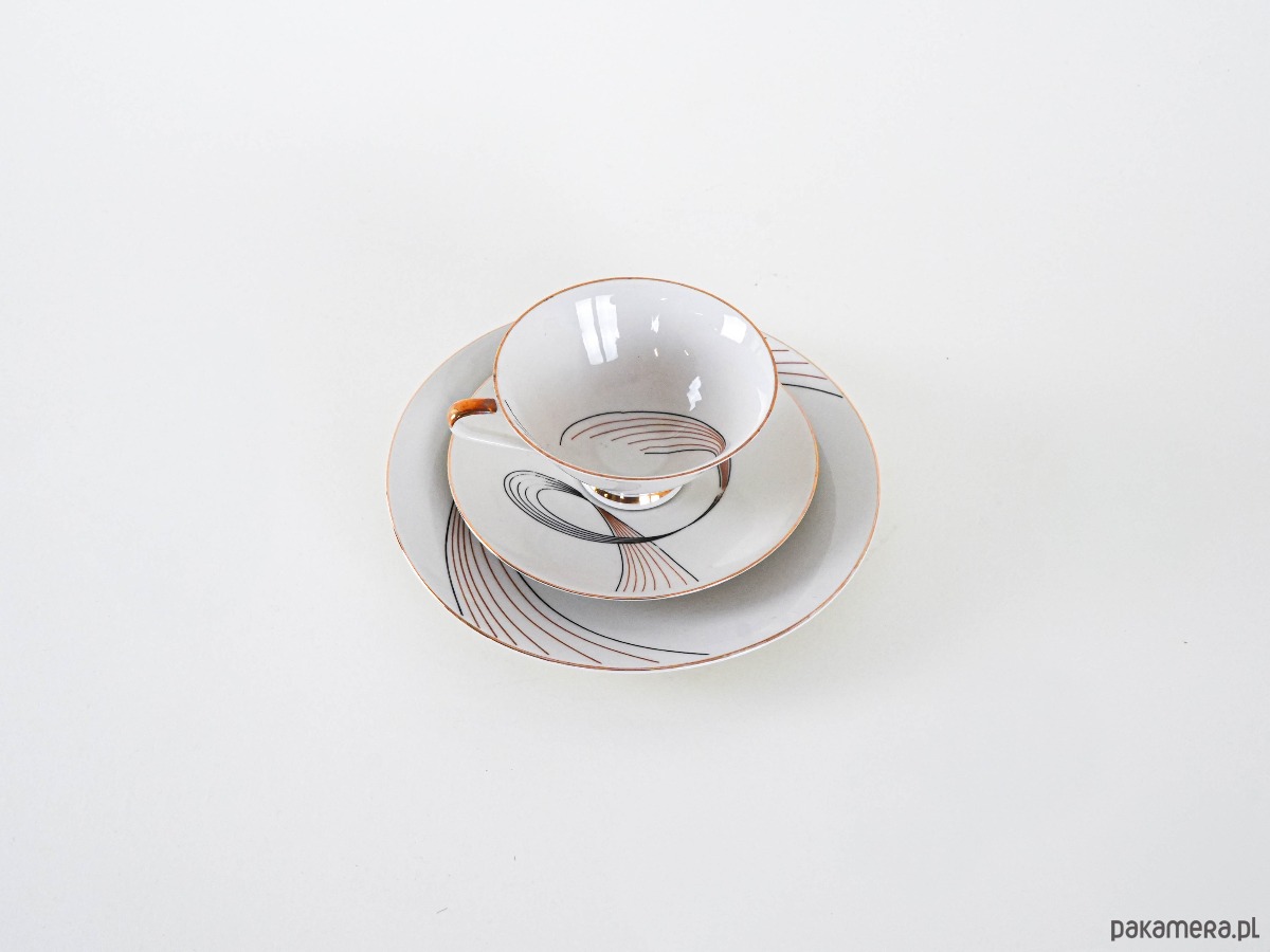 Filiżanka porcelanowa z talerzykiem i spodkiem, vintage. Delikatny, kremowy odcień porcelany został ozdobiony finezyjnym geometrycznym wzorem w czerni i złocie, który nadaje całości eleganckiego, modernistycznego charakteru. Smukła forma filiżanki z subtelnym złoceniem na uchu i podstawie podkreśla wyrafinowany styl lat 50.–60. XX wieku. Idealny komplet do serwowania kawy lub herbaty, a także jako element dekoracyjny w kolekcji porcelany.