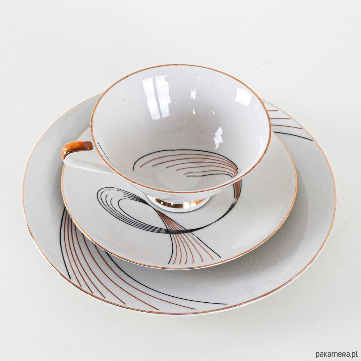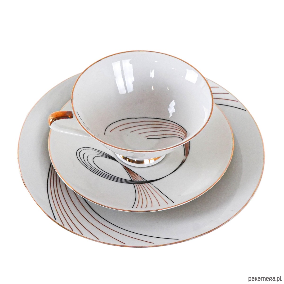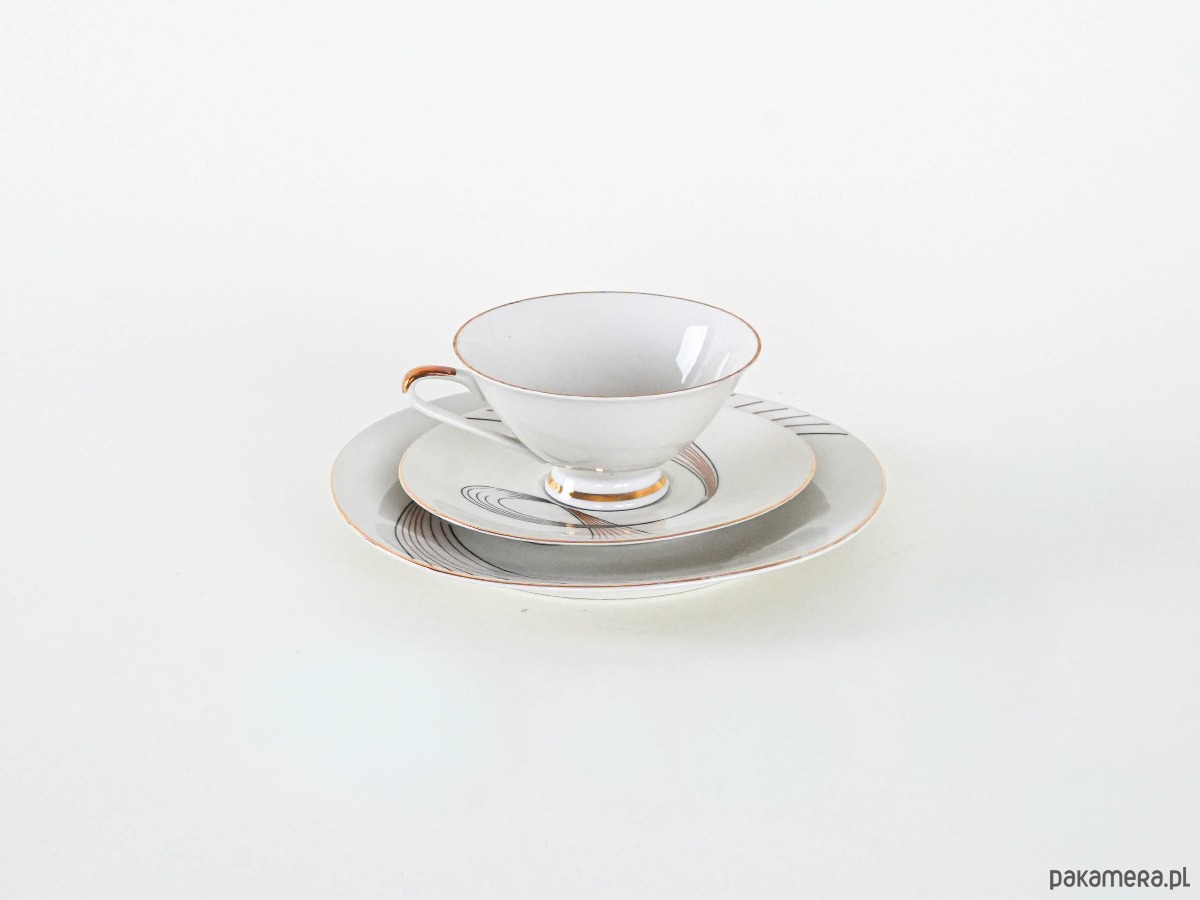 Filiżanka porcelanowa z talerzykiem i spodkiem, vintage. Delikatny, kremowy odcień porcelany został ozdobiony finezyjnym geometrycznym wzorem w czerni i złocie, który nadaje całości eleganckiego, modernistycznego charakteru. Smukła forma filiżanki z subtelnym złoceniem na uchu i podstawie podkreśla wyrafinowany styl lat 50.–60. XX wieku. Idealny komplet do serwowania kawy lub herbaty, a także jako element dekoracyjny w kolekcji porcelany.