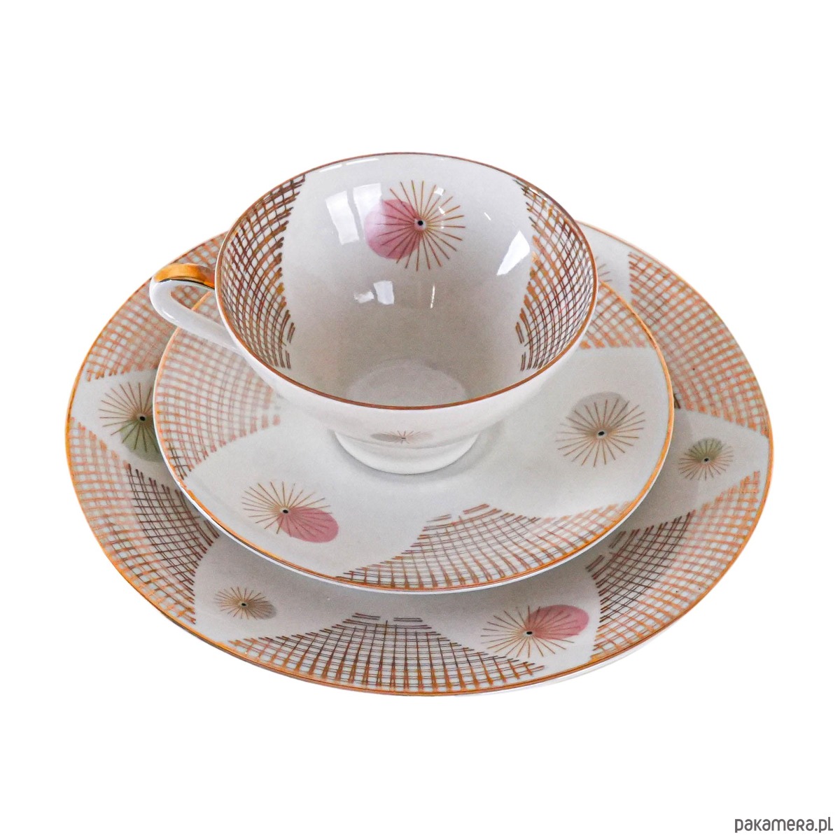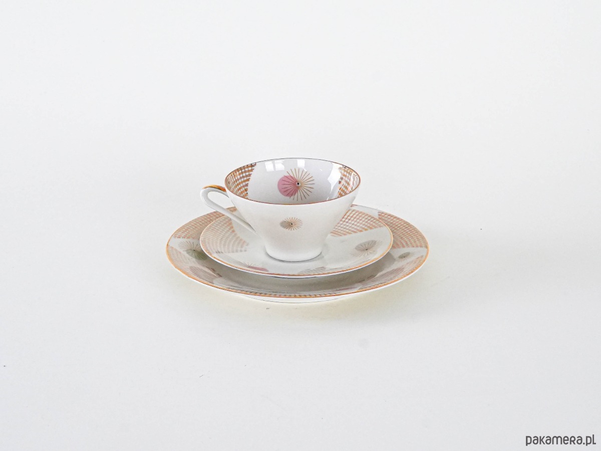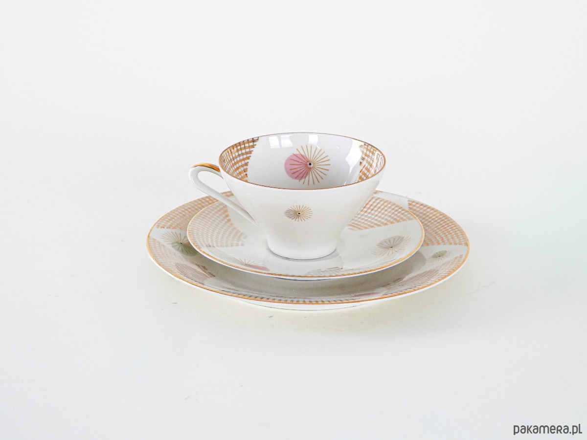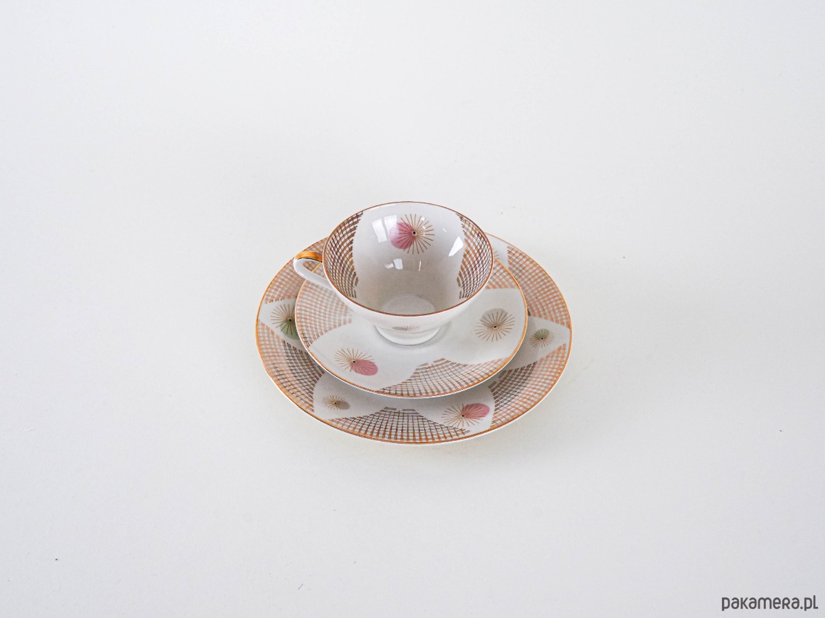 Filiżanka porcelanowa z talerzykiem i spodkiem, vintage. Delikatny, kremowy odcień porcelany został ozdobiony finezyjnym geometrycznym wzorem w złocie, który nadaje całości eleganckiego, modernistycznego charakteru. Smukła forma filiżanki z subtelnym złoceniem na uchu i podstawie podkreśla wyrafinowany styl lat 50.–60. XX wieku. Idealny komplet do serwowania kawy lub herbaty, a także jako element dekoracyjny w kolekcji porcelany.