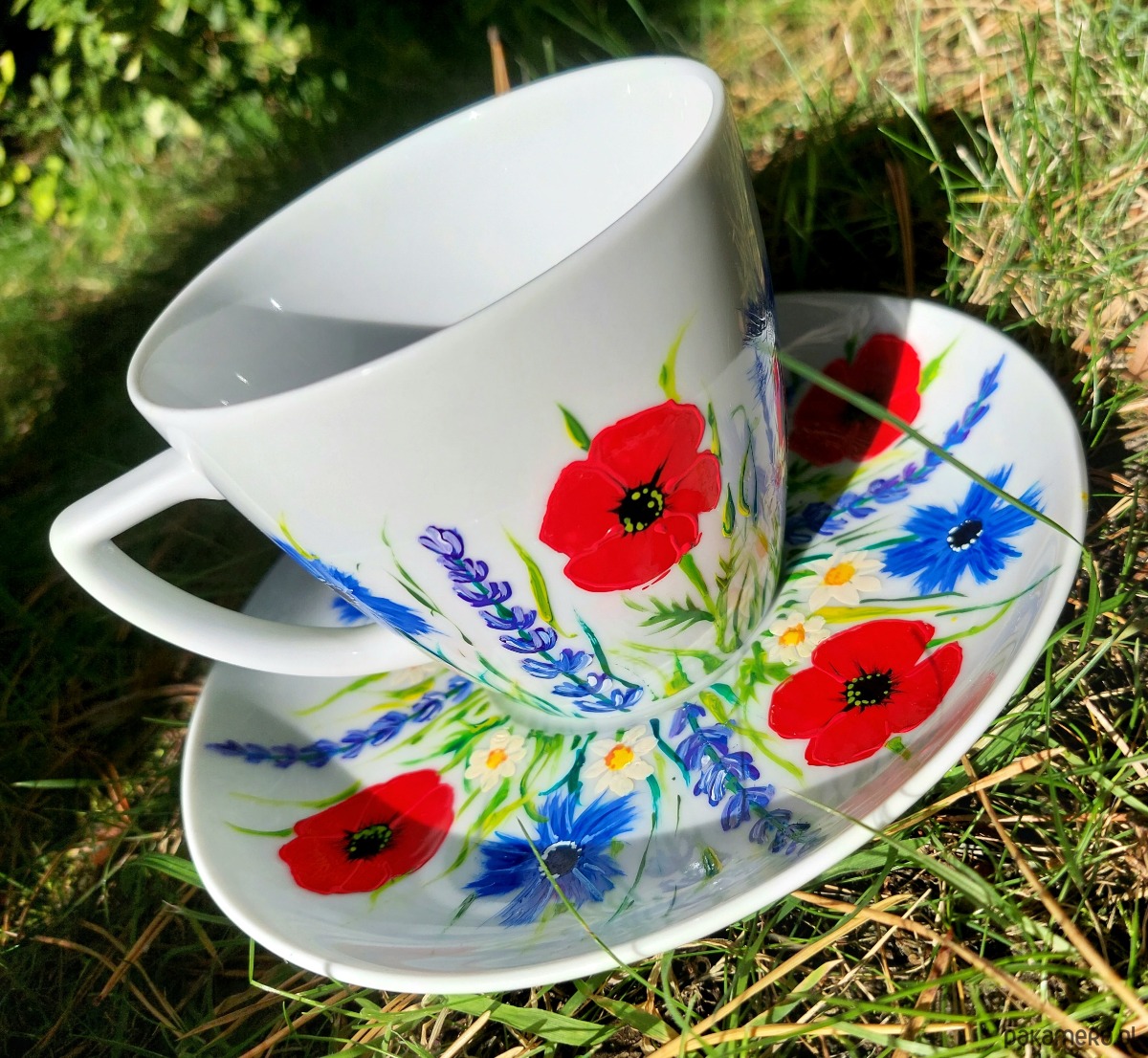 Filiżanka ze spodkiem ręcznie malowana w polne kwiaty.