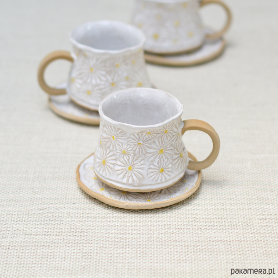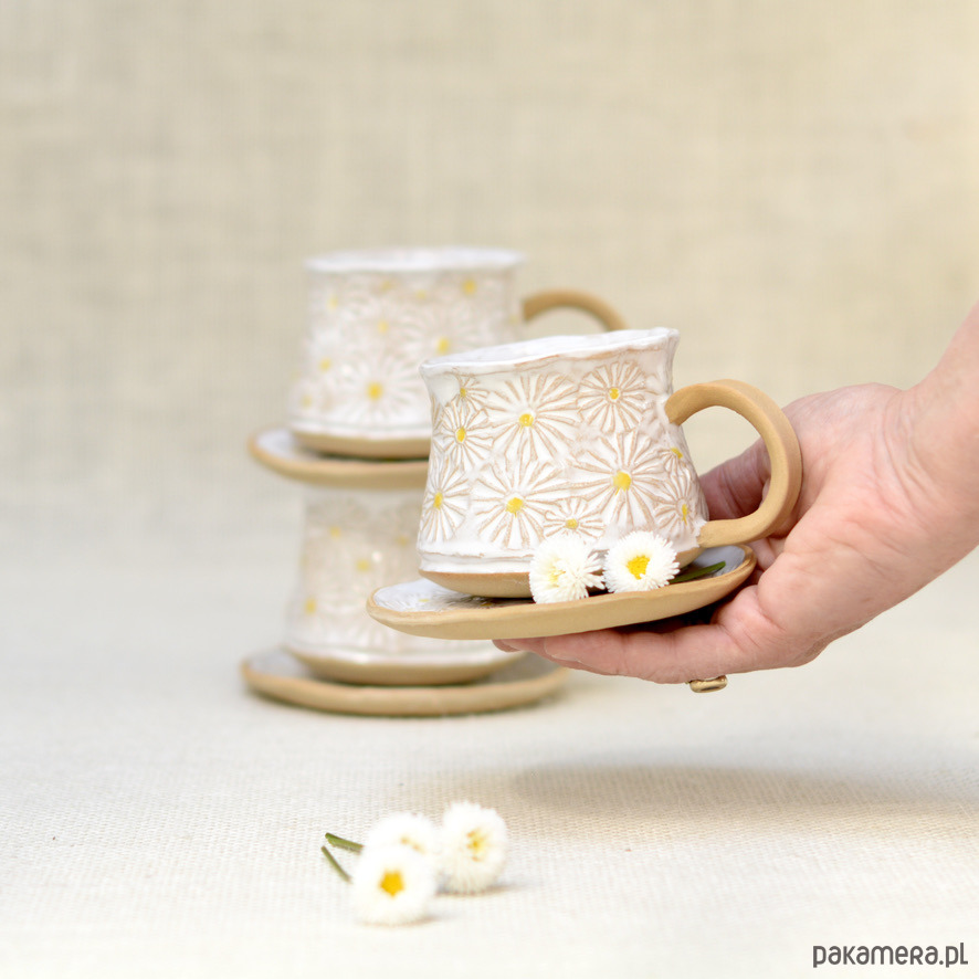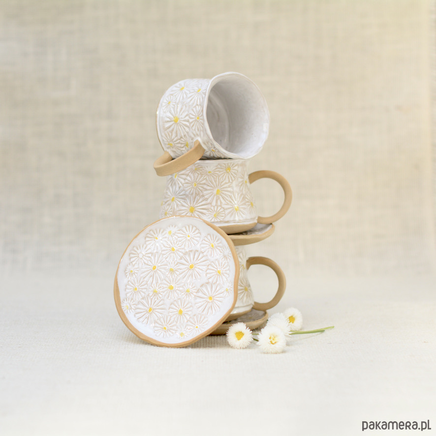 Ręcznie wykonana filiżanka ceramiczna z podstawką. Naczynie ma odciśnięty motyw kwiatowy stokrotki. Filiżanka ma lekko wyoblone dno dla wygodnego trzymania na dłoni. Brzeg jest tak skonstruowany, że zapobiega ściekaniu płynu podczas picia. Nieszkliwione ucho zapewnia pewny i wygodny uchwyt. Tekstura jest miła w dotyku, bez zadziorów.