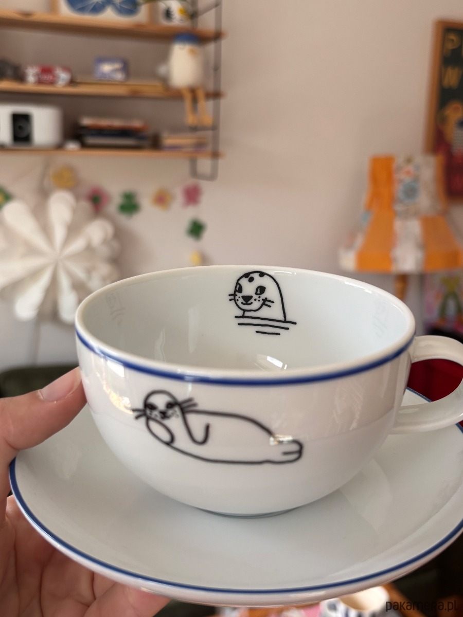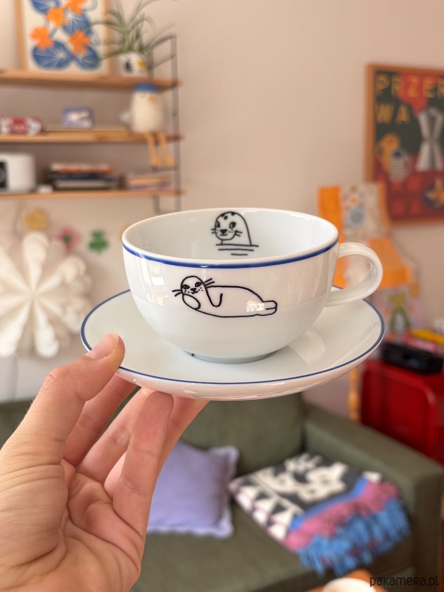 Ręcznie zdobiona filiżanka z drugiego obiegu. Filiżanka z ilustracją foki. Cena dotyczy kompletu filiżanka + spodek