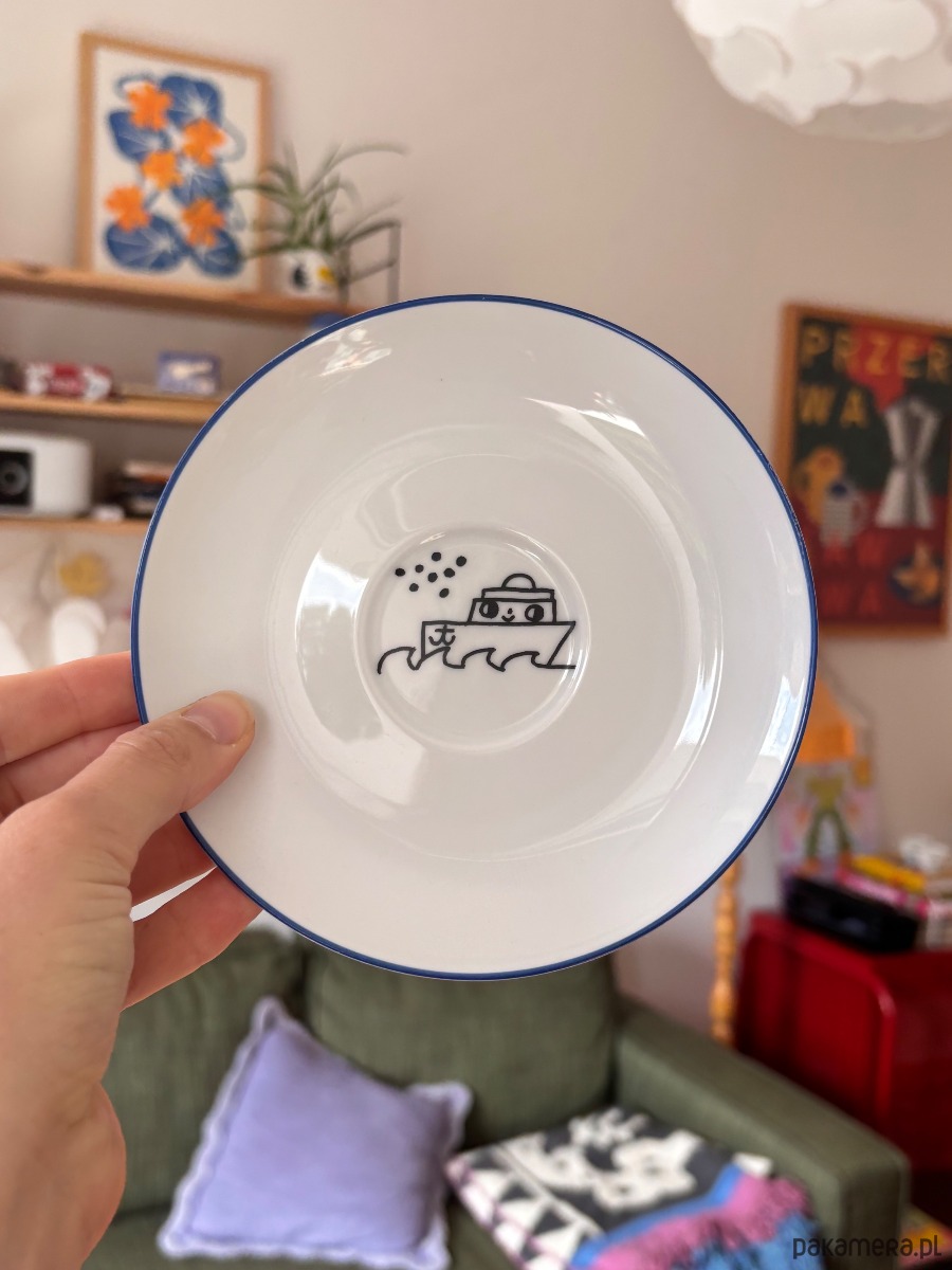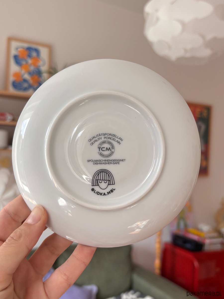 To naczynie ma już swoją historię – znalazłam je na pchlim targu, a potem ozdobiłam moimi autorskimi ilustracjami, które ręcznie przeniosłam na naczynia techniką kalkomanii ceramicznej. Na koniec całość wypaliłam w wysokiej temperaturze, dzięki czemu wzory są trwałe i bez problemu można je myć w zmywarce.