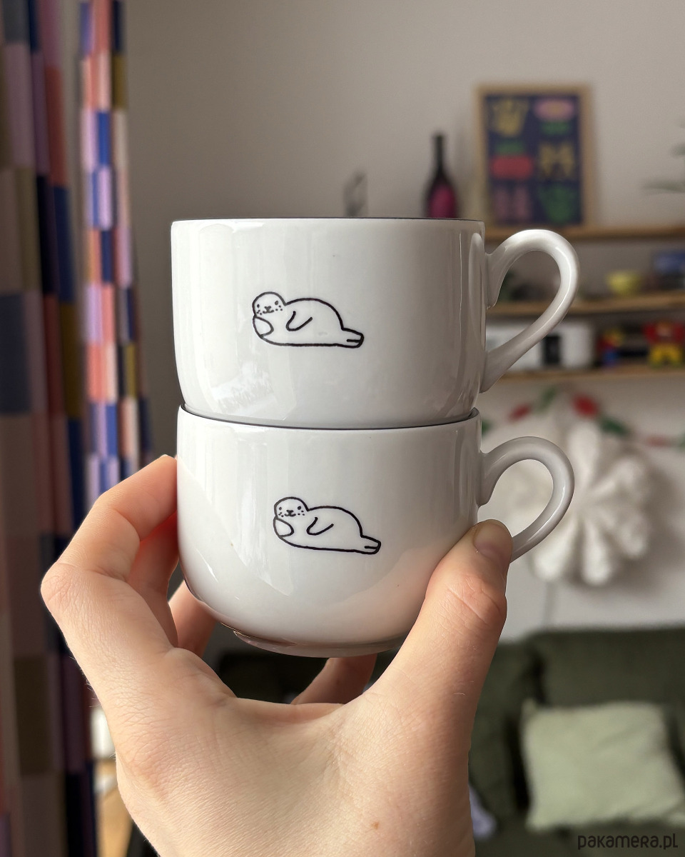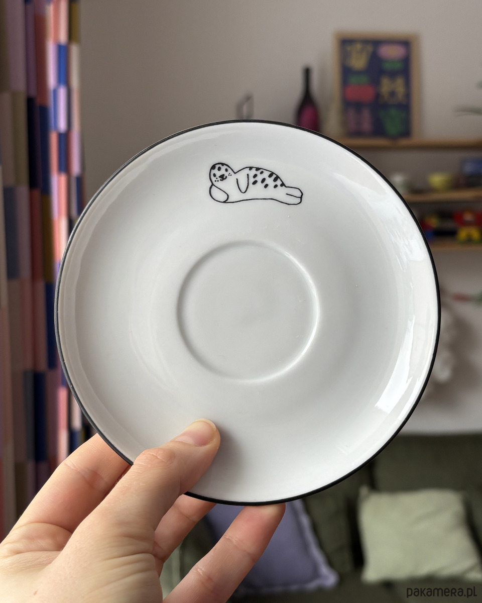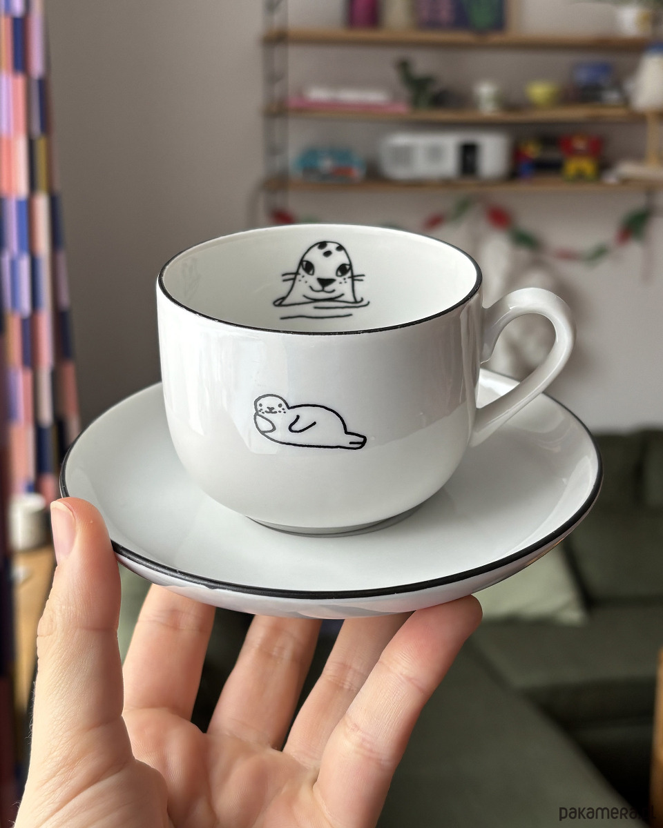 Ręcznie zdobiona filiżanka z drugiego obiegu. Filiżanka z ilustracją foki. Cena dotyczy kompletu filiżanka + spodek