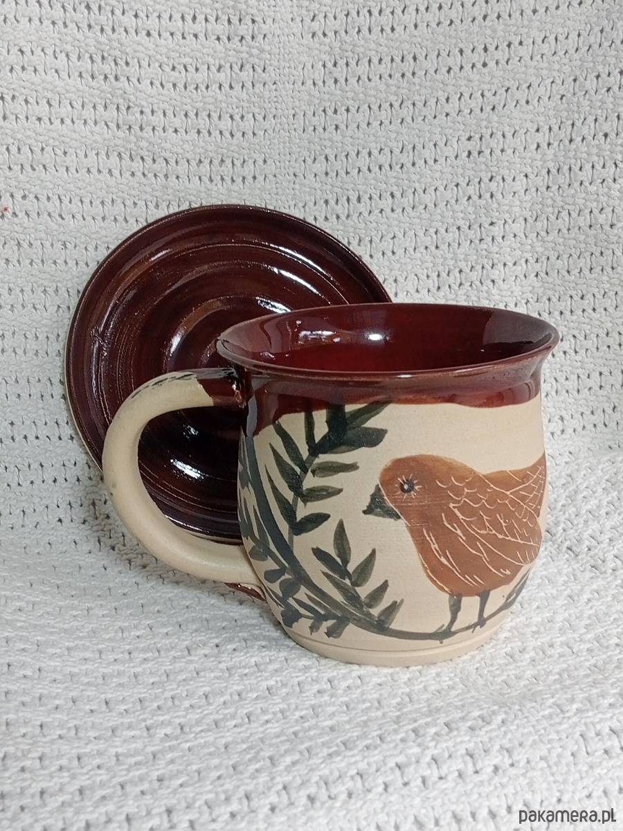 Filiżanka z postawką z brązowym szkliwem wewnątrz, na brzegu oraz talerzyku. Na uchu dekoracyjny wzorek.