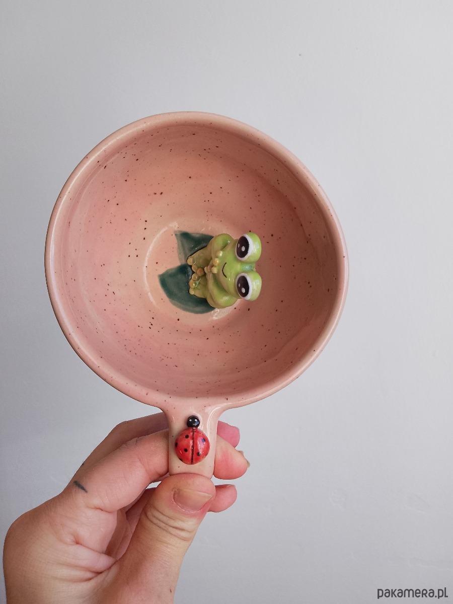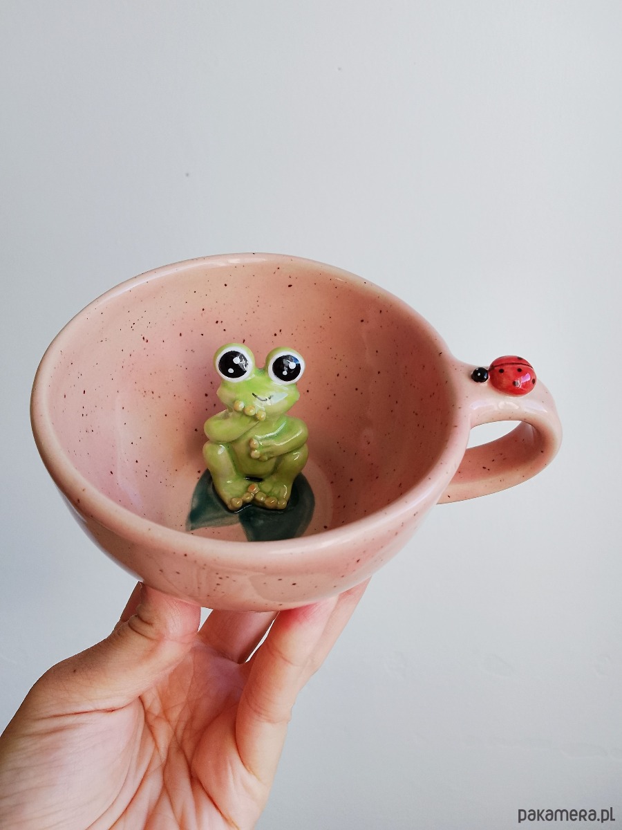 Filiżanka ceramiczna z żabką i biedronką o pojemności 300 ml .