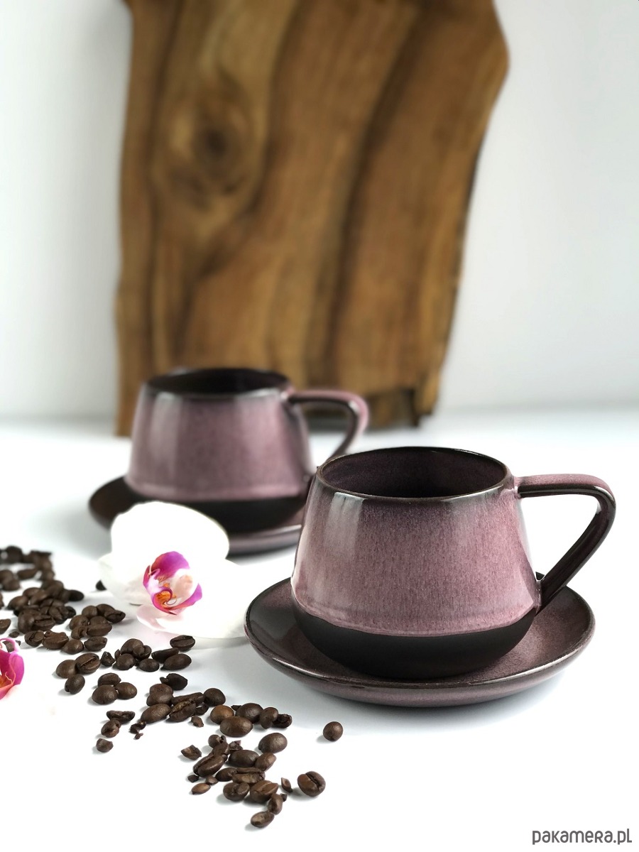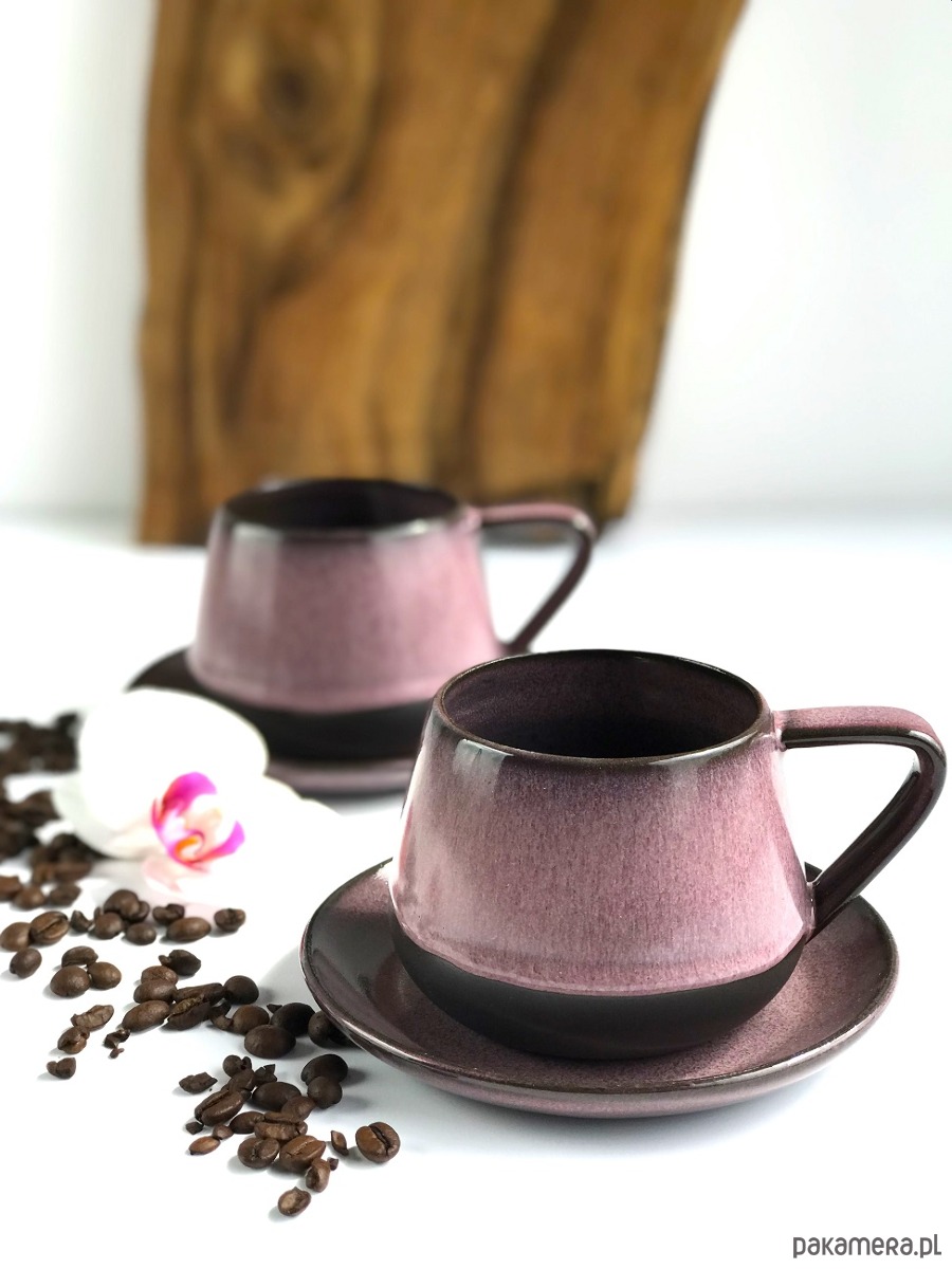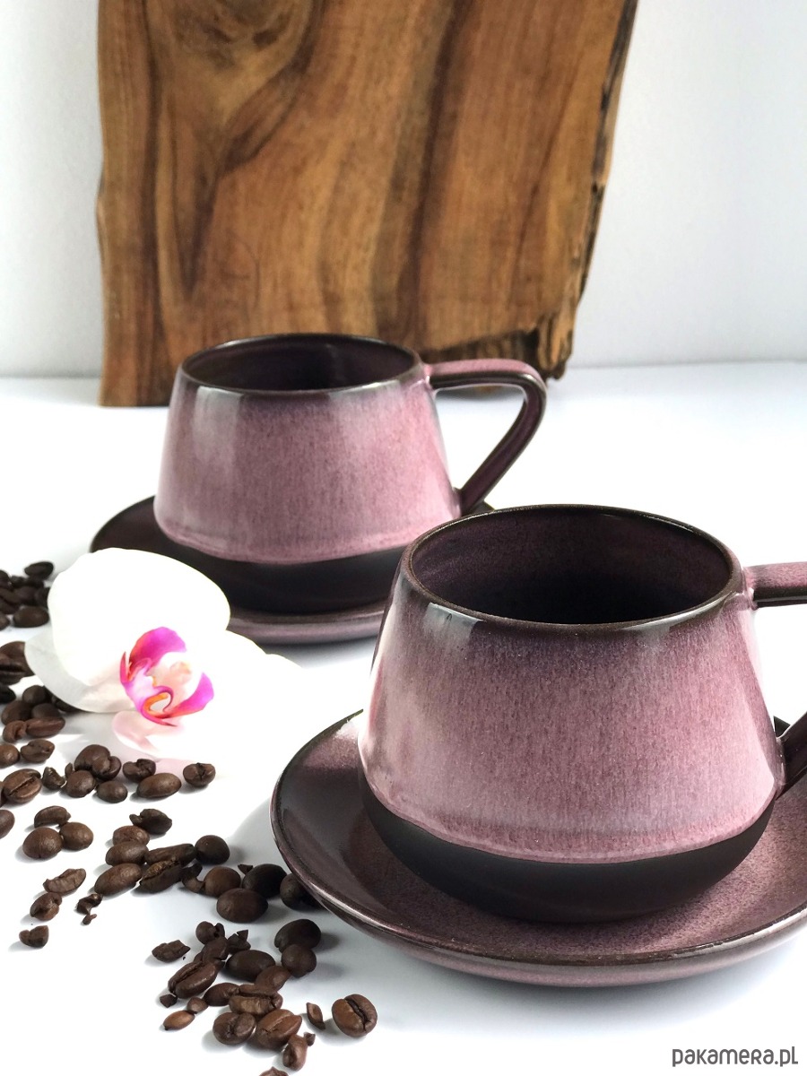 Filiżanka wykonana jest z ciemnoczekoladowej masy ceramicznej.
