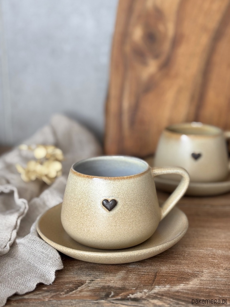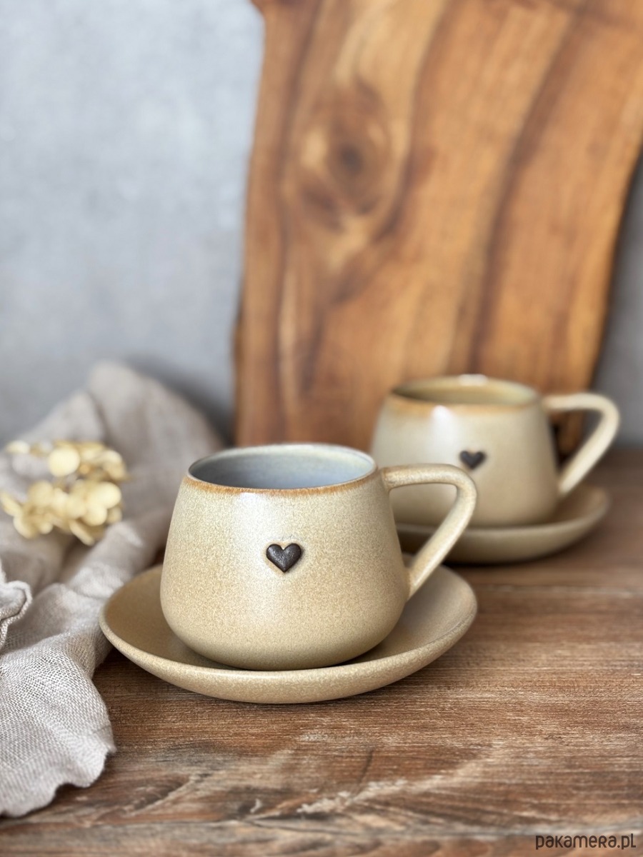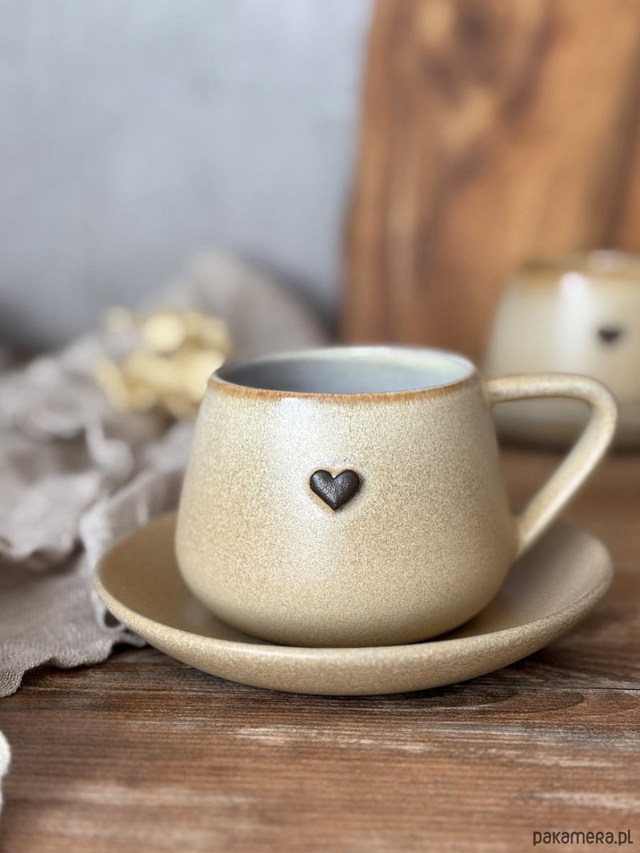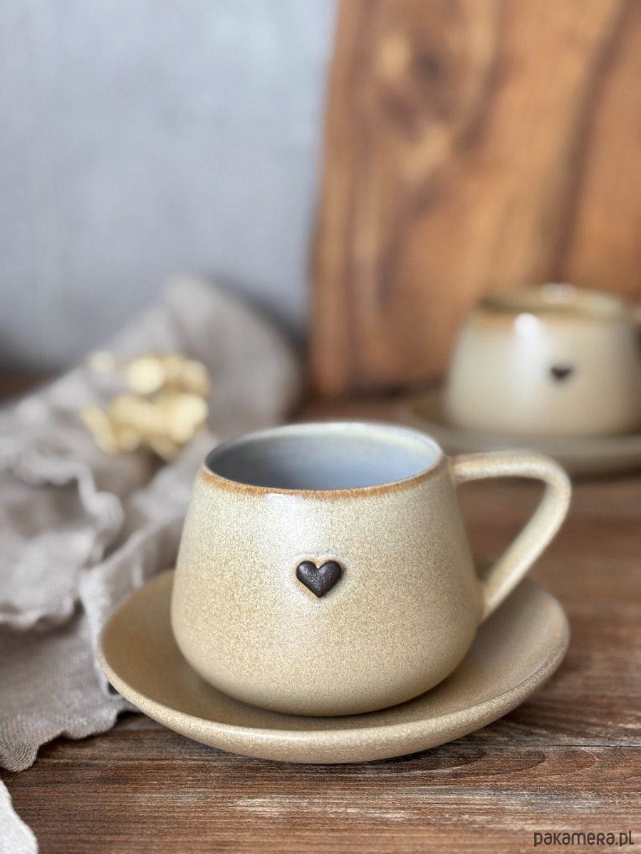 Ręcznie robiona filiżanka ceramiczna ze spodeczkiem - Pustynny piach z sercem