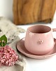 Ręcznie robiona filiżanka ceramiczna ze spodkiem beczułka różowa z sercem.