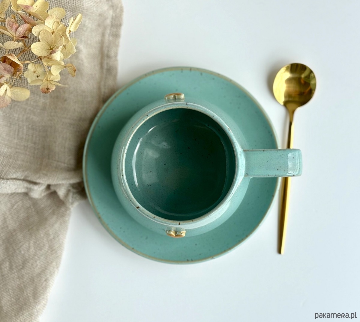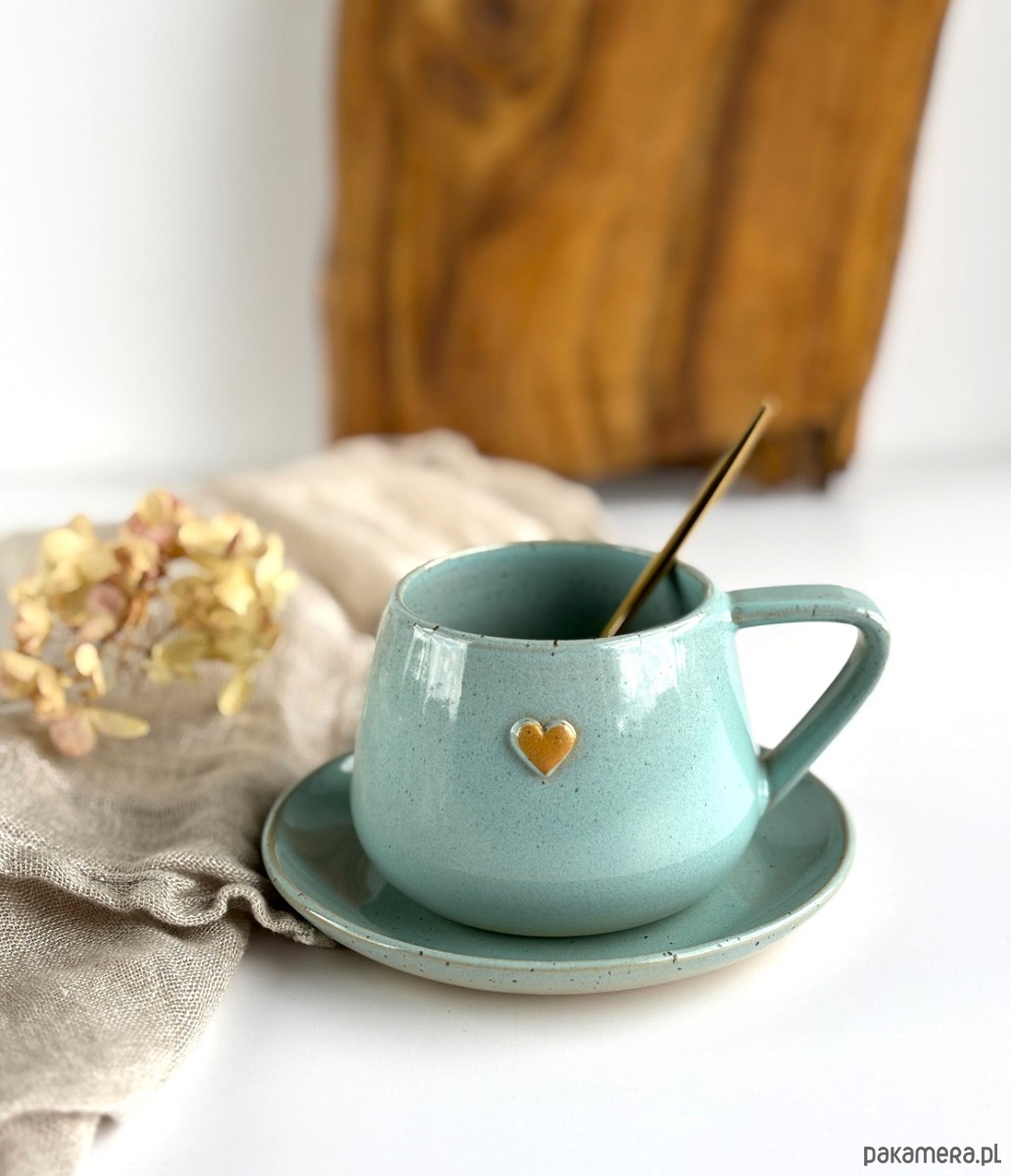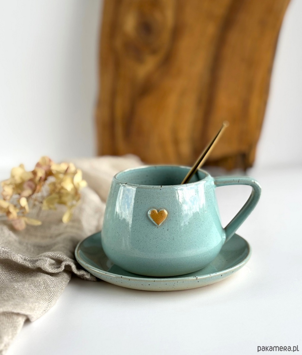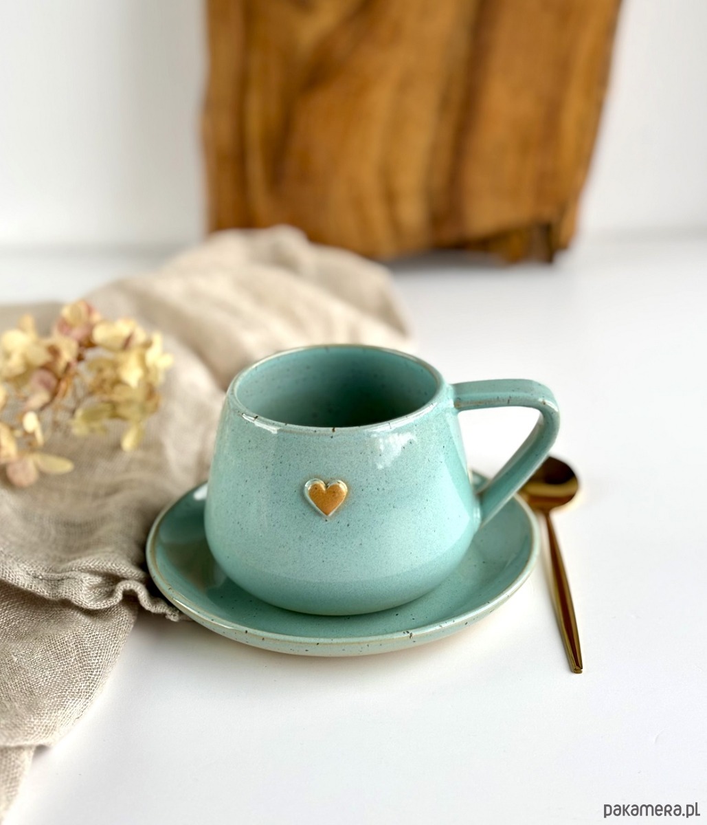 Filiżanka ze spodkiem beczułka ręcznie robiona 250 ml - turkusowa z sercem