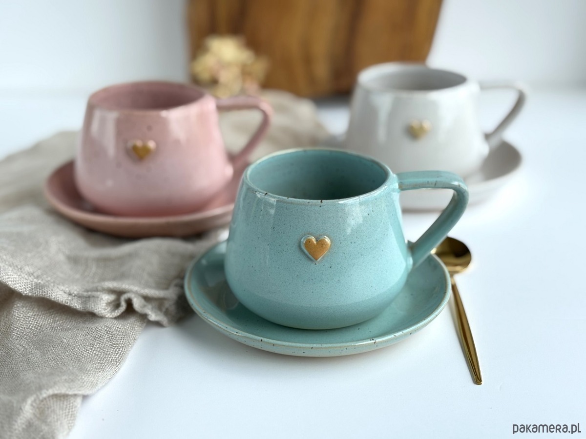 Ręcznie robiona filiżanka ceramiczna ze spodkiem beczułka turkusowa z sercem.