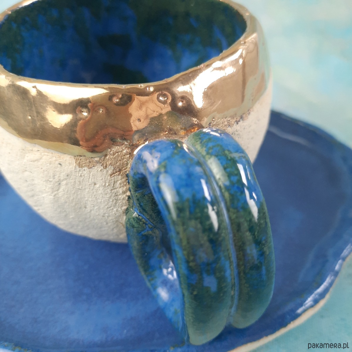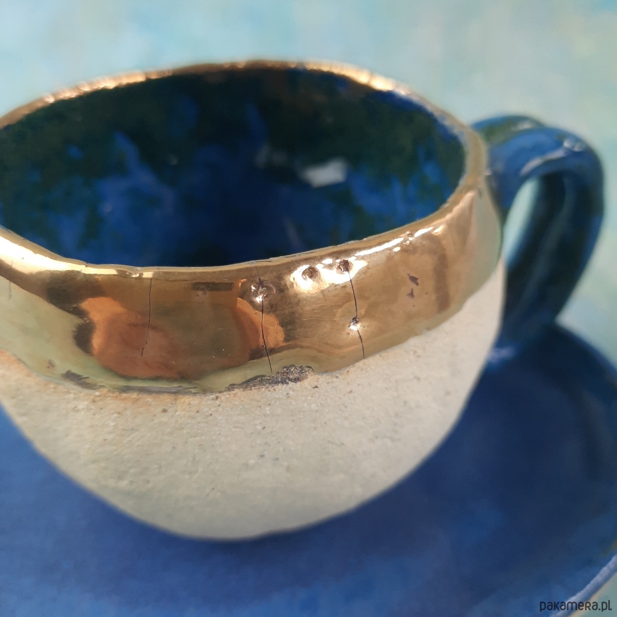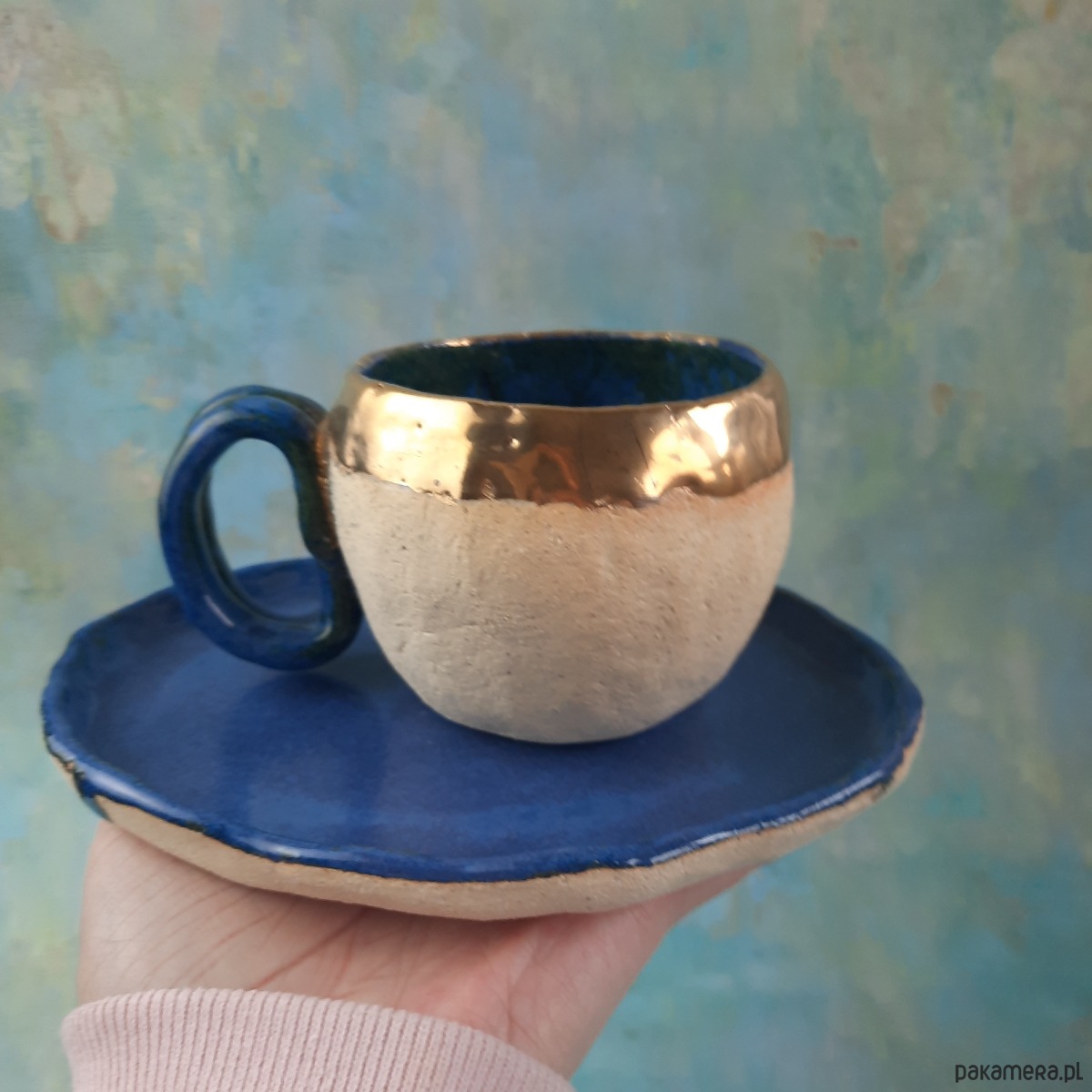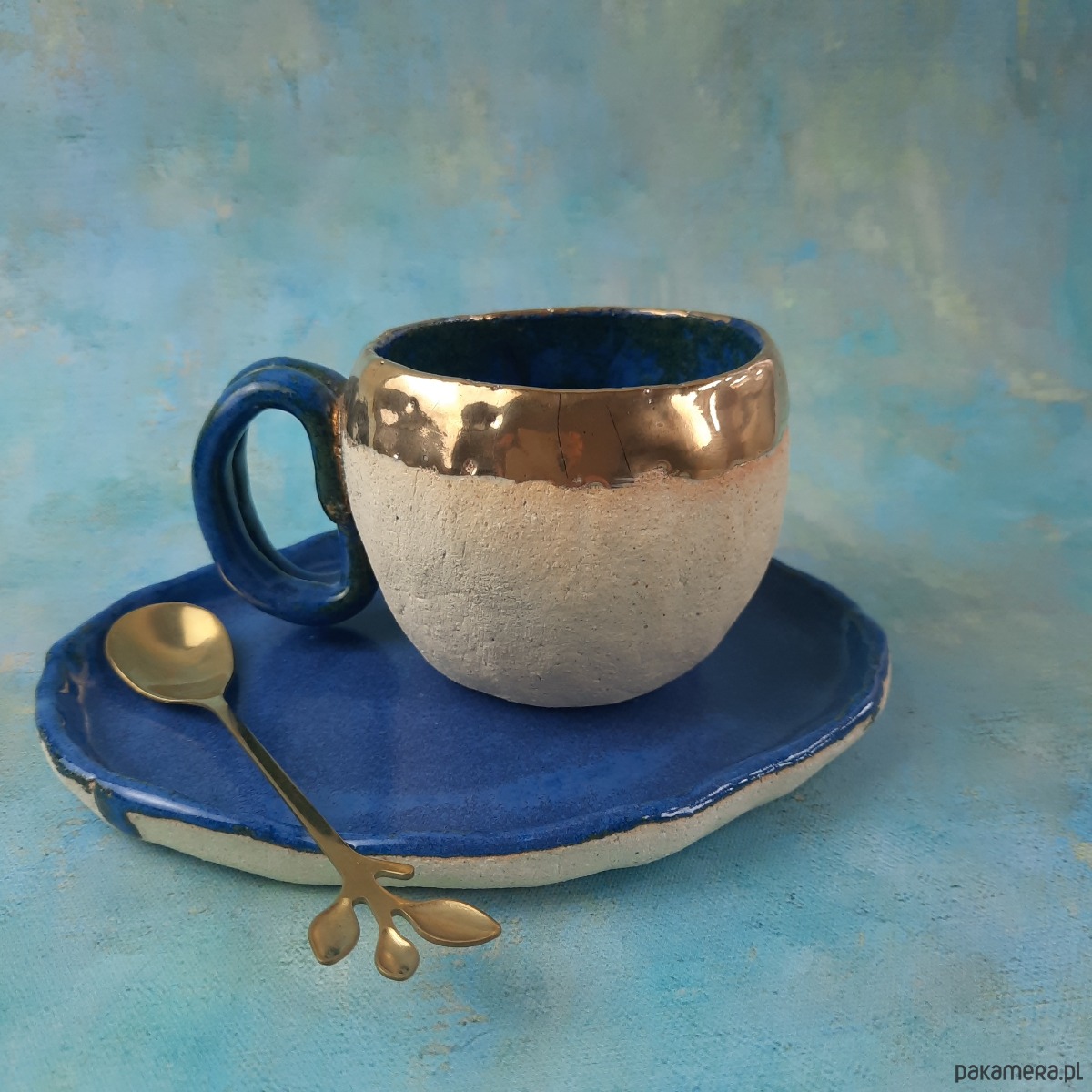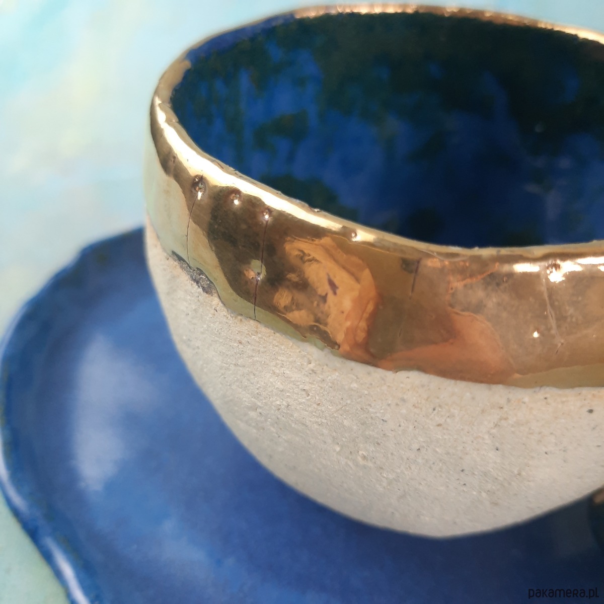Unikatowa filiżanka ze spodkiem wykonana ręcznie w polskiej pracowni ceramicznej. Surowa faktura naczynia kontrastuje z głębokim granatem szkliwa i lśniącym złotem na rancie – to małe dzieło sztuki użytkowej, które przyciąga wzrok i zachwyca detalem.