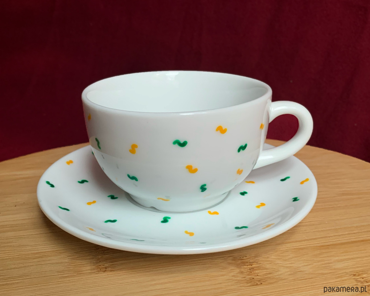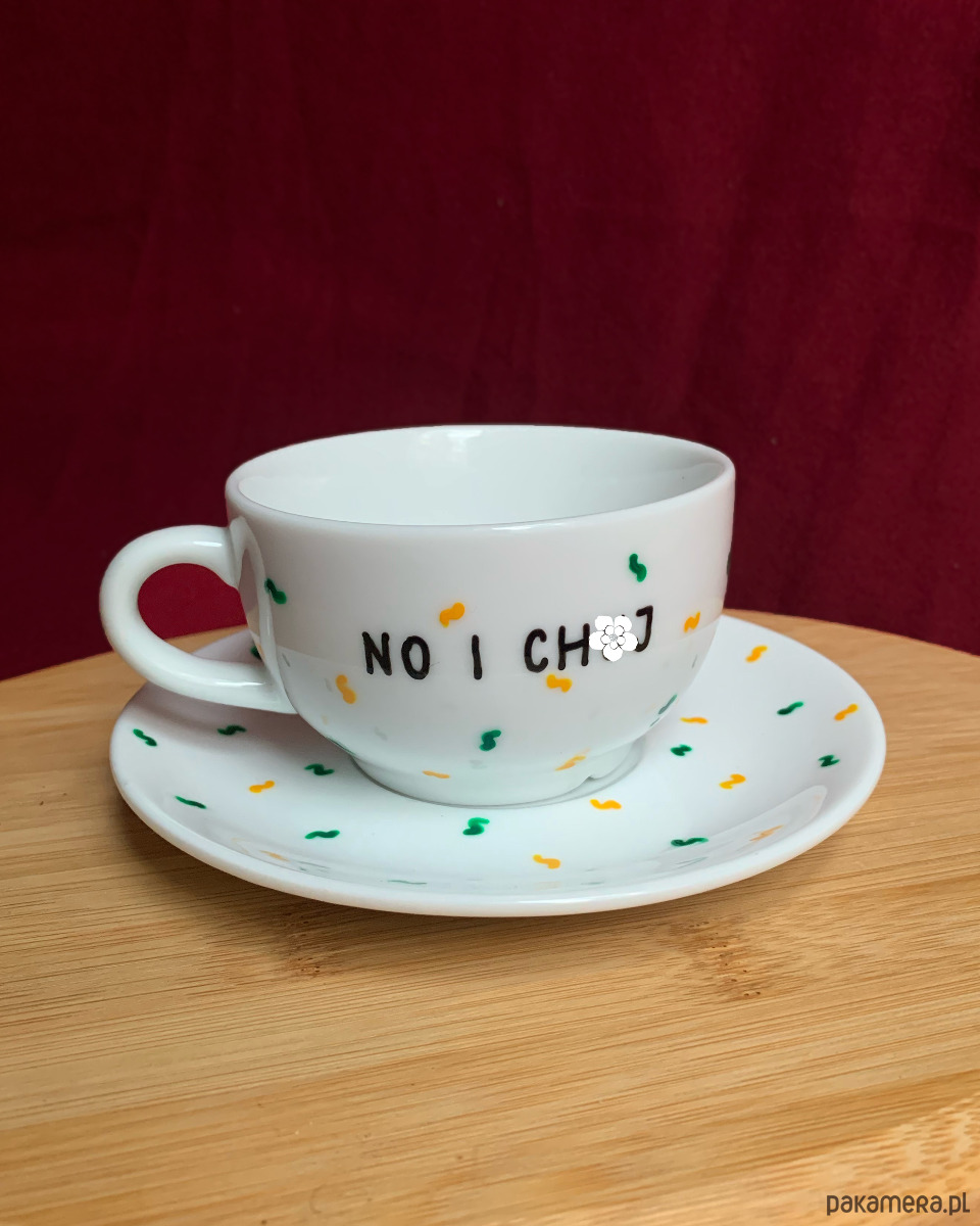 Ręcznie malowana biała filiżanka ze spodkiem z drugiego obiegu. Ozdobiona brzydkim napisem oraz wzorkami.