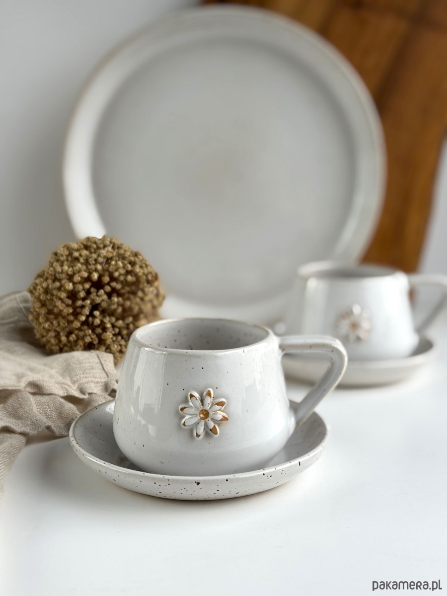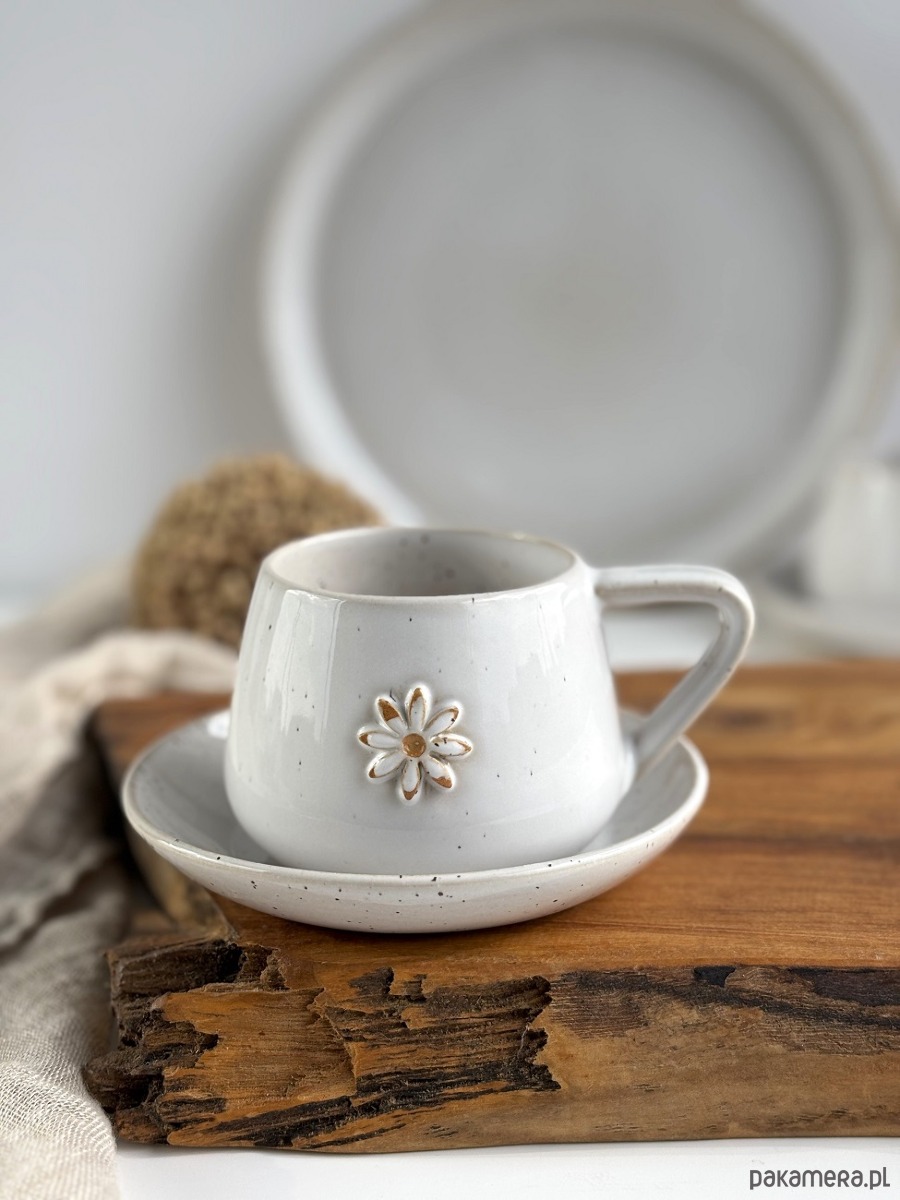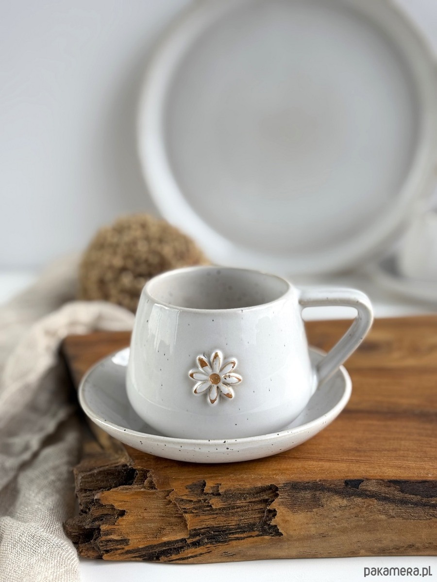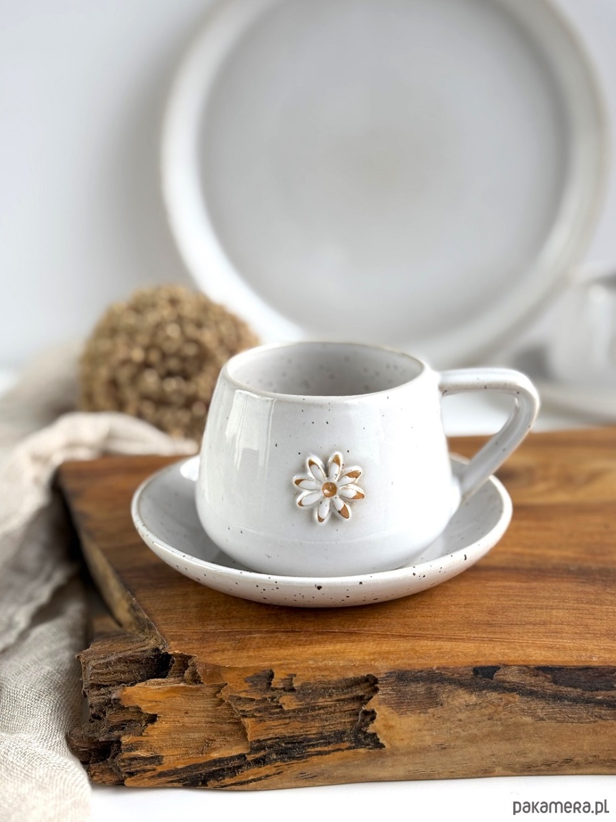 Filiżanka ze spodkiem ręcznie robiona 250 ml - Biała stokrotka
