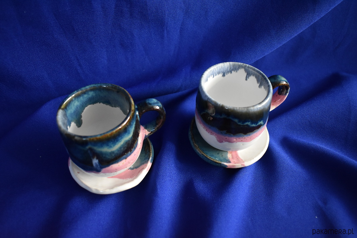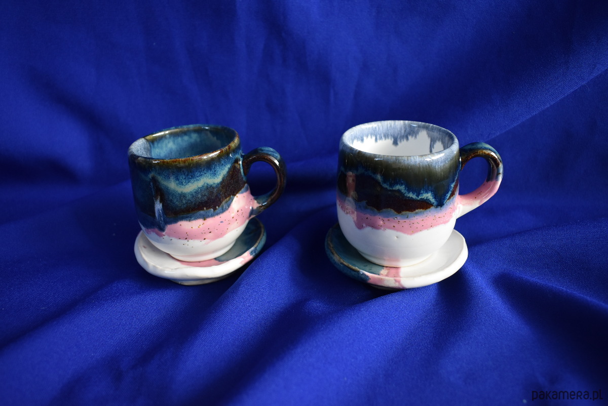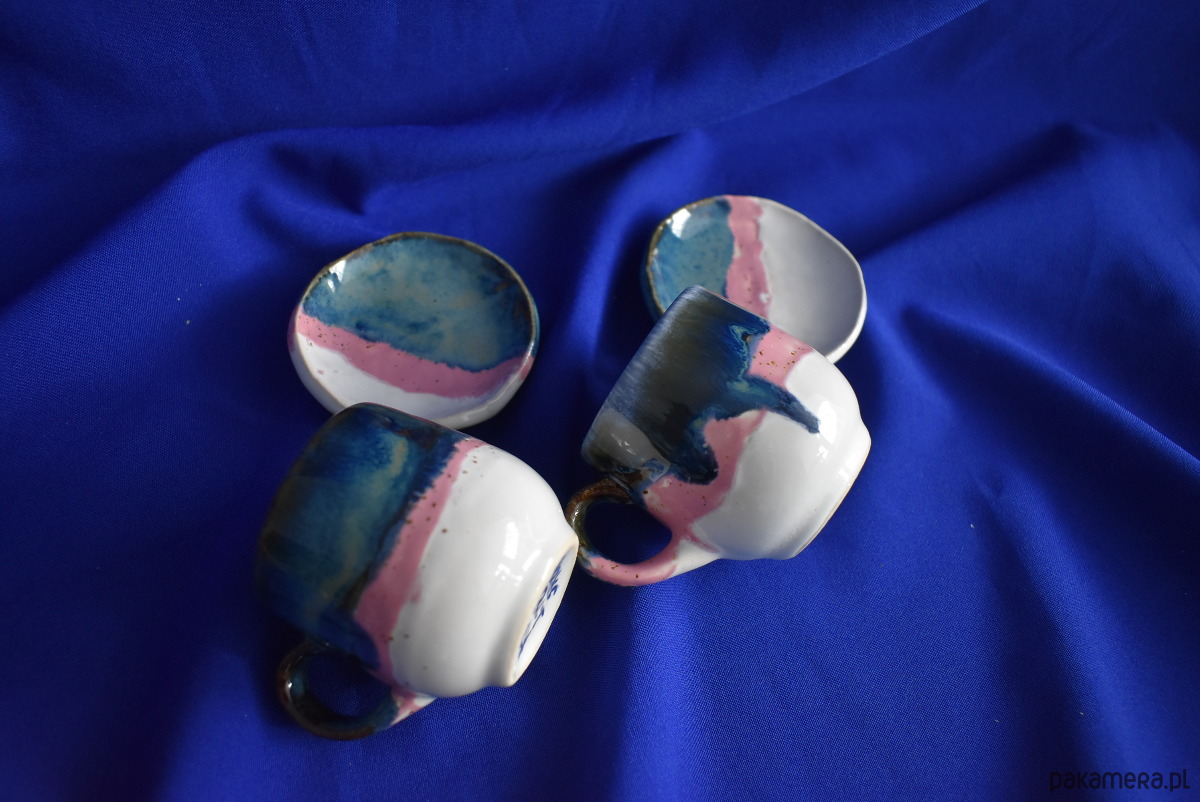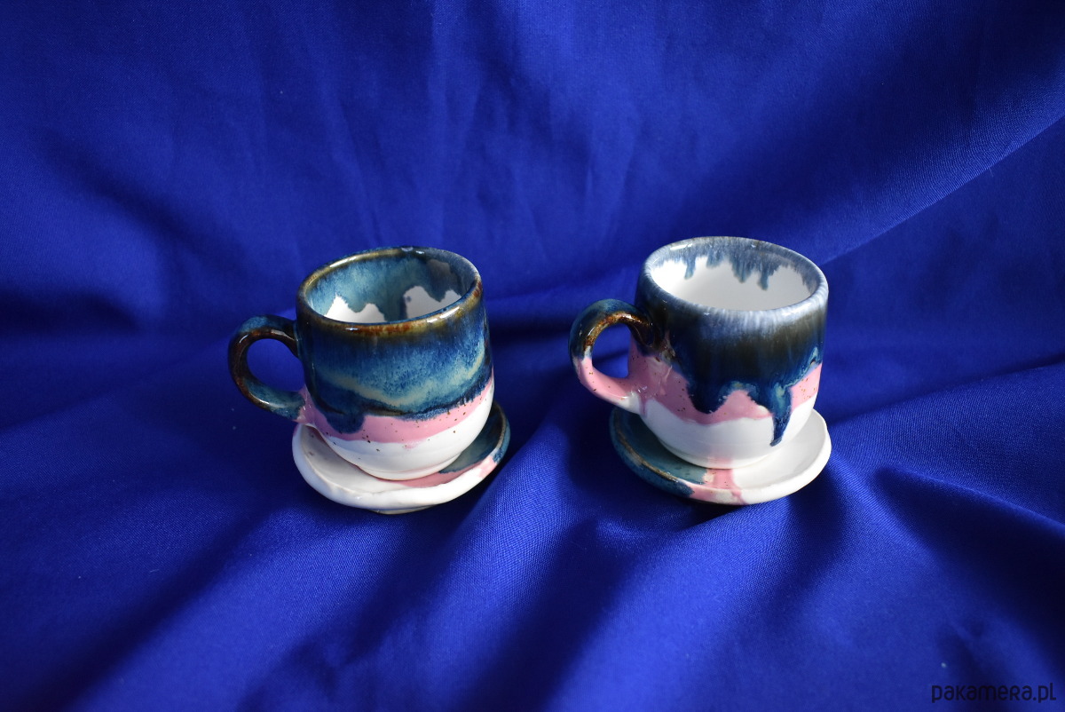 Dwie filiżanki ceramiczne ze spodkami w nieoczywistym zestawieniu bieli, kobaltu oraz różu.