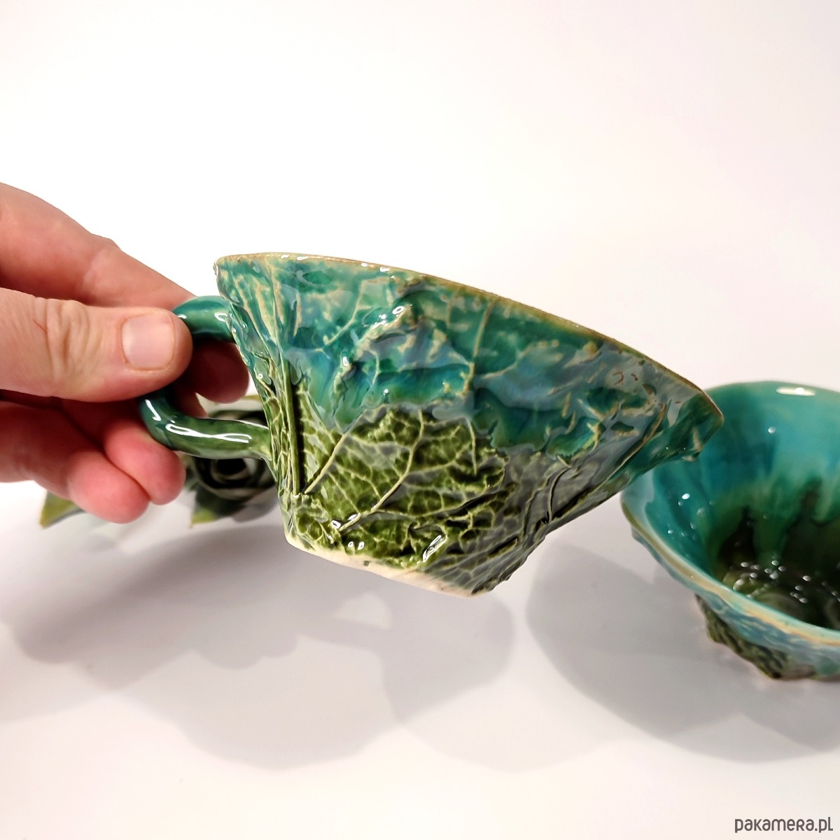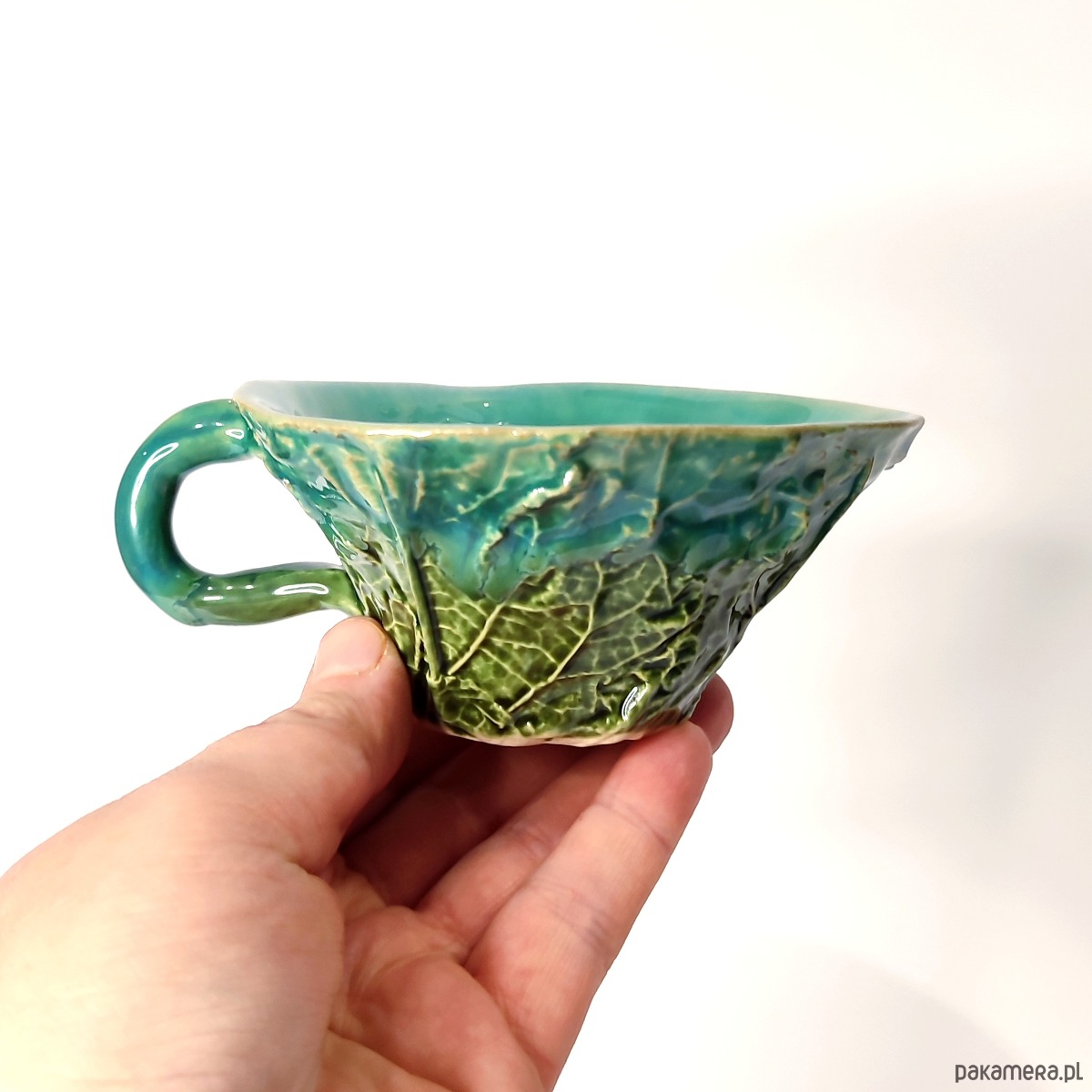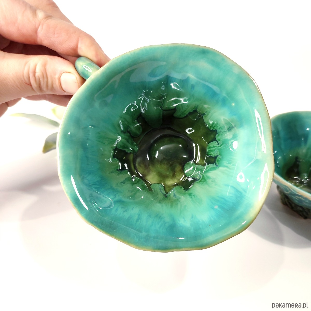 Kolorystyka: środek kubka ciemny zielony, zewnątrz zielony, rant kubka ściekające szkliwo turkusowo zielone.