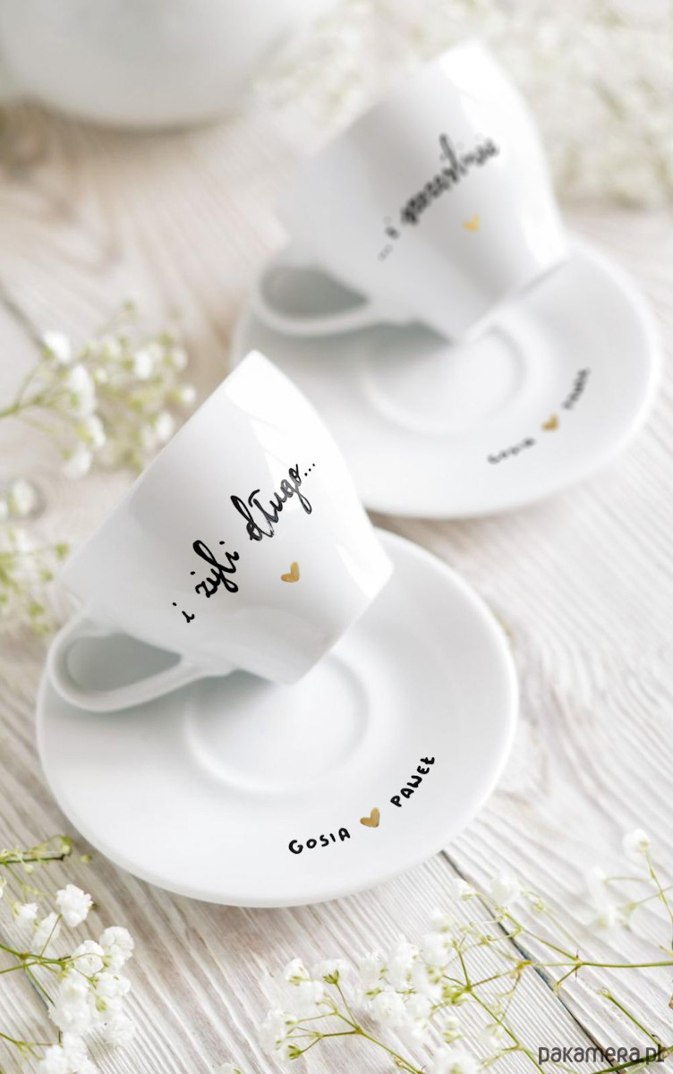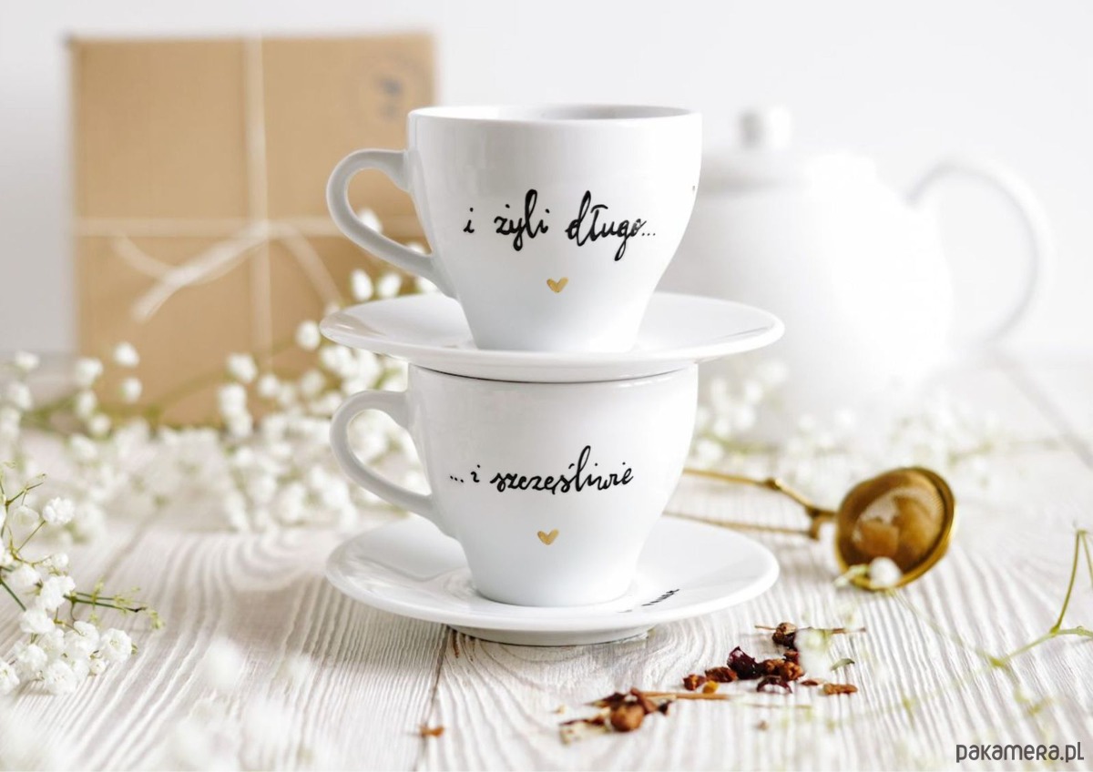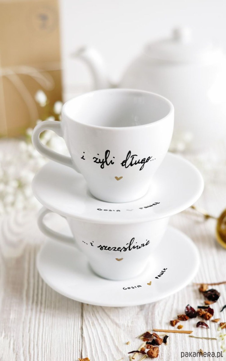 Dodatkowa personalizacja : W cenie zestawu uwzględniona jest personalizacja imionami na spodkach filiżanek. Jeśli chcesz, możemy dodatkowo dopisać dowolny krótki tekst (do 6 słów) na ściance filiżanki, po przeciwnej stronie rysunku. Ta opcja jest dodatkowo płatna, więc dodaj do koszyka produkt PERSONALIZACJA KUBKA dostępny w naszym sklepie.