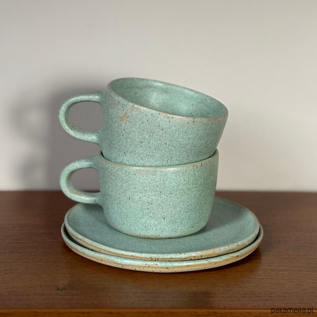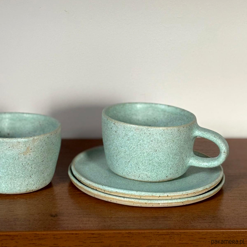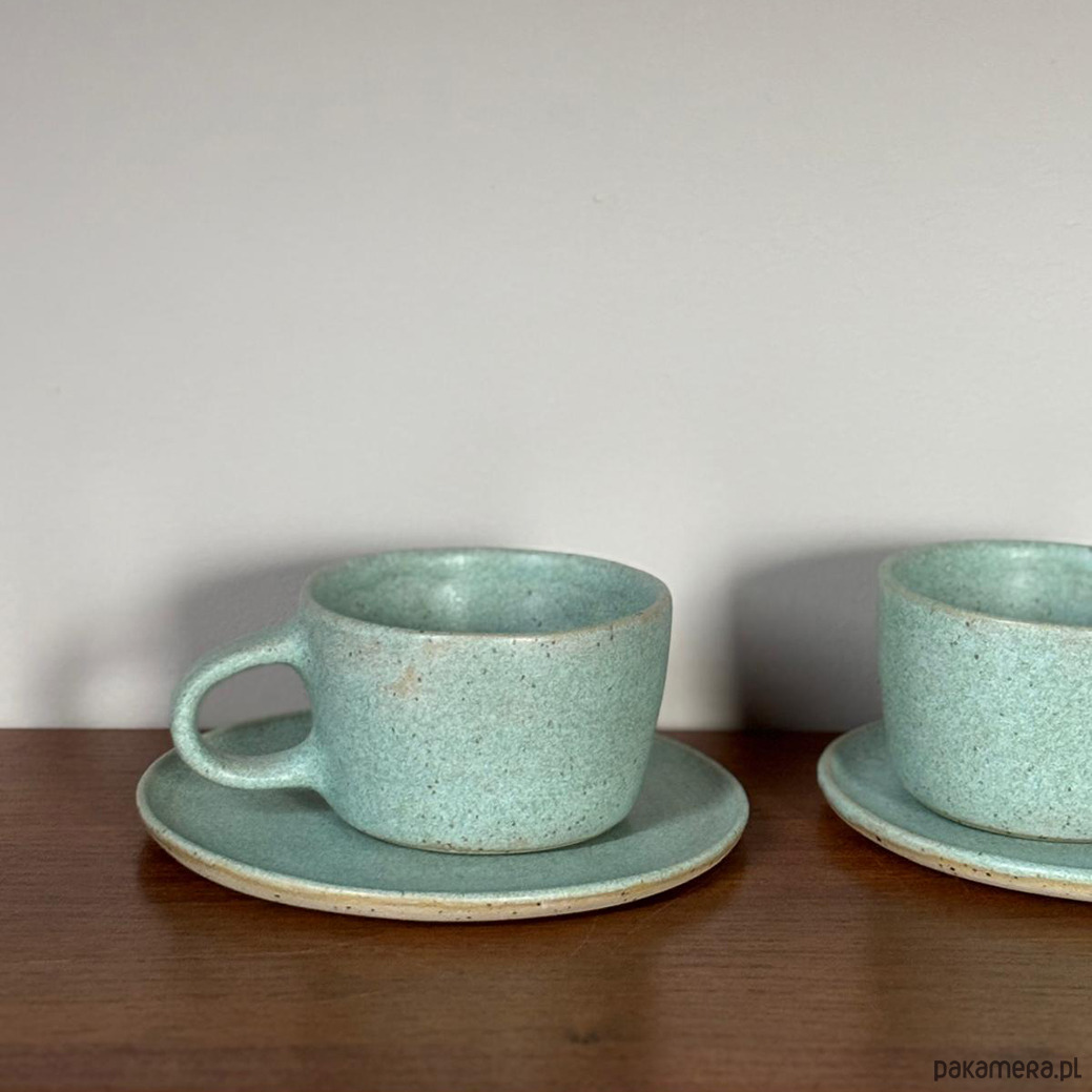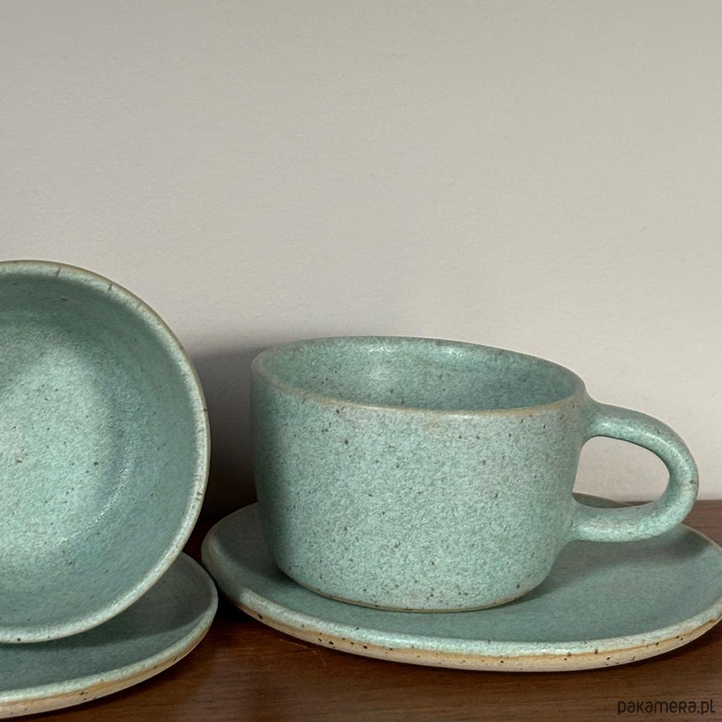 Filiżanka miętowa lepiona na kole z jasnej gliny.