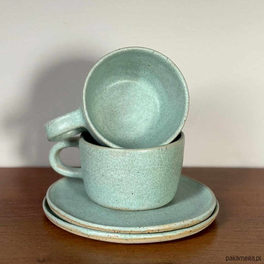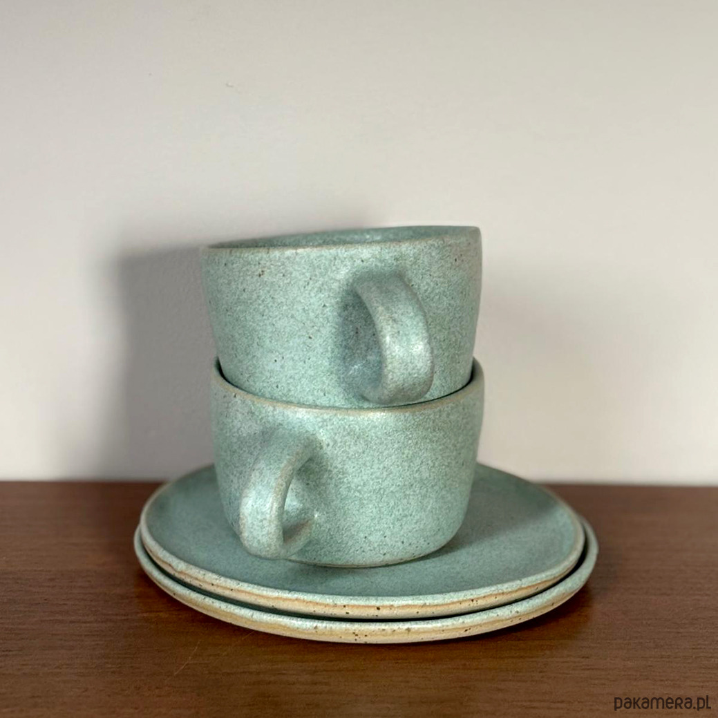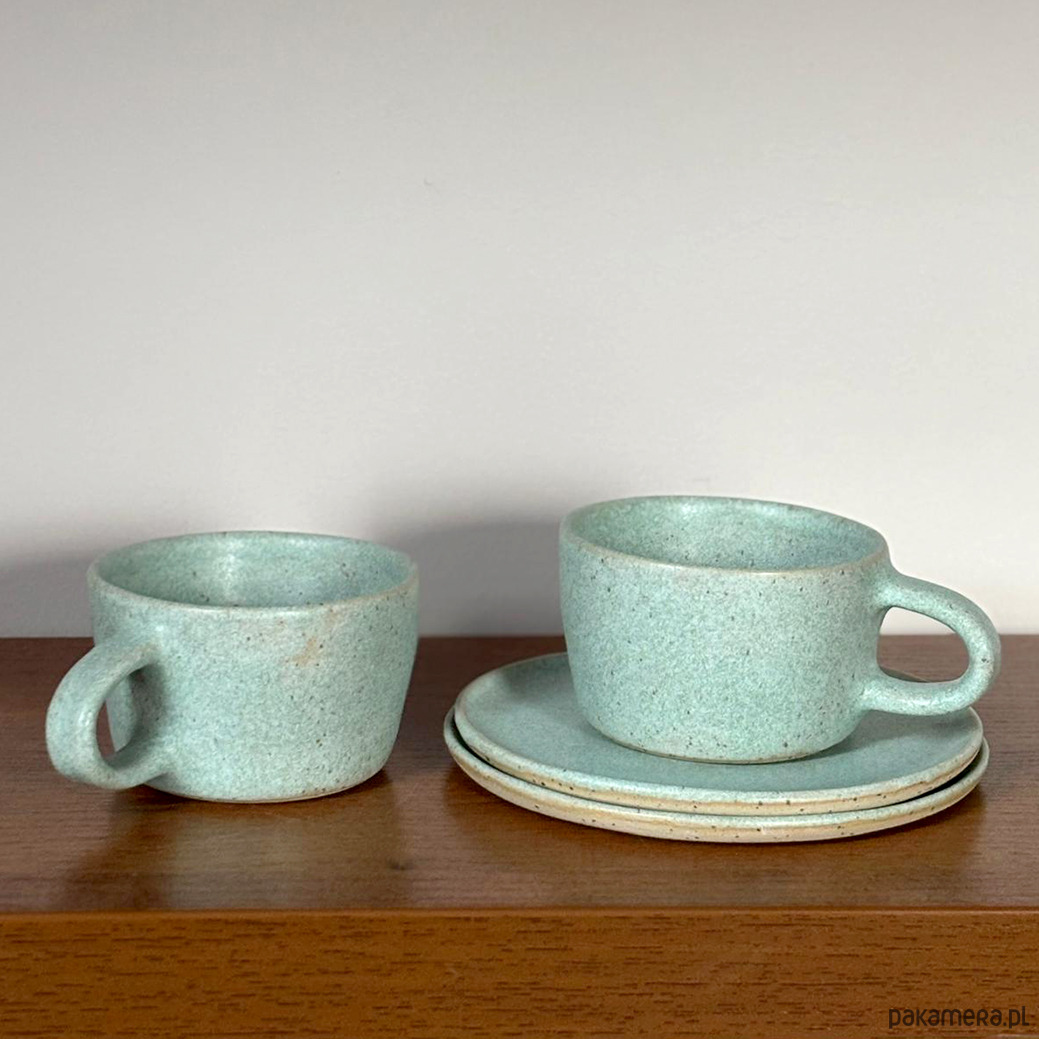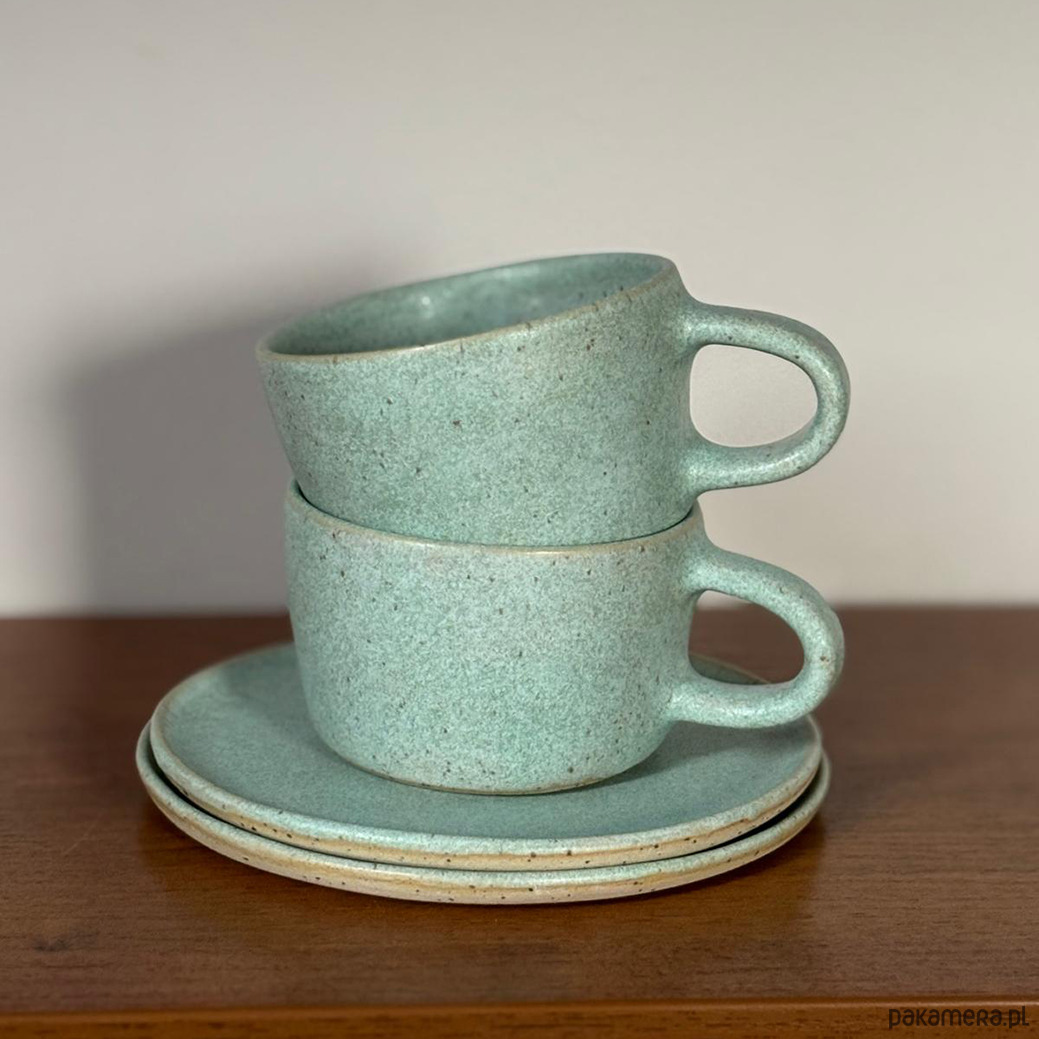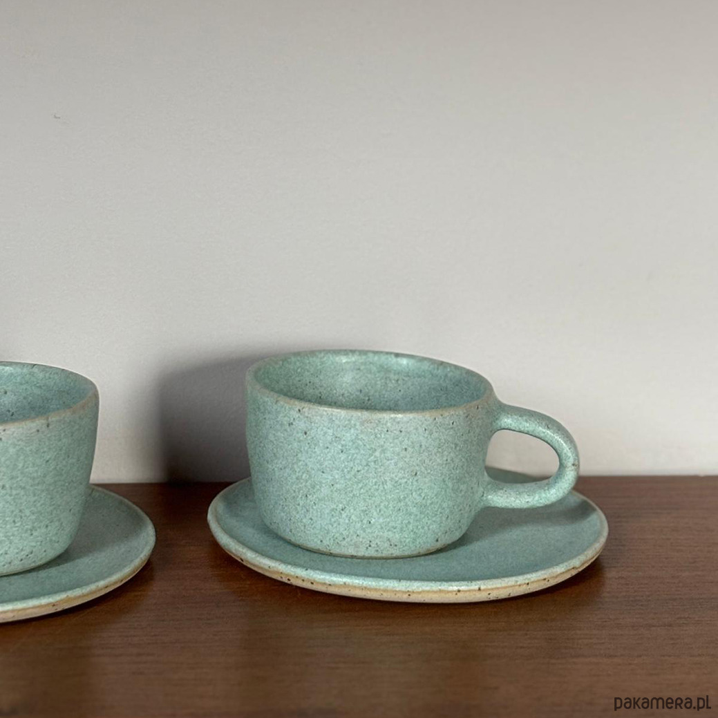Filiżanka miętowa lepiona na kole z jasnej gliny.