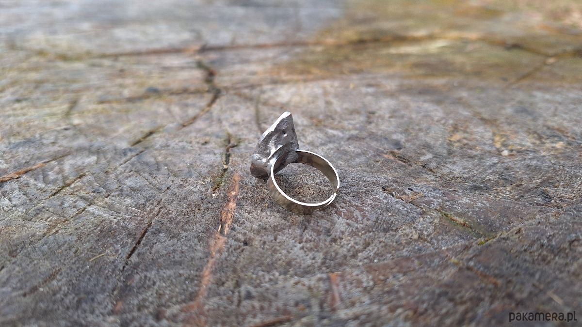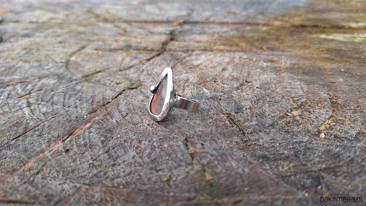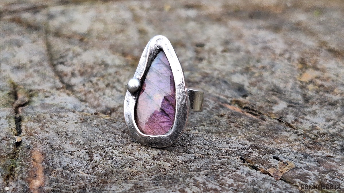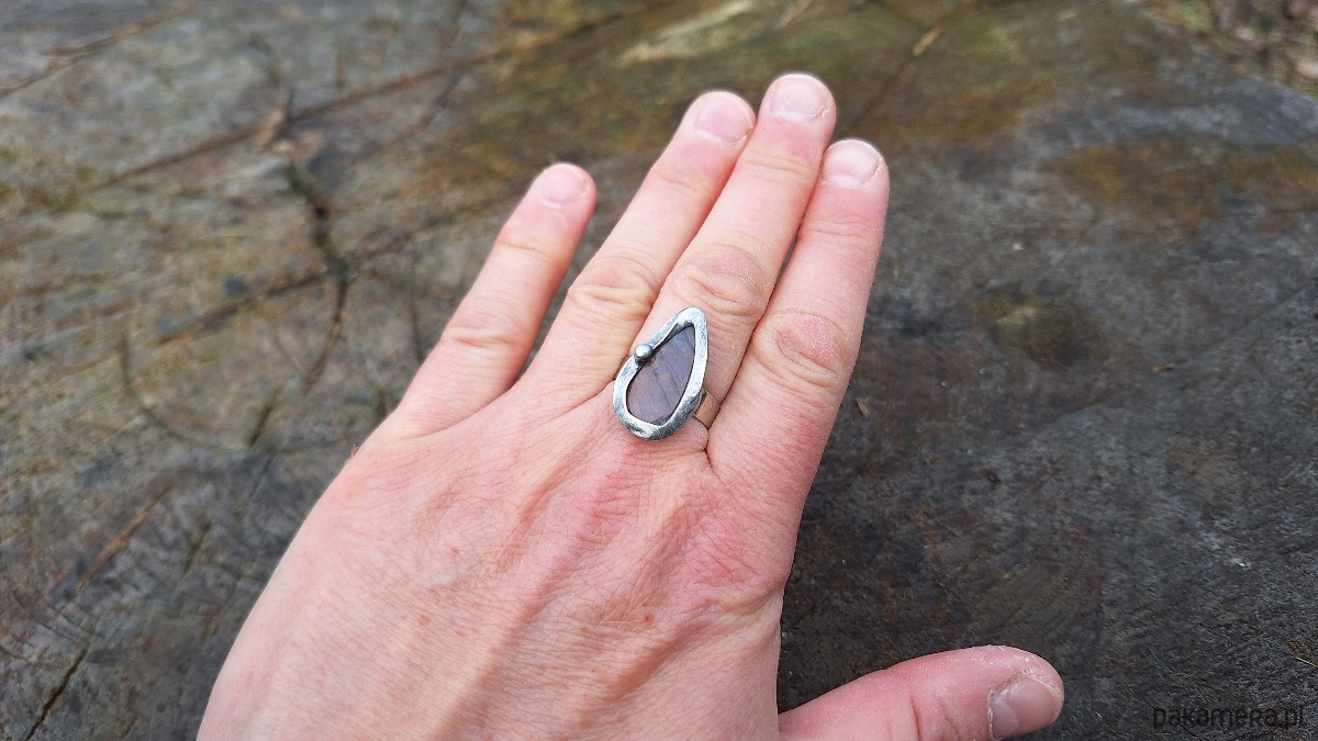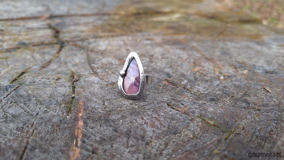 Pierścionek wykonany z miedzi, cyny i labradorytu. Wymiary ok. 2.3 na 1.7 cm. Regulowany. Nie jest ciężki.