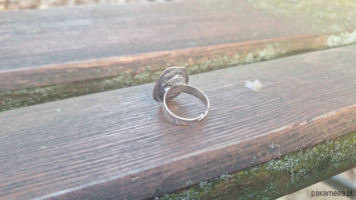 Pierścionek wykonany z miedzi, cyny i jadeitu. Wymiary ok. 2 na 1.5 cm. Regulowany. Nie jest ciężki.