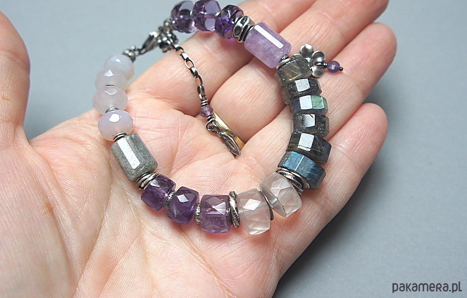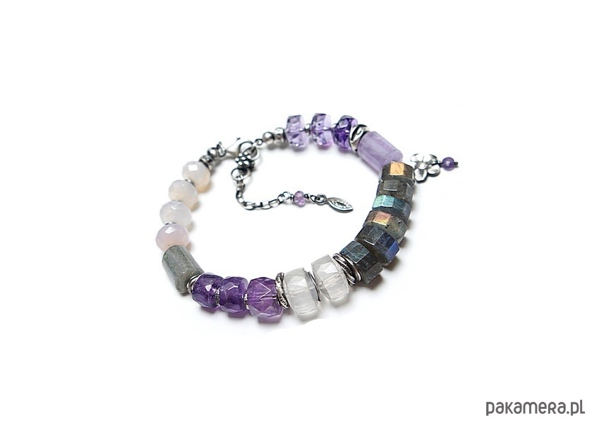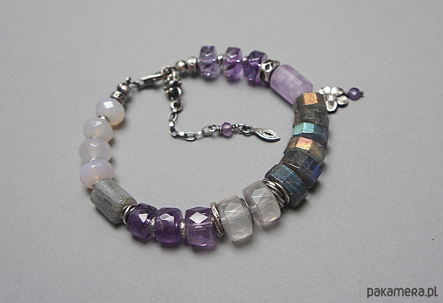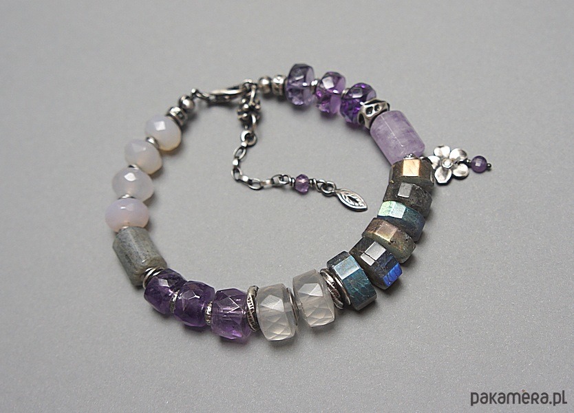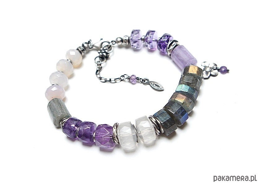 Bransoletka wykonana ze srebra [pr. 925] w połączeniu z minerałami: fasetowane walce ametystów [9mm -10mm], walce labradorytów [10-12mm], walce kwarców różowych [12mm], walec ametystu lawendowego [11mm x 9mm], walec labradorytu [12mm x 9mm], fasetowane oponki kwarców [10mm] oraz srebrnym kwiatuszkiem. Całość oksydowana i przetarta. Całkowita długość bransoletki 20,5cm plus dodatkowe oczko. Pasuje na nadgarstek 17-18cm. Biżuteria ozdobnie zapakowana . Ostatni egzemplarz z tej kolekcji .