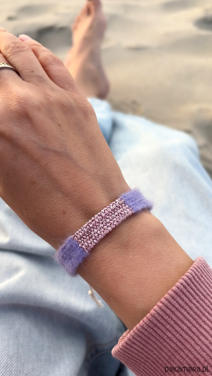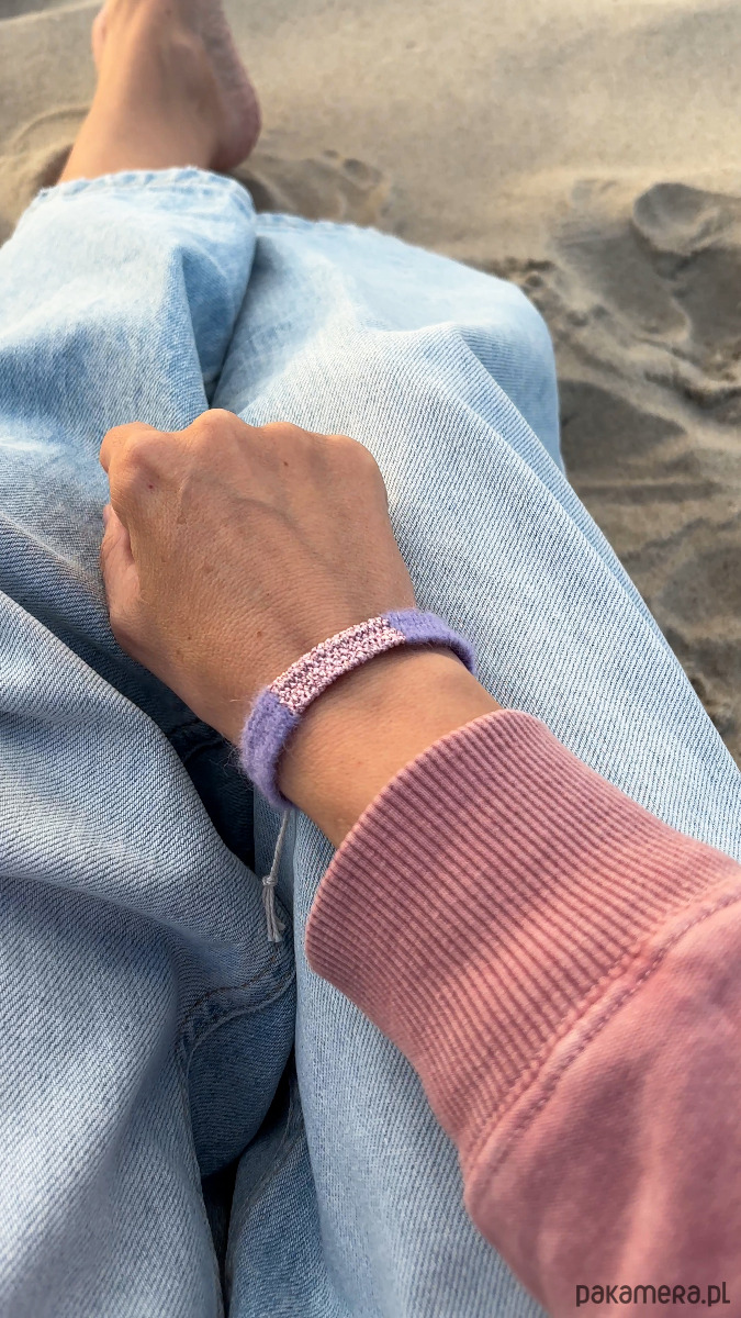 Bransoletka w przepięknym odcieniu fioletu z błyszczącą nicią, ręcznie robiona. Bransoletka ma około 1 cm szerokości, długość części tkanej to około 14, 15 cm. Dochodzą sznureczki do samodzielnego wiązania na supełek. Lekka, oryginalna bransoletka idealna na ciepłe dni 💛. Polecam serdecznie.