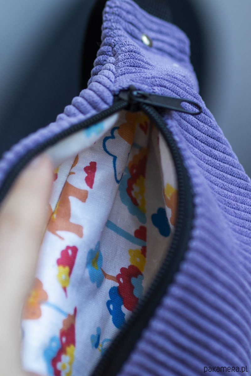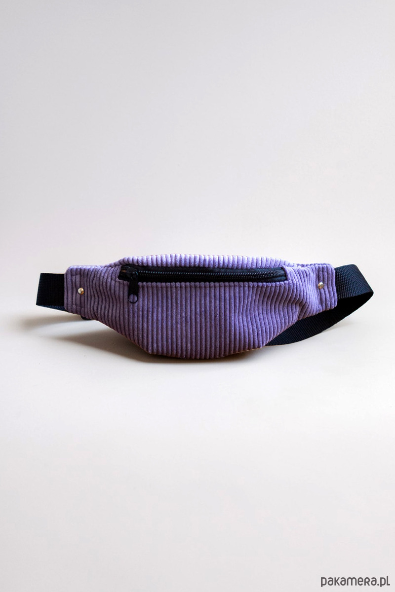 Mała saszetka, torebka biodrowa, nerka dla dziecka wykonana z cienkiego sztruksu w kolorze fioletowym. Zapinana na suwak.