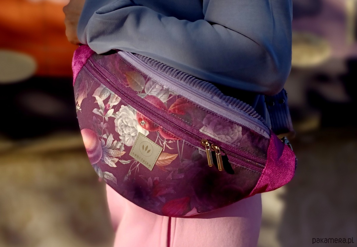 Bardzo duża nerka torebka damska z motywem fig i kwiatów na fioletowym tle.