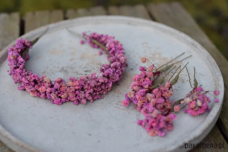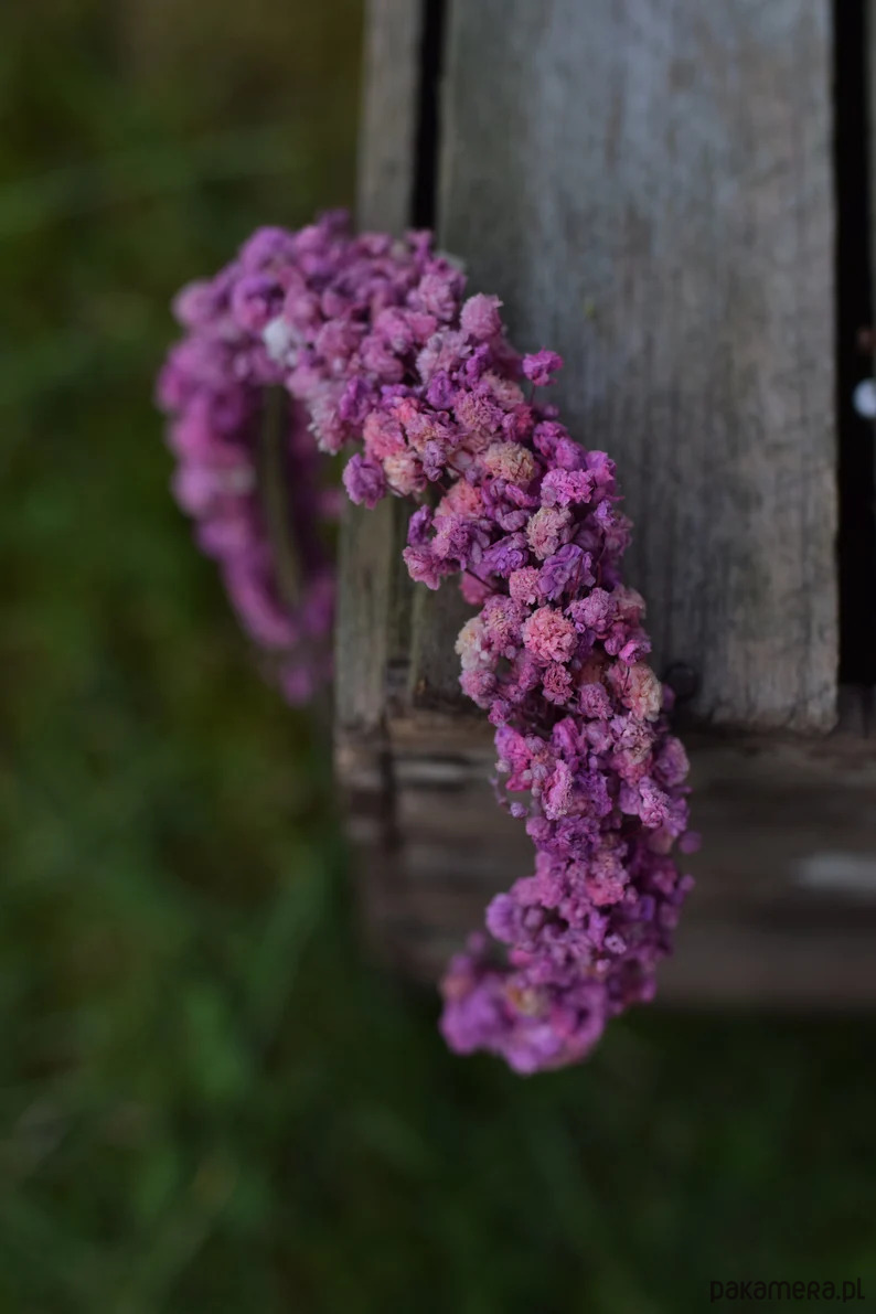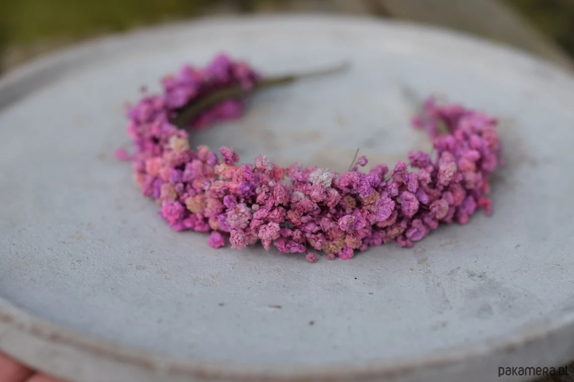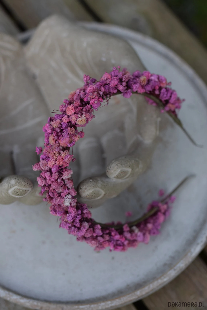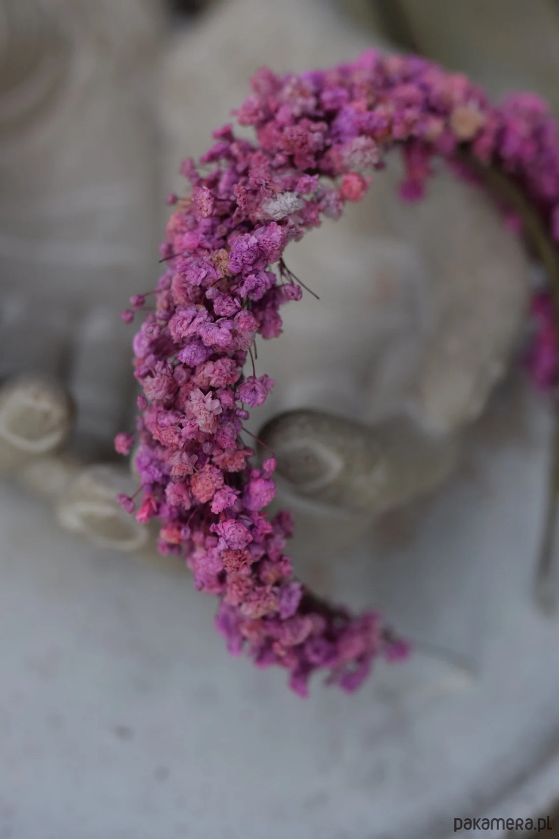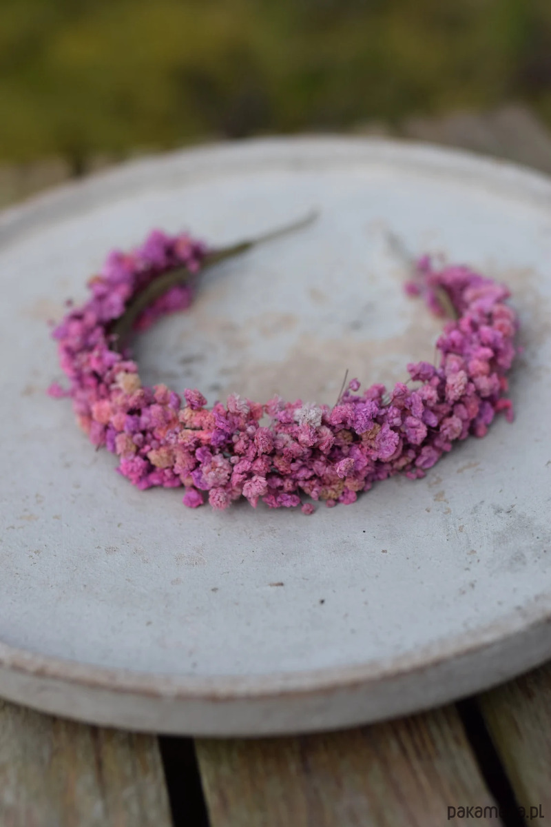 Rustykalna, unikatowa opaska na głowę z stabilizowanej gipsówki w cieniowanym, fioletowym kolorze