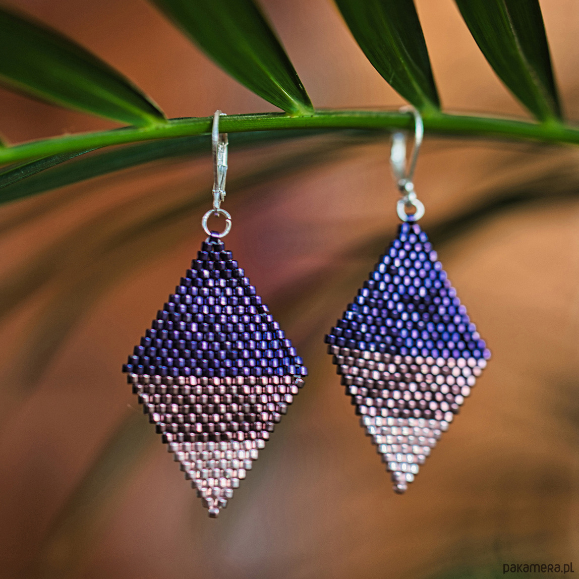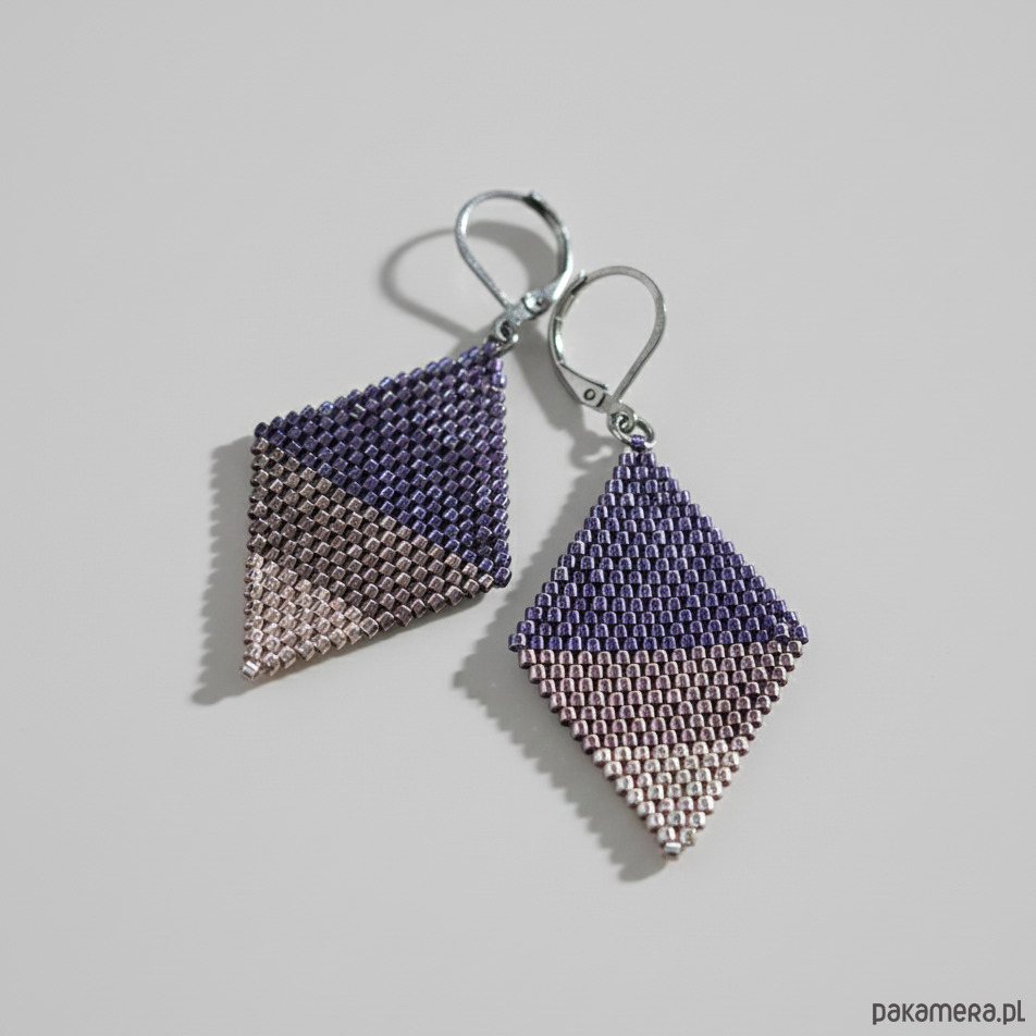 Te wyjątkowe kolczyki w kształcie rombów zostały wykonane techniką brick stitch z użyciem japońskich koralików Miyuki. Kolczyki prezentują piękny metaliczny odcień, który przyciąga uwagę. Technika brick stitch pozwala na dokładne ułożenie koralików, tworząc geometryczne wzory. Romby to elegancki i niezwykle modny kształt, który dodaje kolczykom wyjątkowego charakteru.