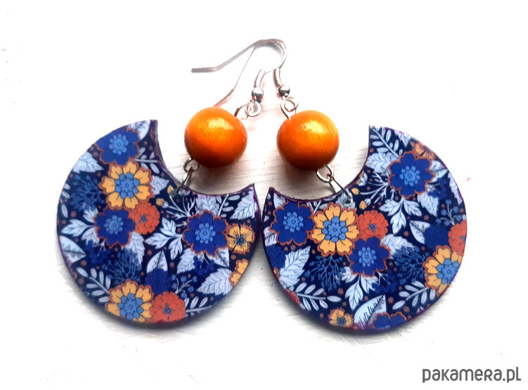 kolczyki drewniane, ozdobione metodą decoupage, dwustronne, starannie wykończone farbami akrylowymi i zabezpieczone wielokrotnie lakierem, koraliki drewniane, bigle posrebrzane, długość kolczyków bez bigli: 5 cm, średnica: 4 cm, bardzo lekkie