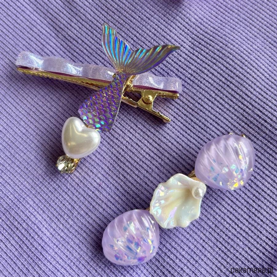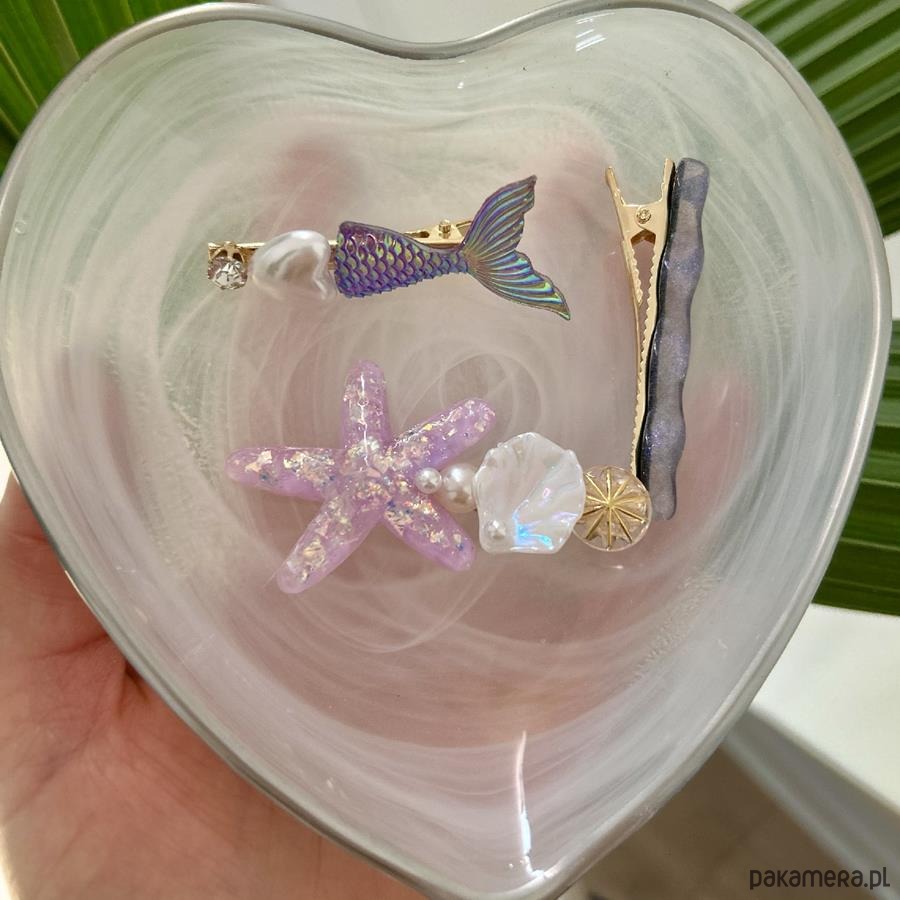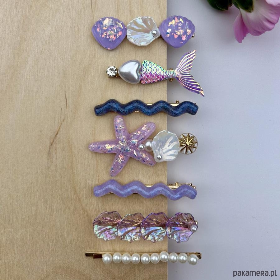 Spinki klamerki 6 sztuk – dobrze trzymające włosy spinki, zapinane jak żabki. Wszystkie spinki swoimi kolorami oraz kształtami przypominają kolorowe dno oceanu. Jedna z nich to prawdziwy syreni ogon! Ozdoby do włosów posiadają wiele błyszczących jak i modnych elementów, które dodadzą Twoim włosom elegancji i tajemniczości.
