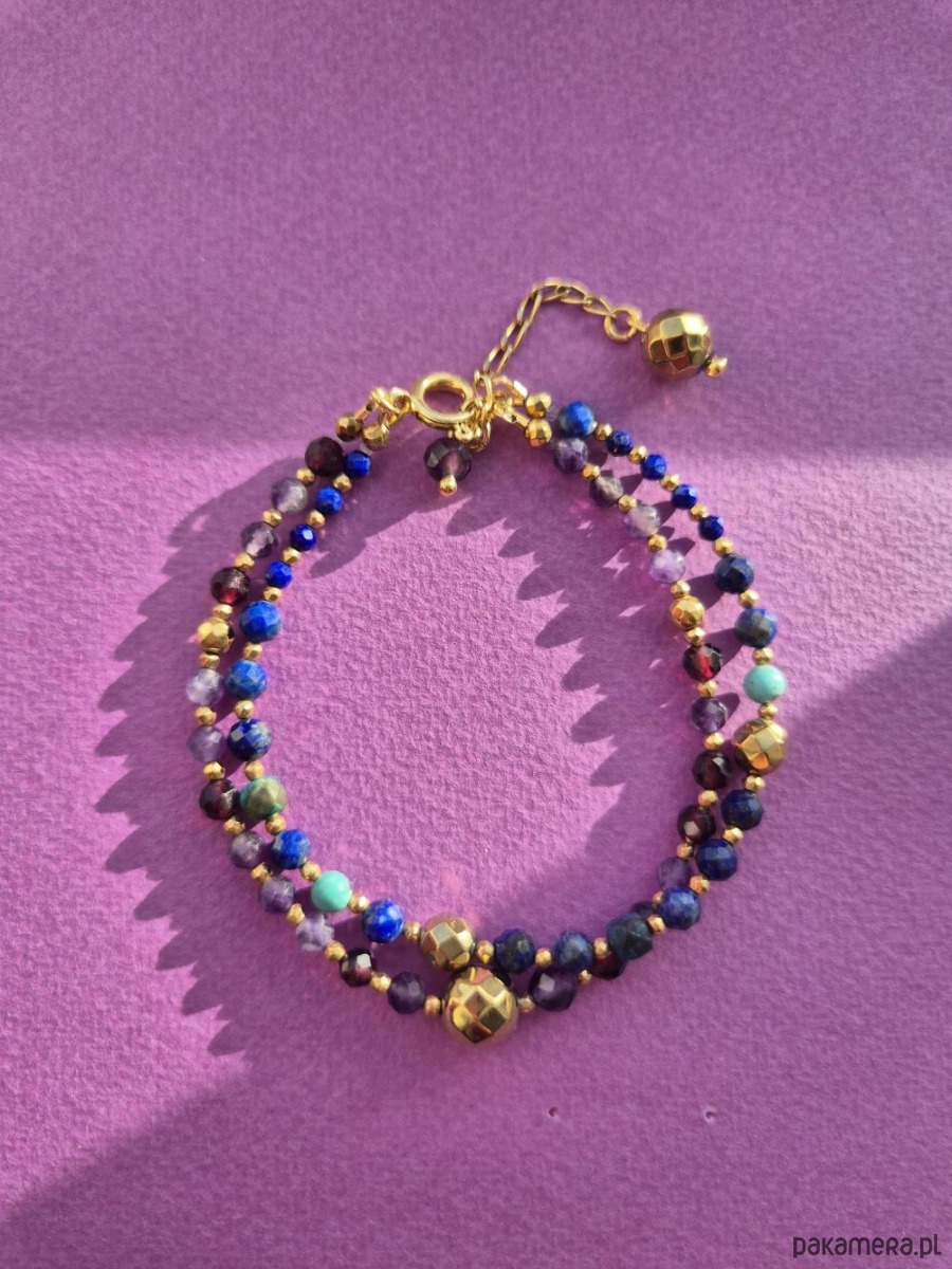 Jeden rząd zbudowany jest z ametystów, granatów i złotych hematytów – to zestawienie głębi, pasji i elegancji. Drugi rząd tworzą lapis lazuli i turkusy, które wnoszą lekkość, spokój i odrobinę nieba zamkniętego w kamieniu. Bransoletka zakończona jest złotym łańcuszkiem z drobnymi zawieszkami z hematytu i ametystu – niczym gwiezdne iskry dopełniające kompozycję.