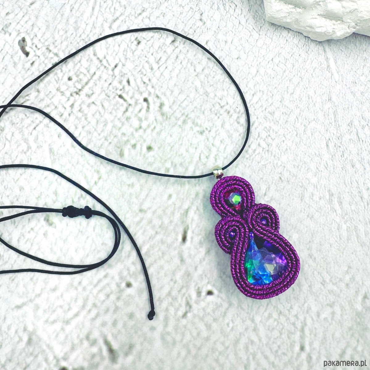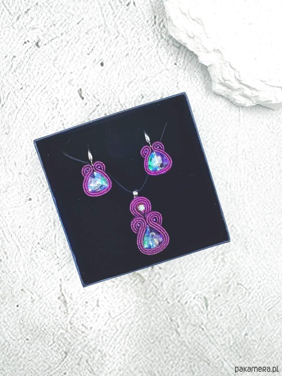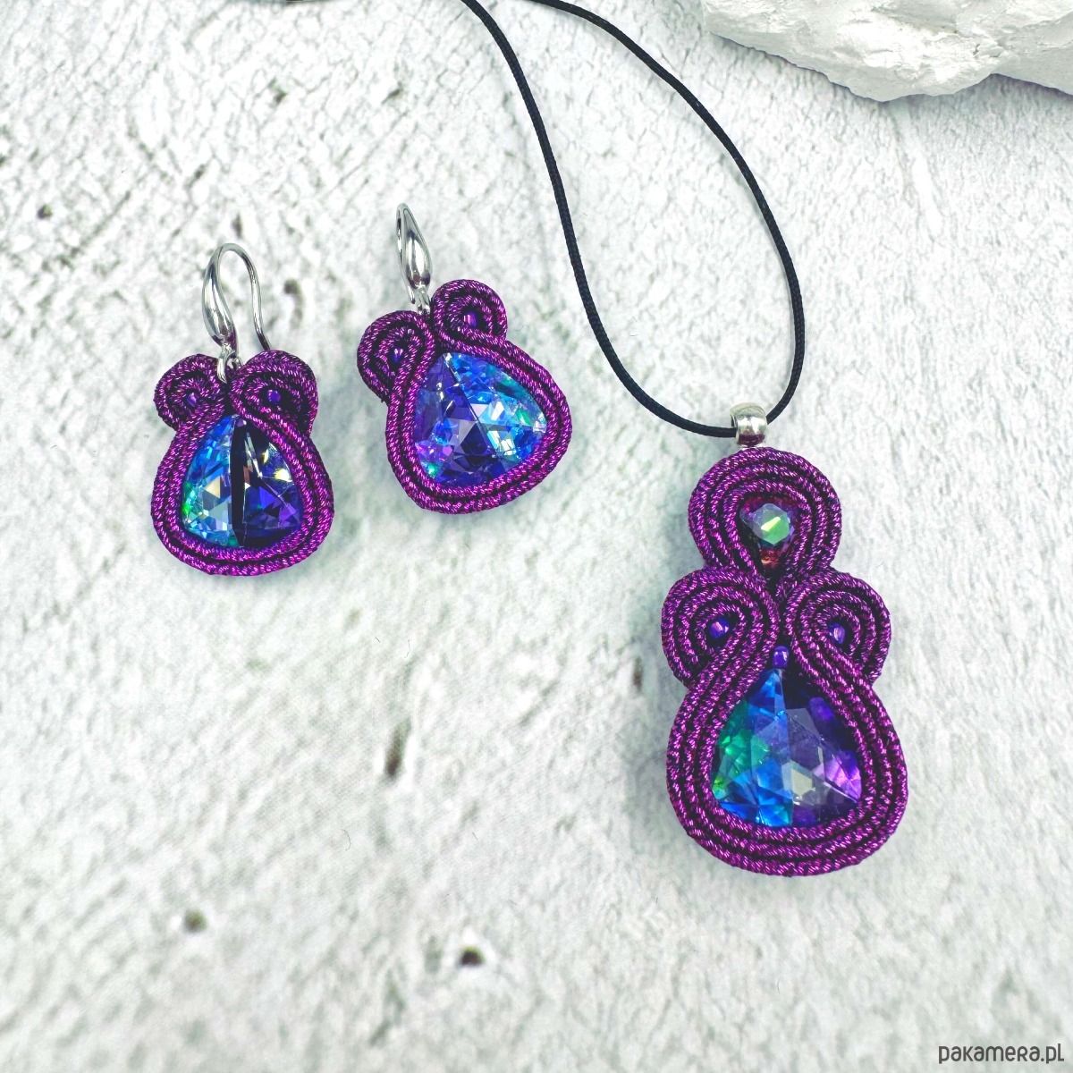 Efektowny komplet biżuterii sutasz w intensywnym, głębokim odcieniu fioletu z mieniącymi się kryształami o wielobarwnym połysku.