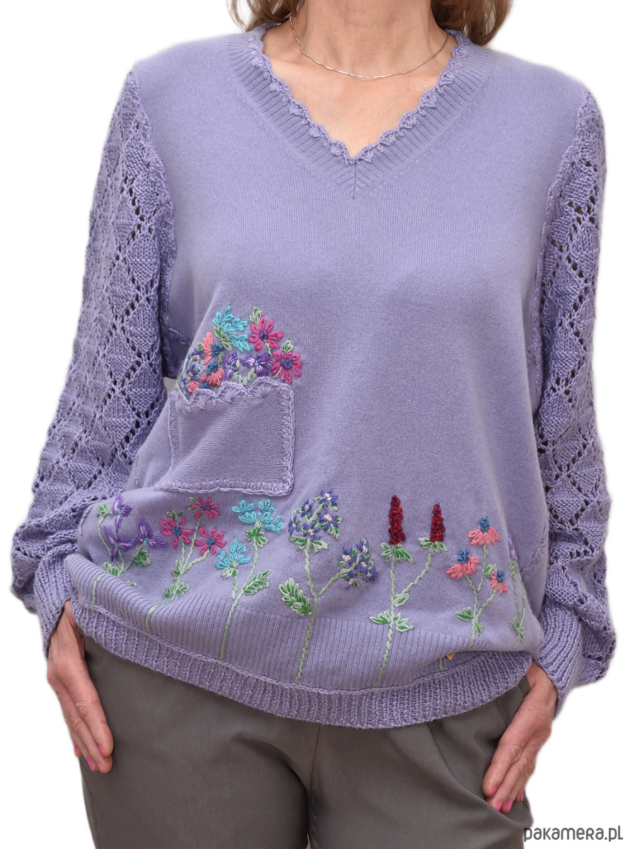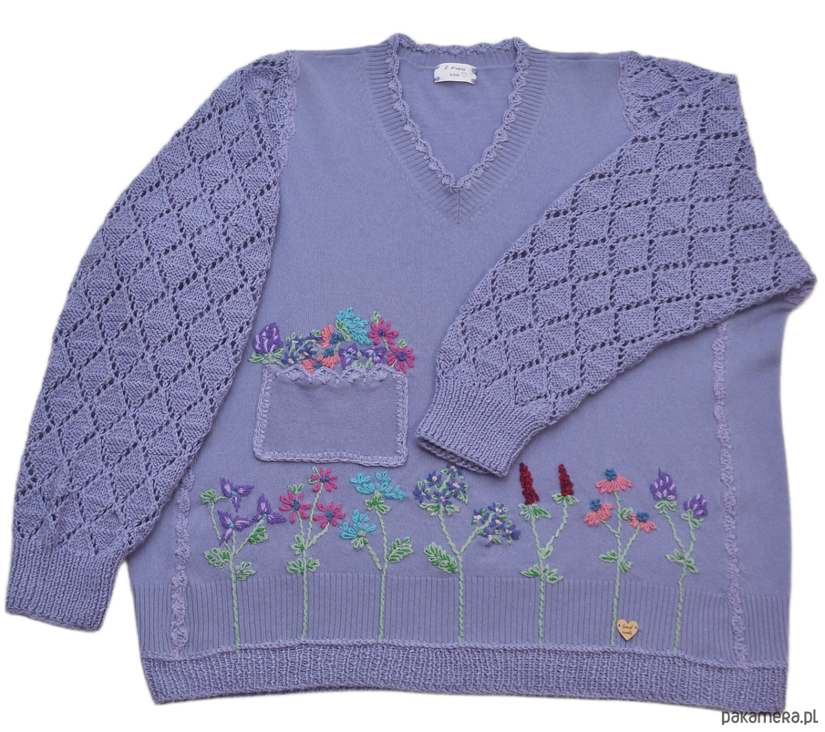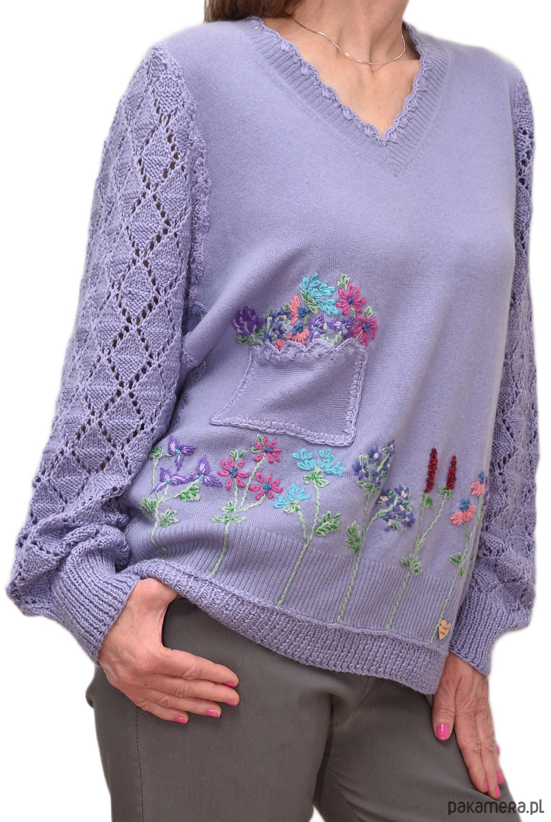 Sweter w kolorze niebieskolawendowym z kieszenią, haftami i ażurowymi rękawami, wykonany z sercem.