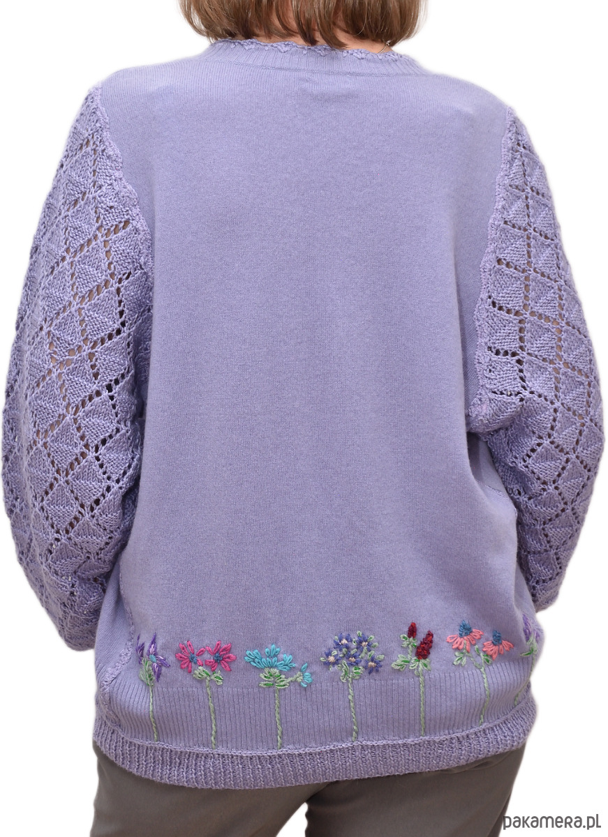 Fioletowy sweter z kaszmiru z haftami i ażurowymi rękawami XL/XXL