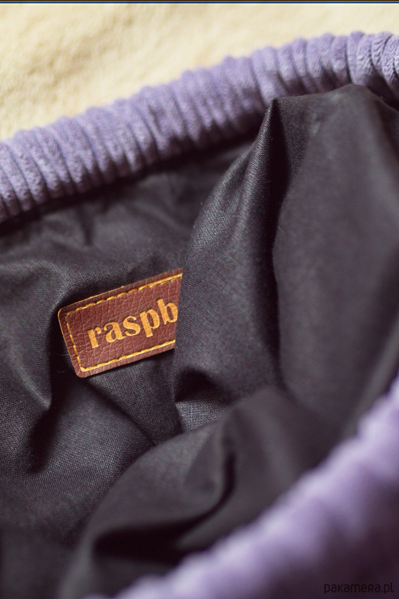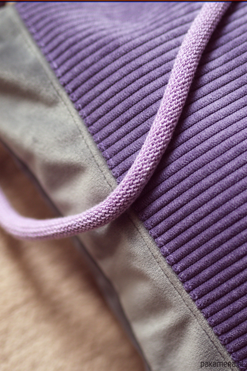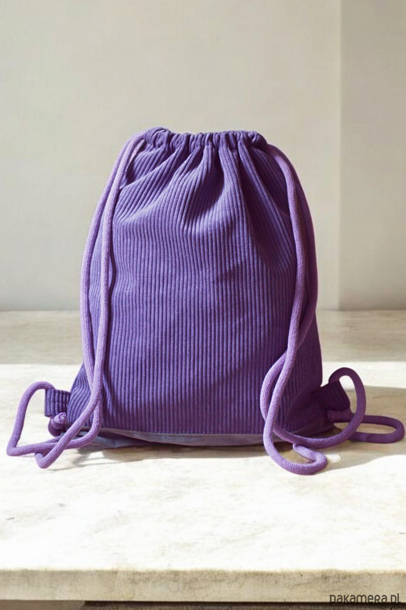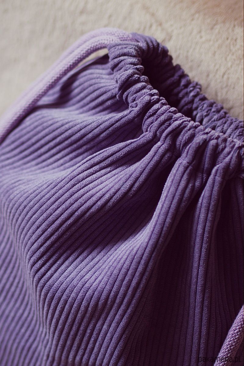 Plecak worek wykonany z cienkiego fioletowego sztruksu oraz szarego weluru.