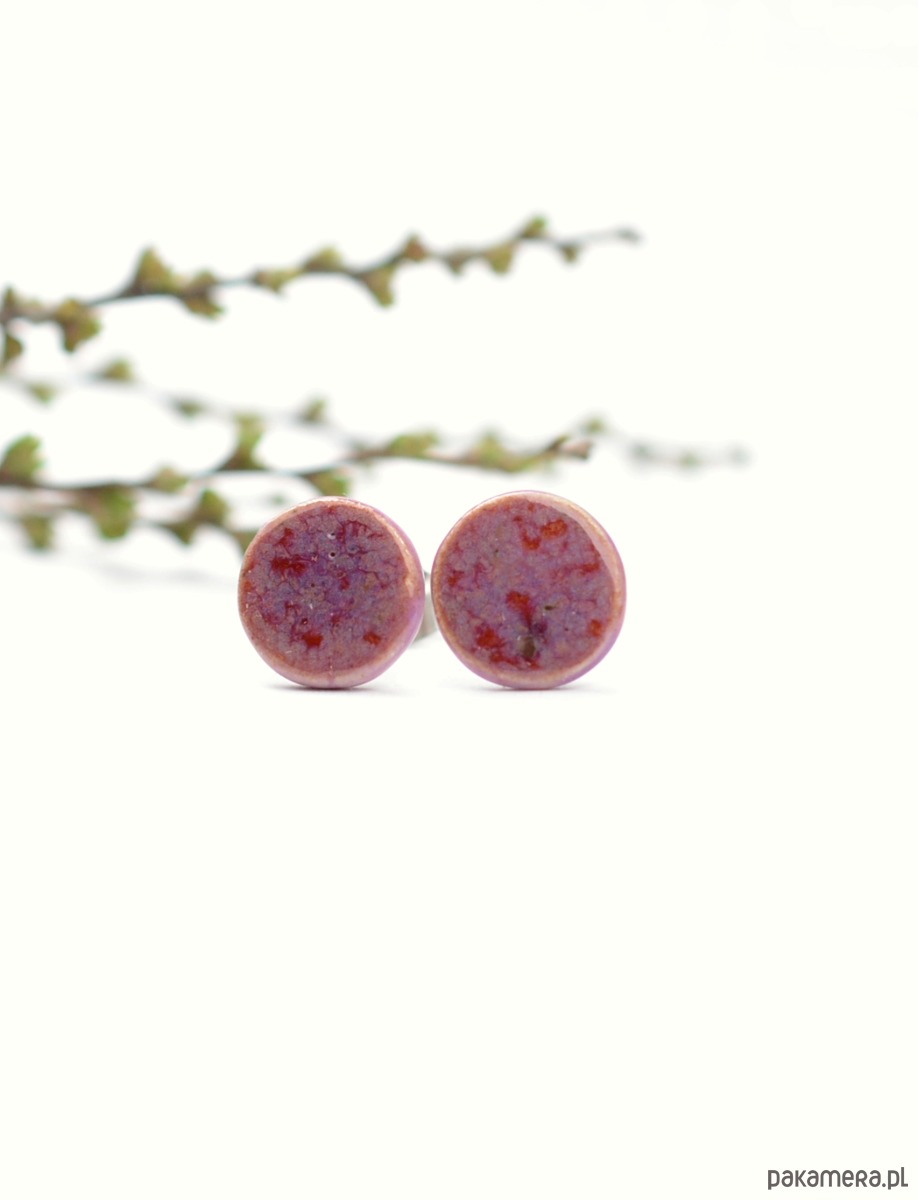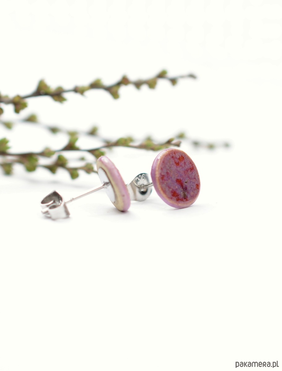 Kolczyki to ceramiczne kółeczka o średnicy 10mm i grubości 2mm. Elementy ozdobiłam bardzo efektownym szkliwem ,które łączy w sobie odcienie fioletu i różu. Boczne krawędzie również są poszkliwione w kolorze delikatnego fioletu.