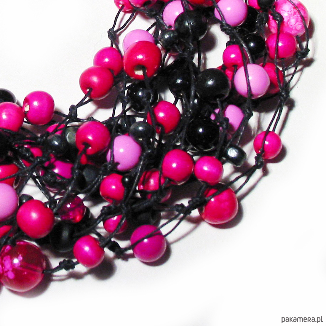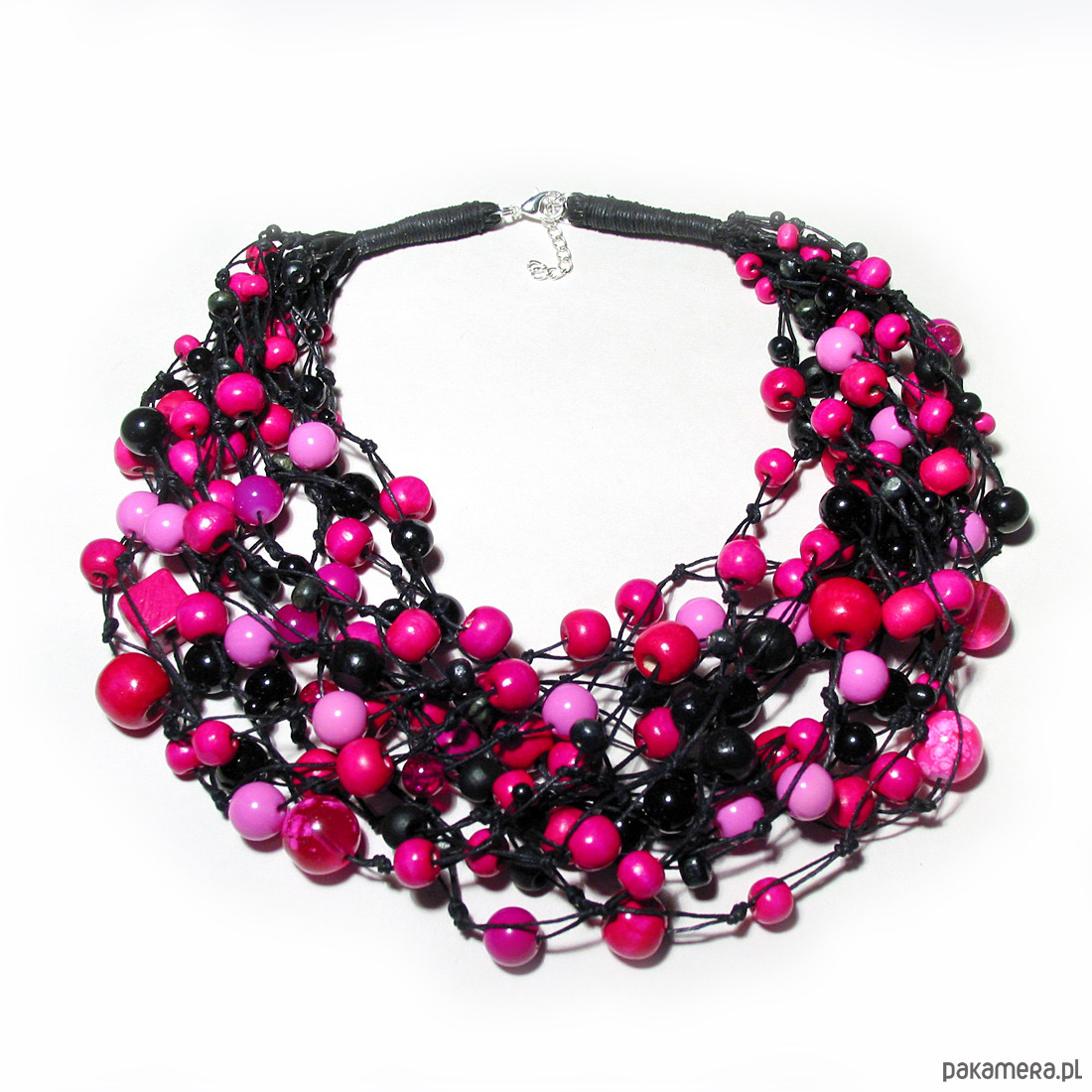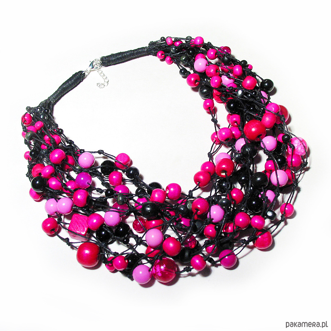 Wieczorowy naszyjnik wykonany na czarnej przędzy lnianej z elementów w tonacjach fuksji, zgaszonego różu i czerni.